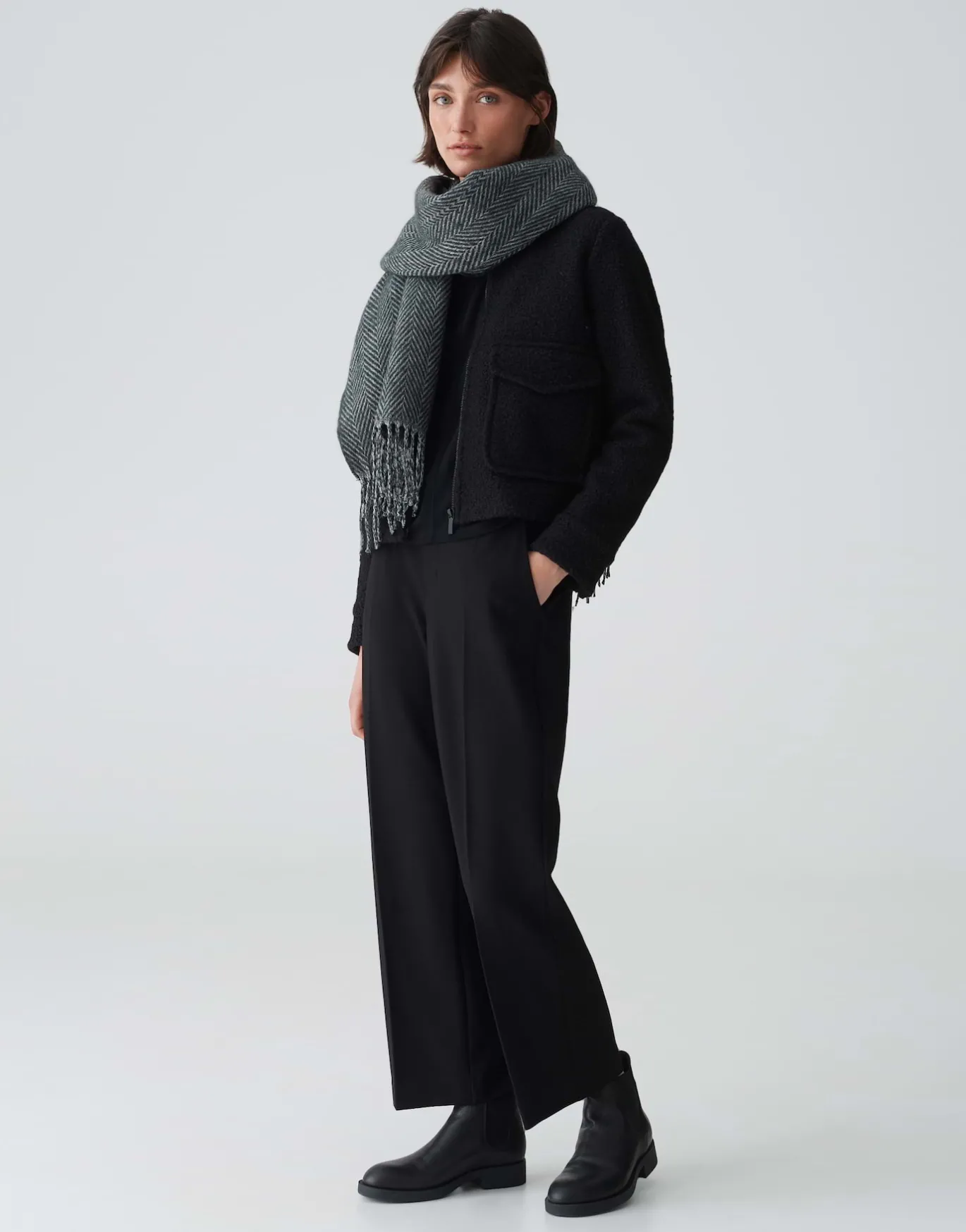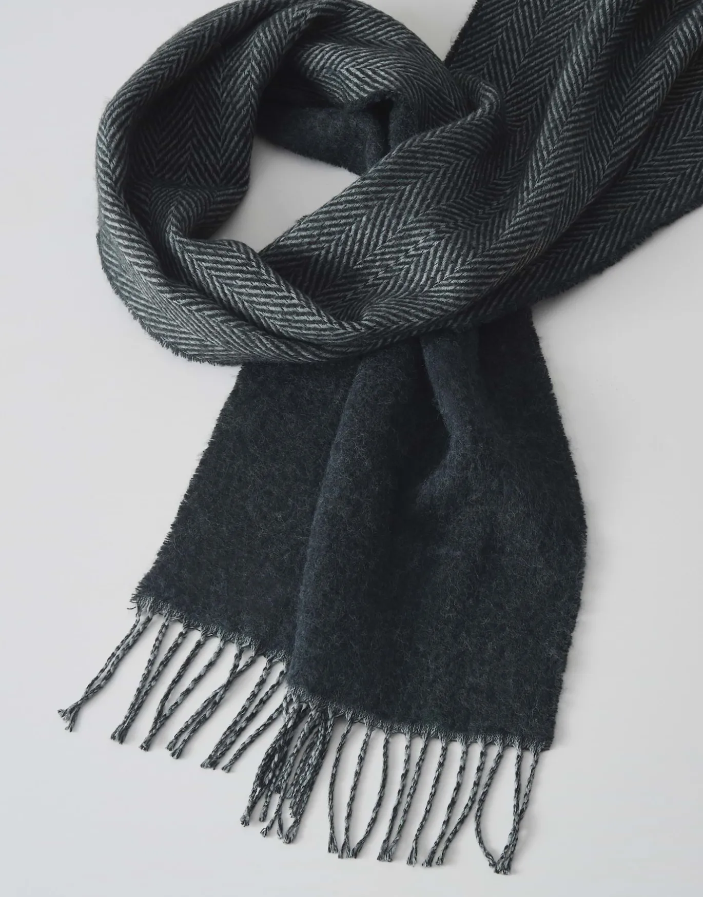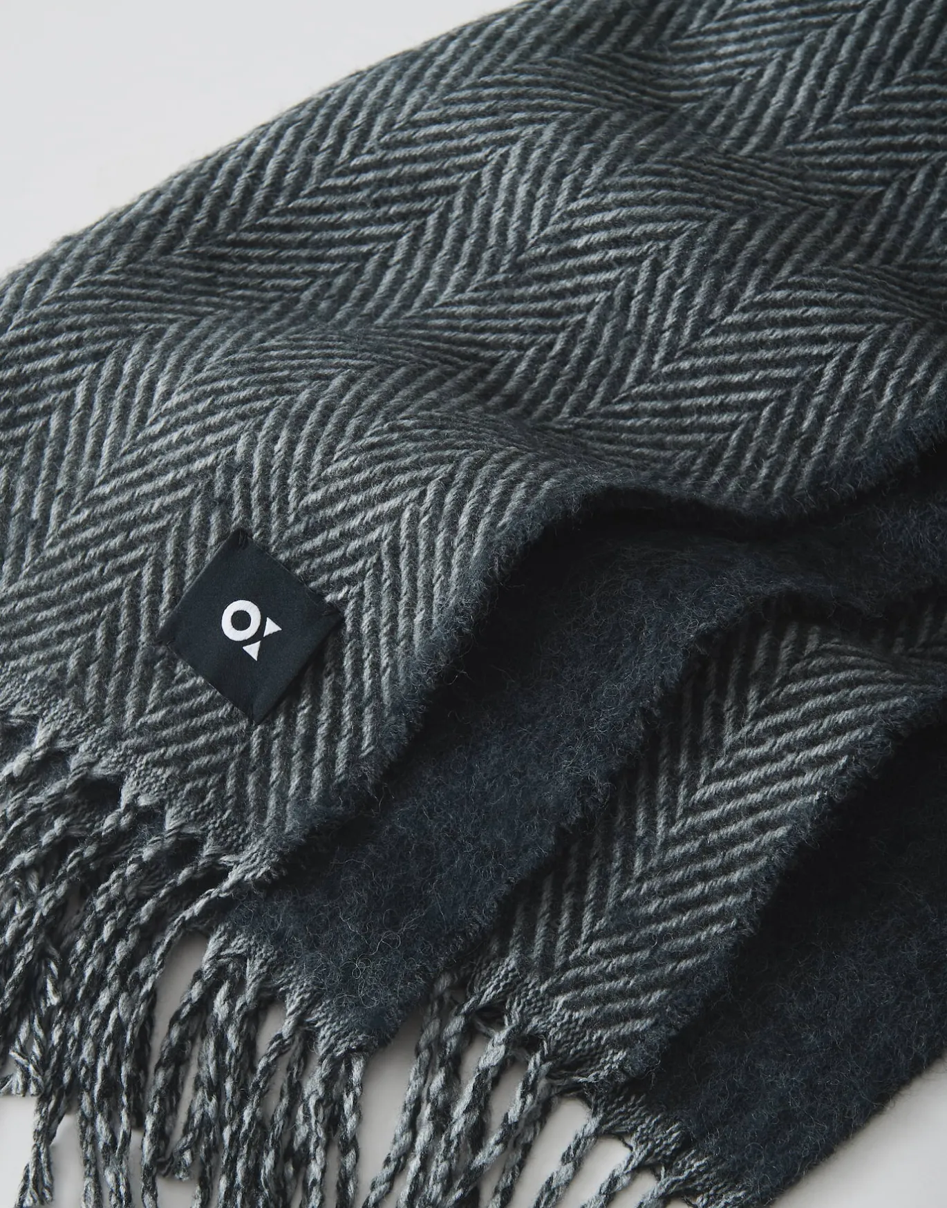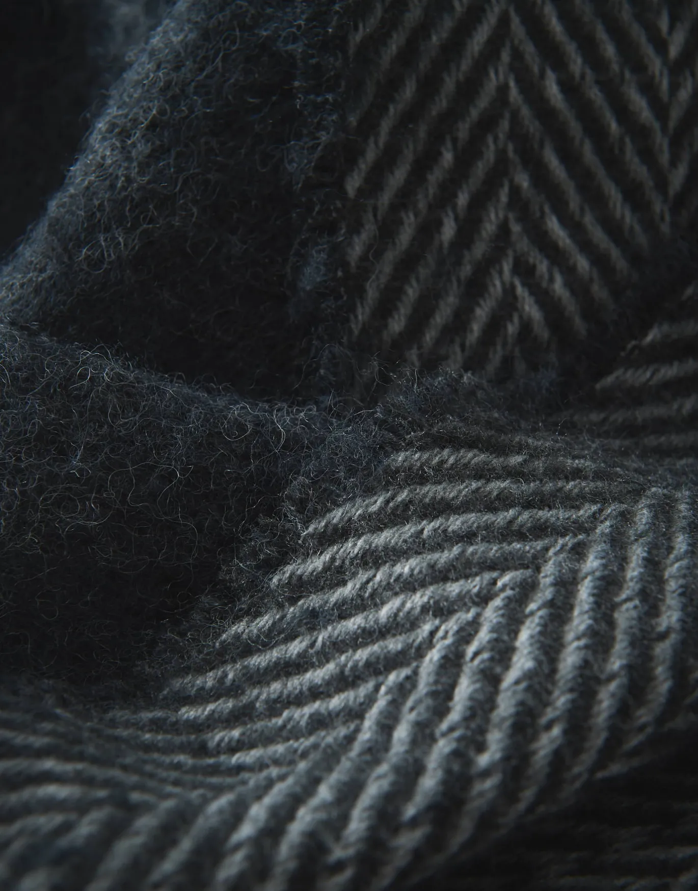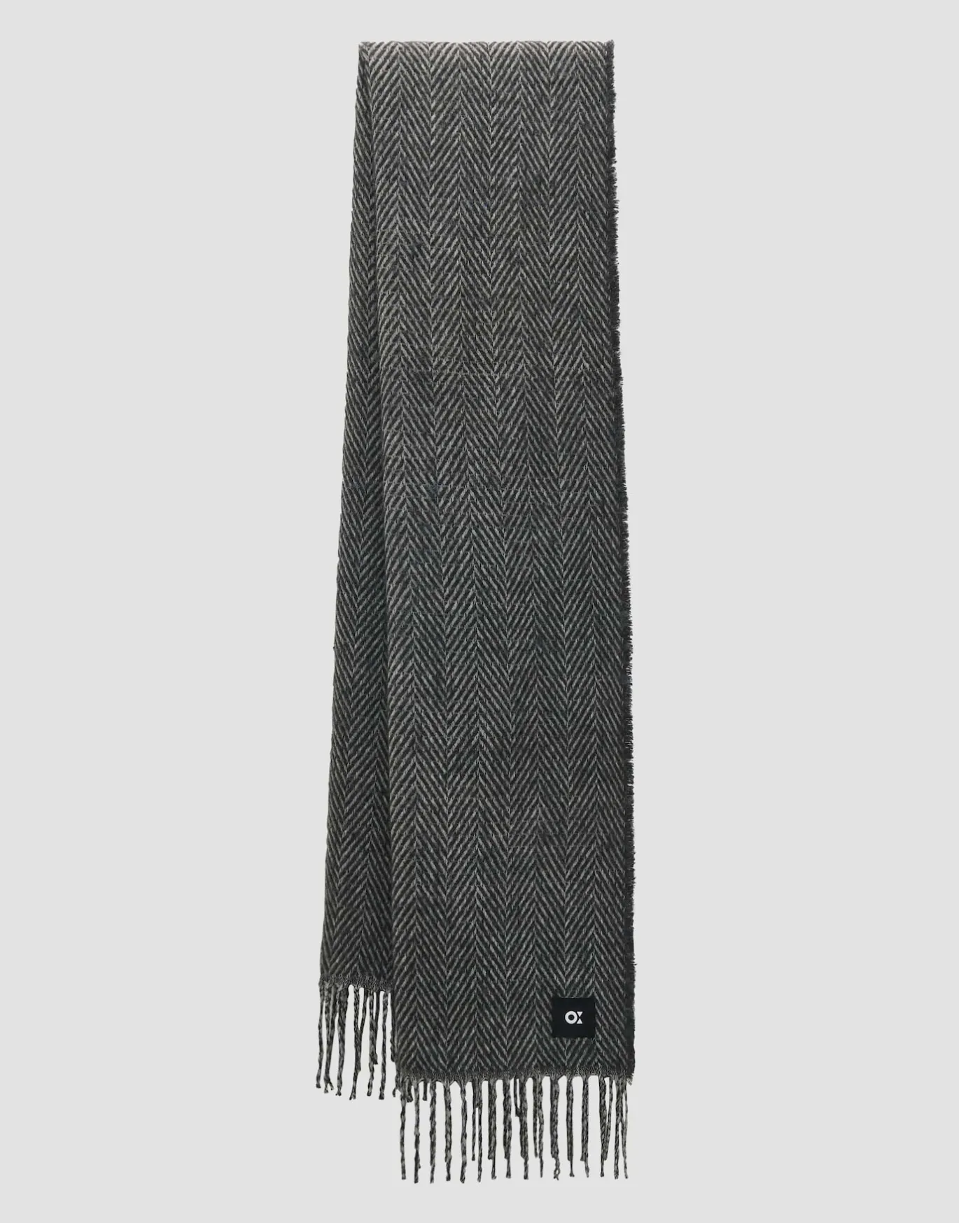 Der voluminöse Strickschal spielt mit unterschiedlichen Oberflächenoptiken und setzt auf ein klassisches Fischgrat Design – für einen stilvollen Herbstlook.