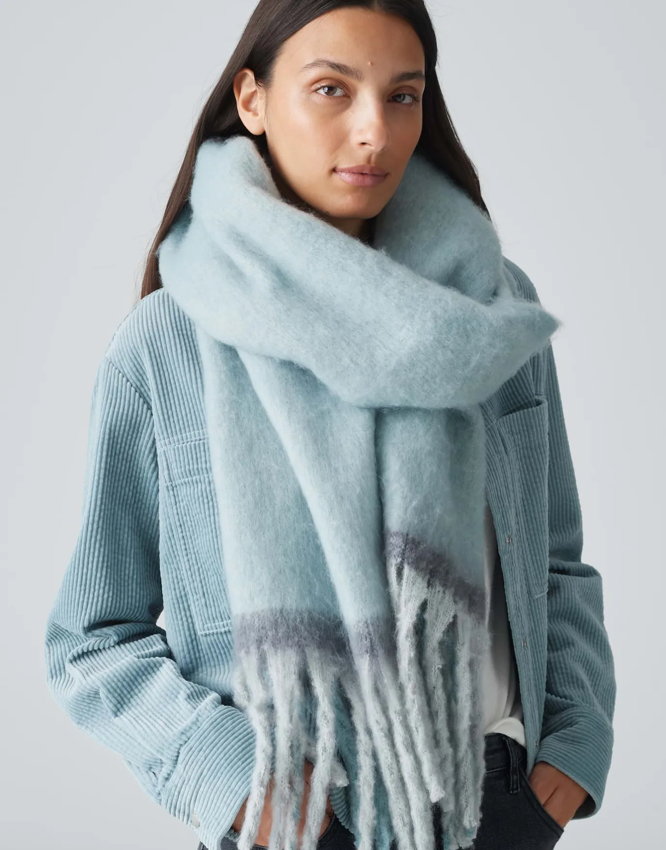 Der flauschige Oversize Schal bringt durch das moderne Color Blocking Design schöne Akzente in die Looks.