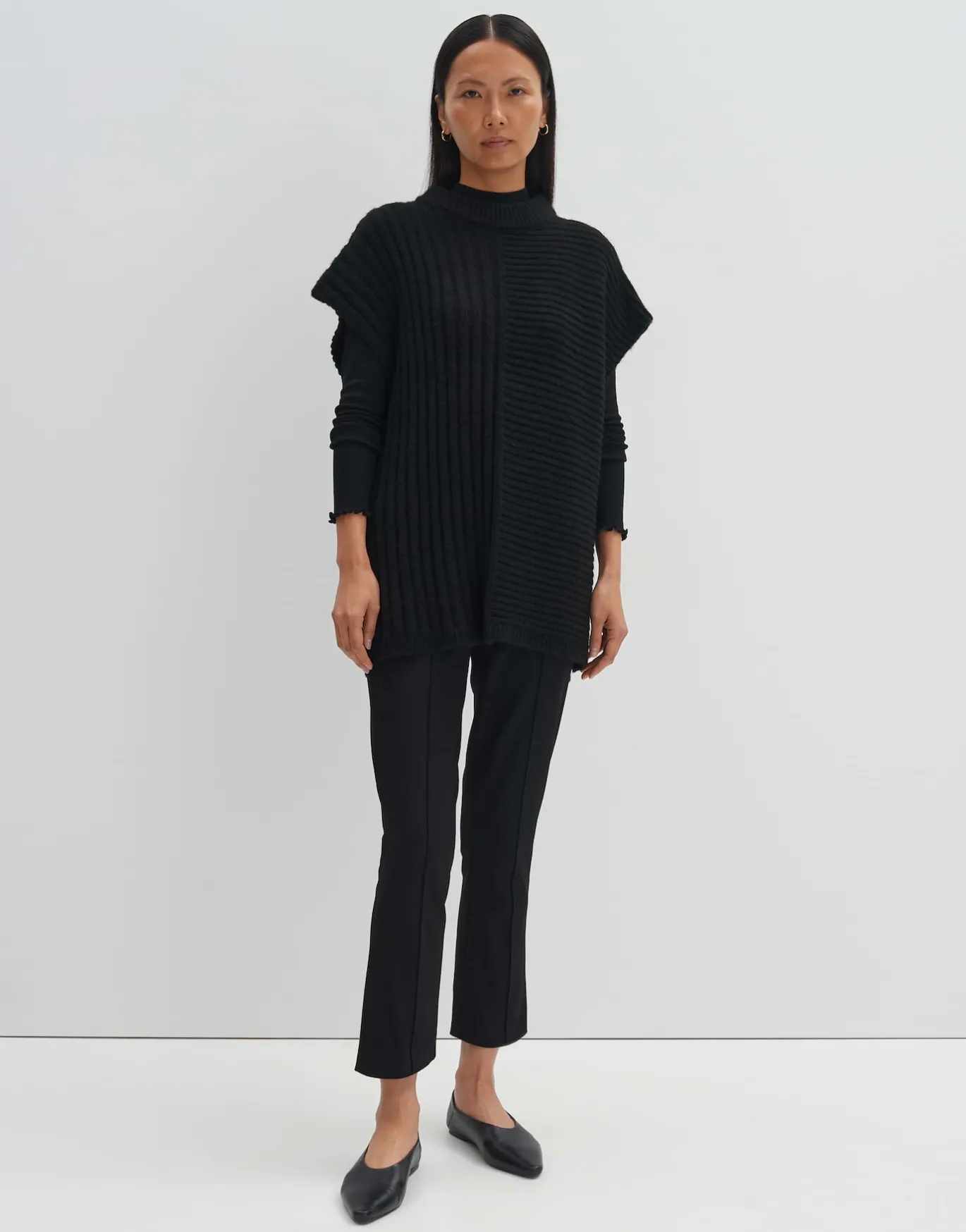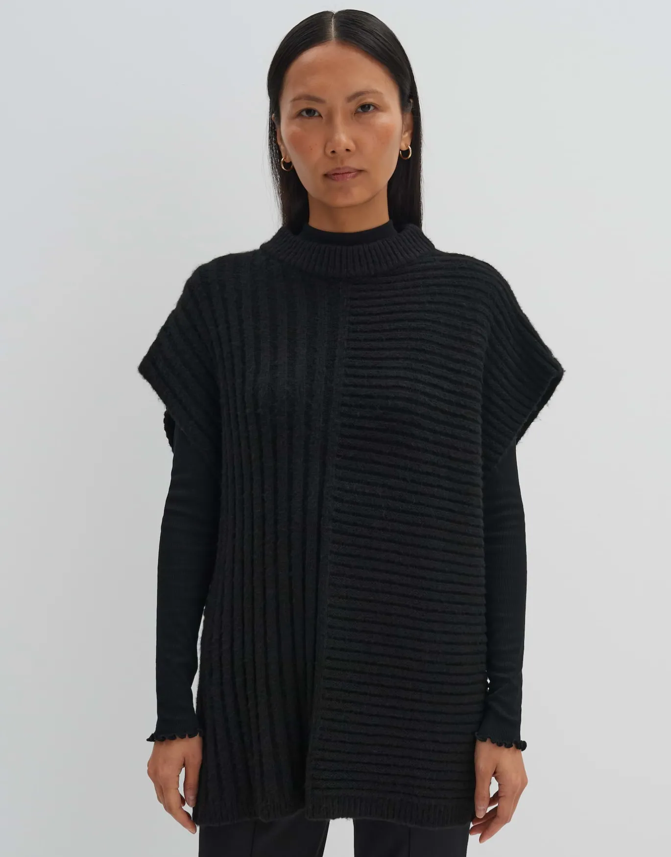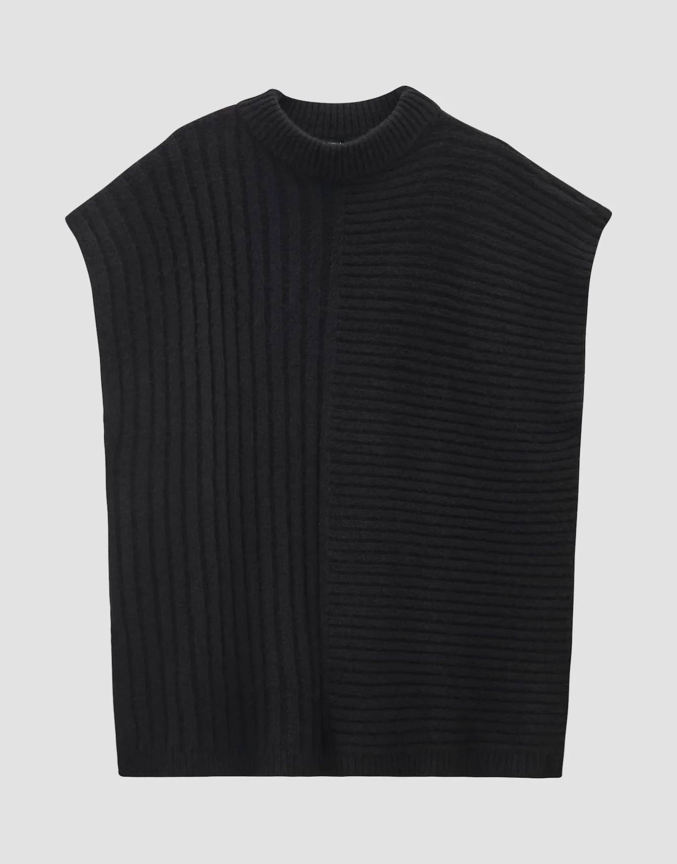 Der Poncho dient als wärmender und stillvoller Überzieher für winterliche Layering Looks. Der Richtungswechsel der Rippe sorgt für einen Eyecatcher.
