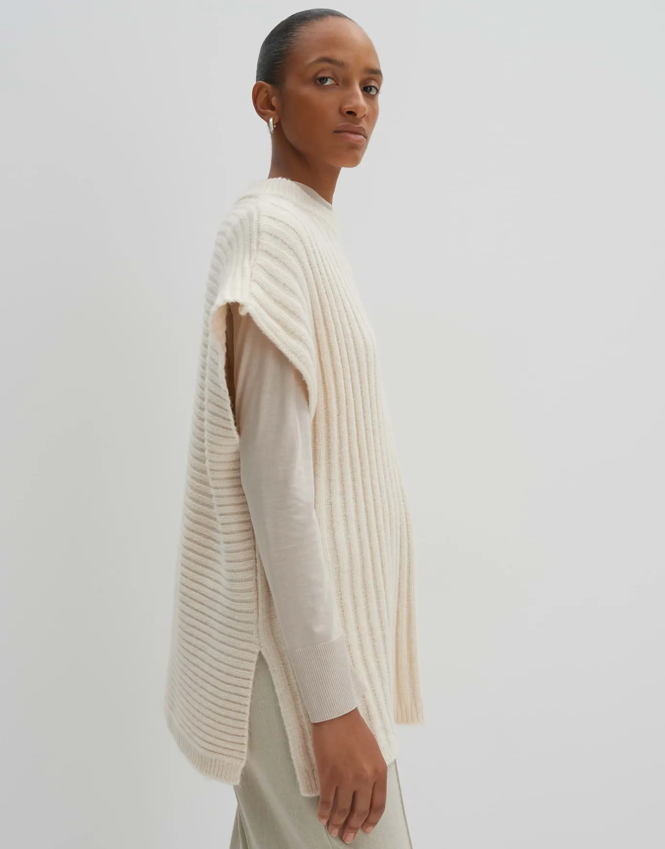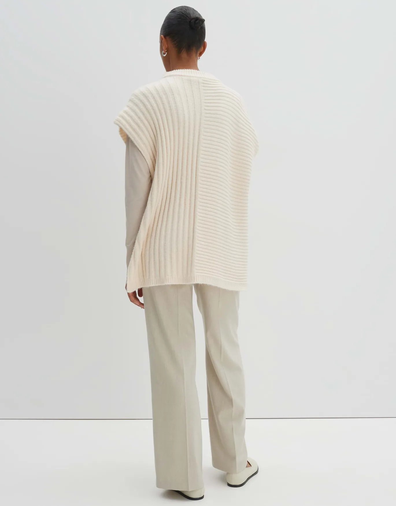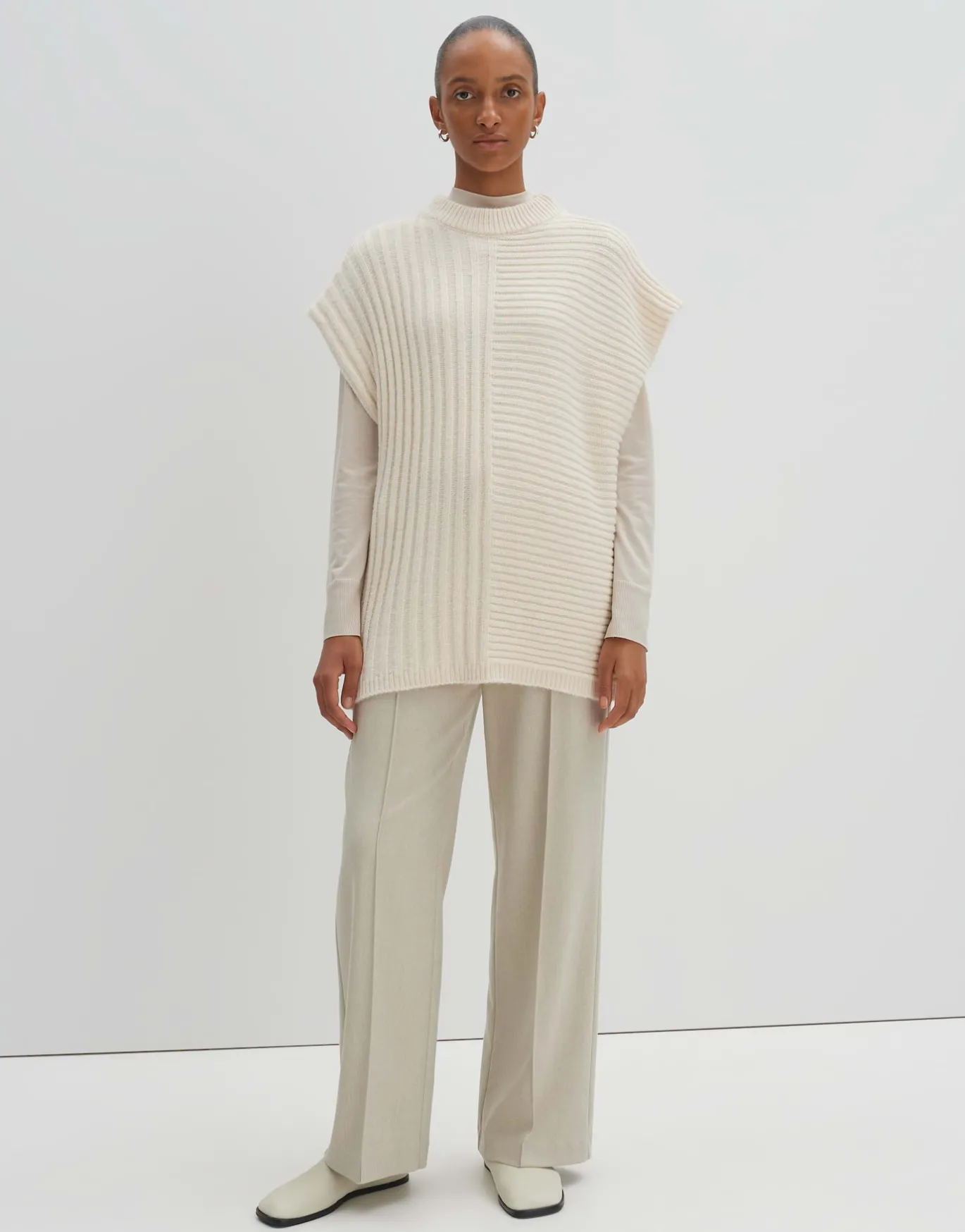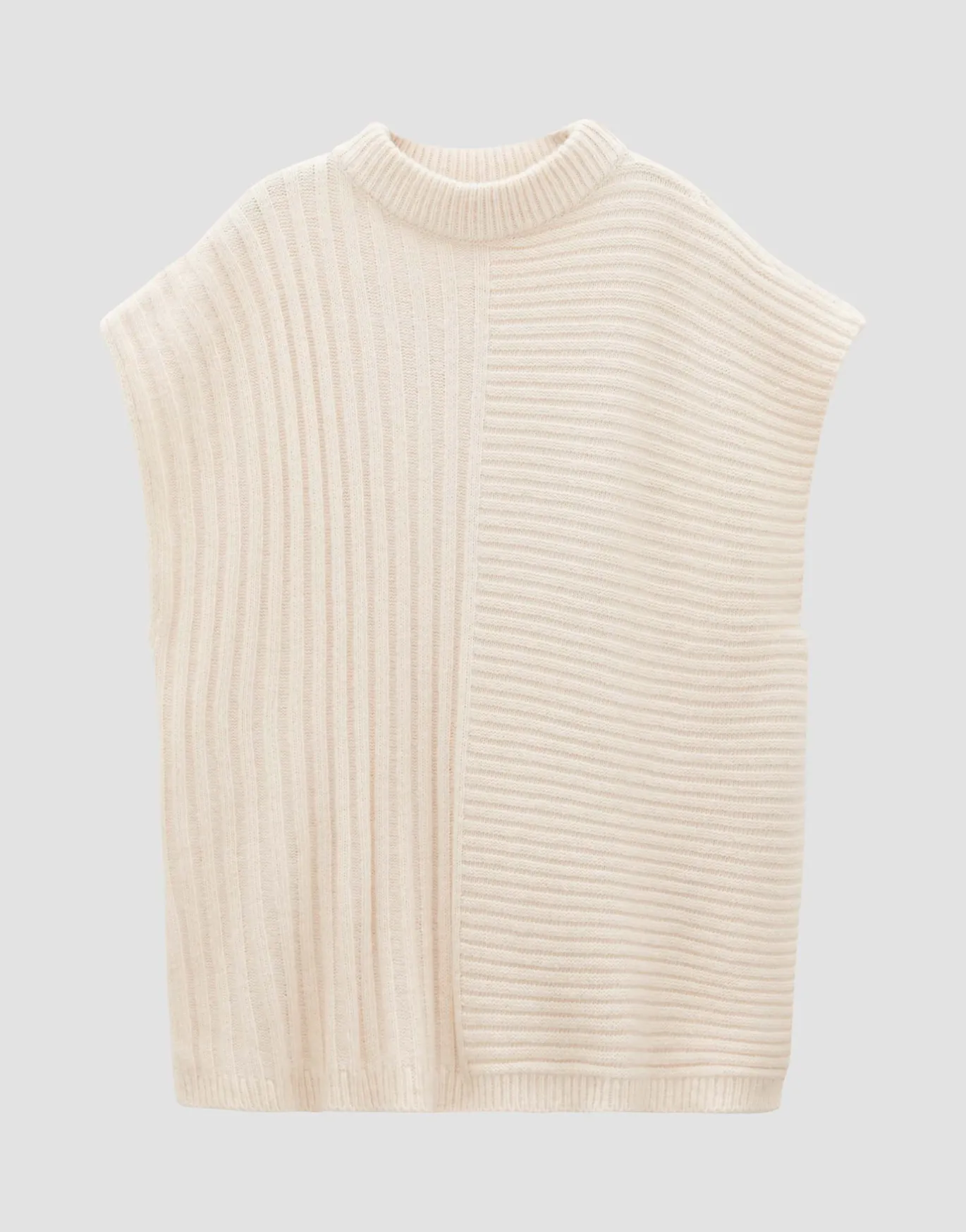 Der Poncho dient als wärmender und stillvoller Überzieher für winterliche Layering Looks. Der Richtungswechsel der Rippe sorgt für einen Eyecatcher.