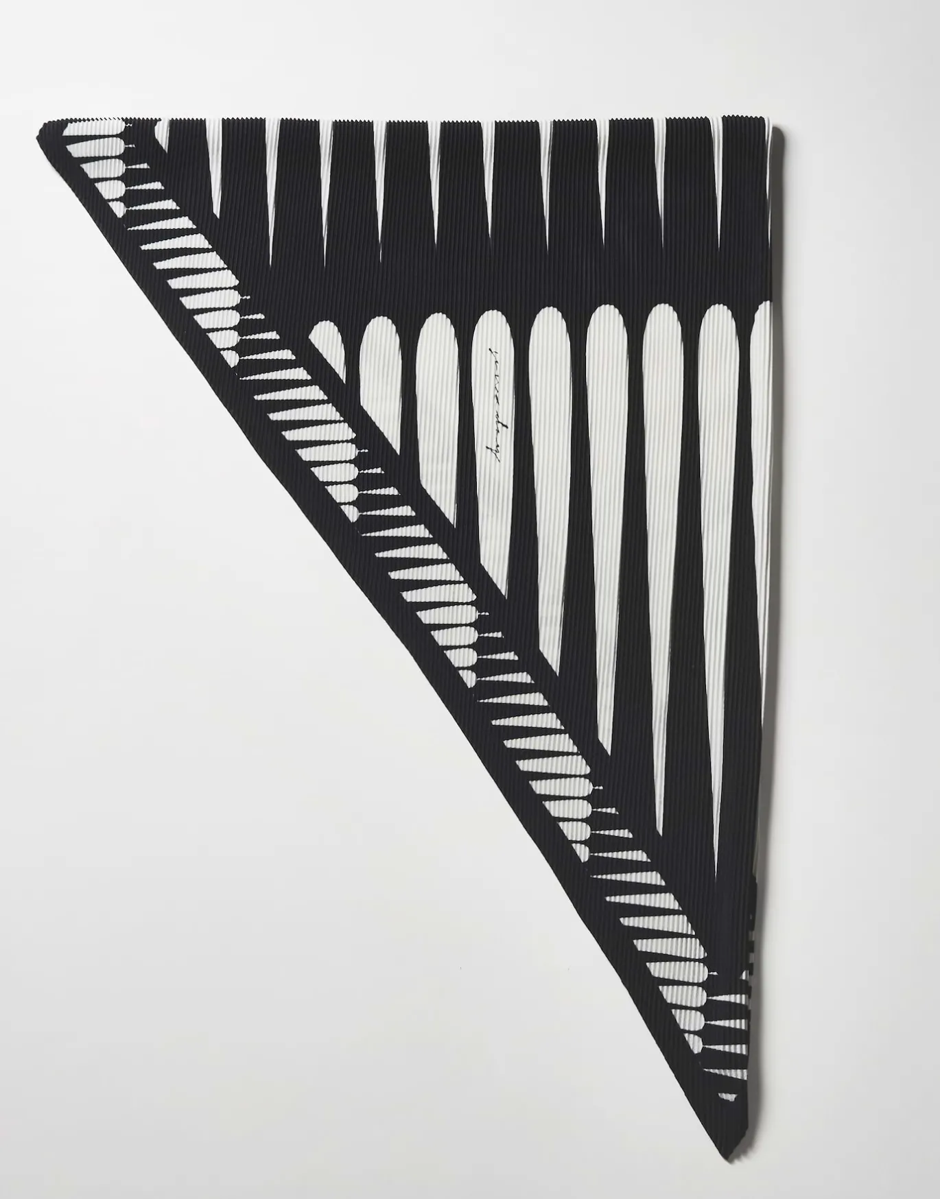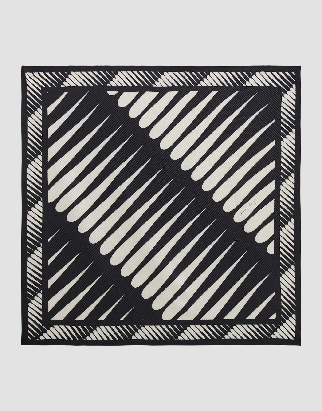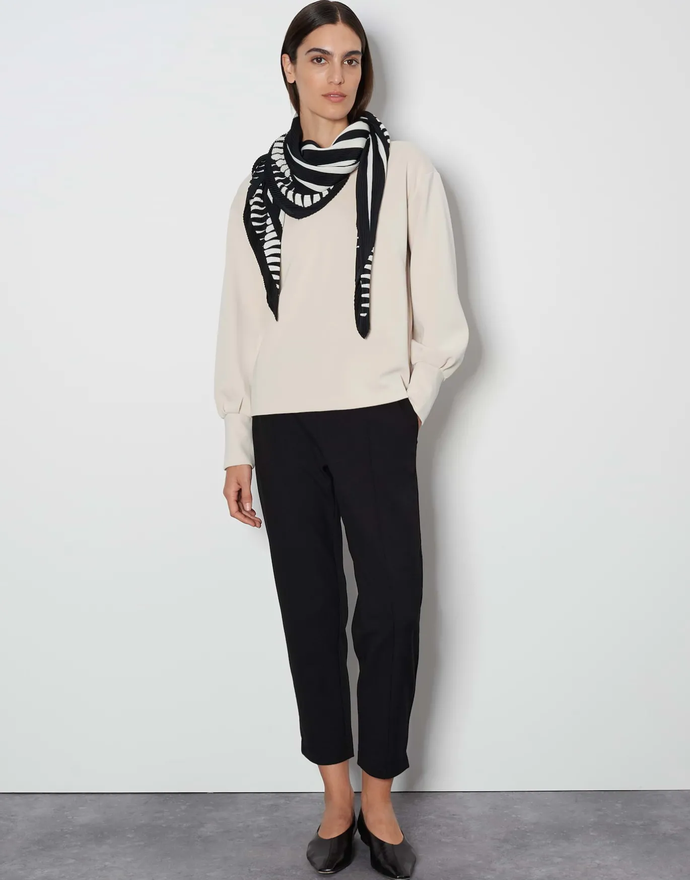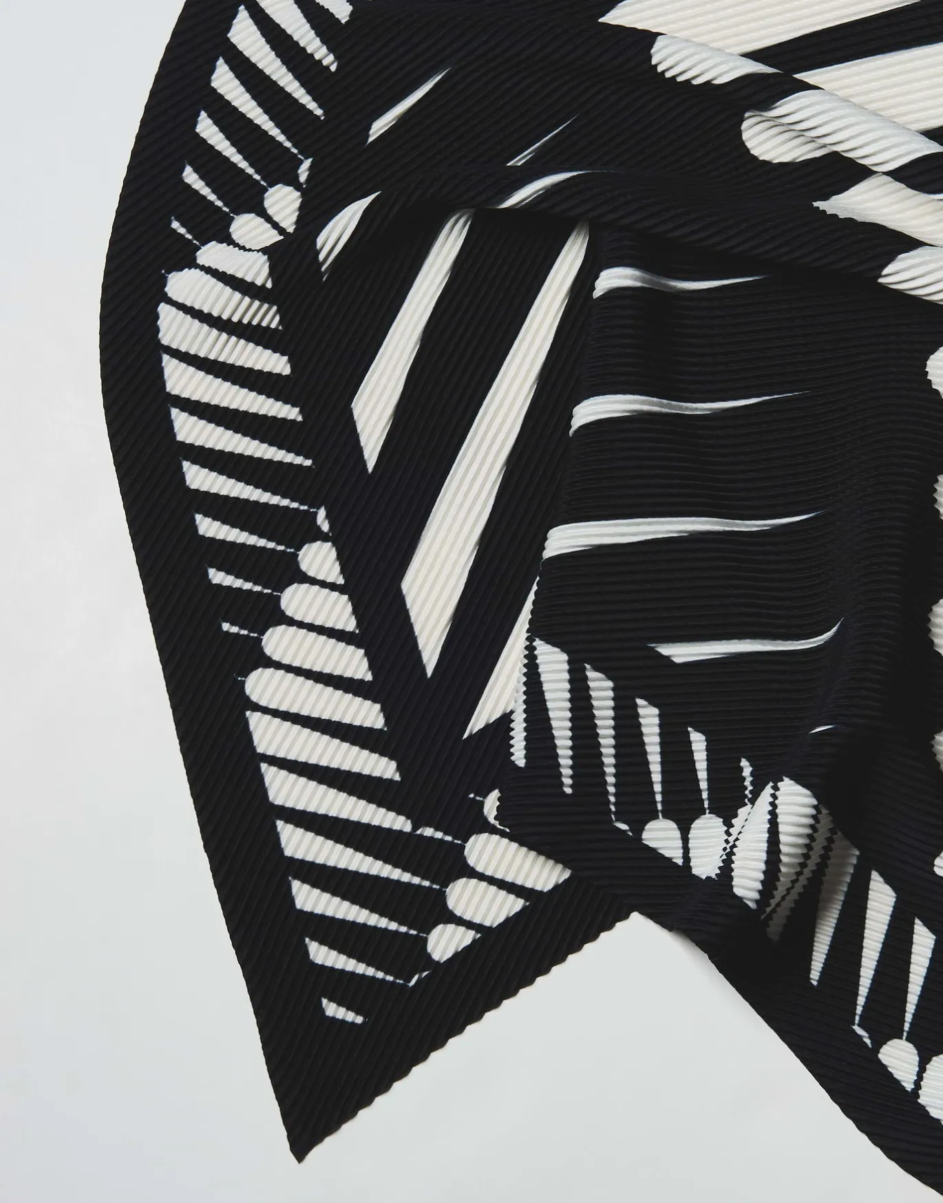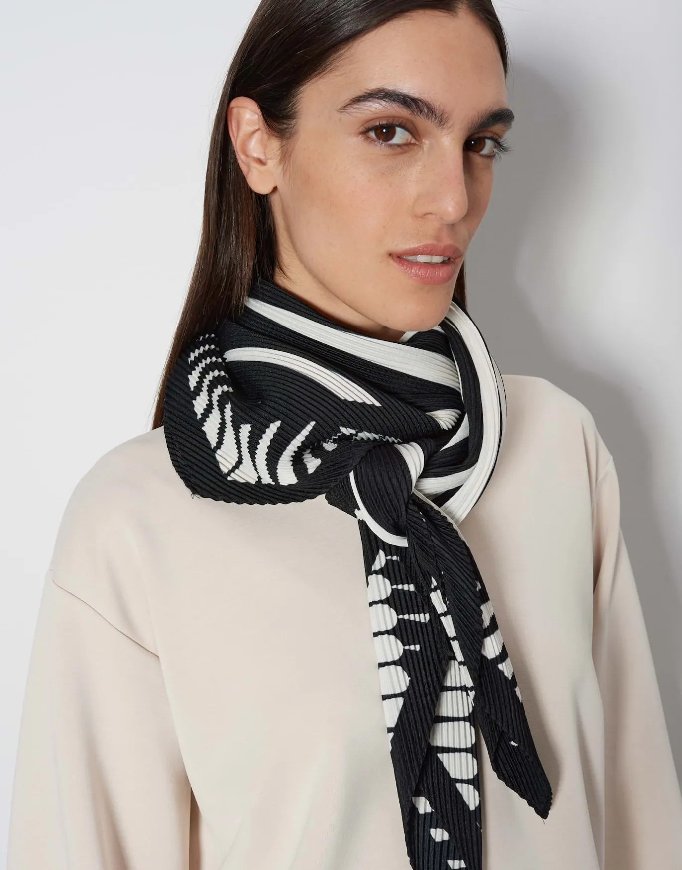Das Satintuch spielt einen kontrastreichen Print über ein dynamischen Plissee – ein tolles Accessoire für farblich monochrome Looks.