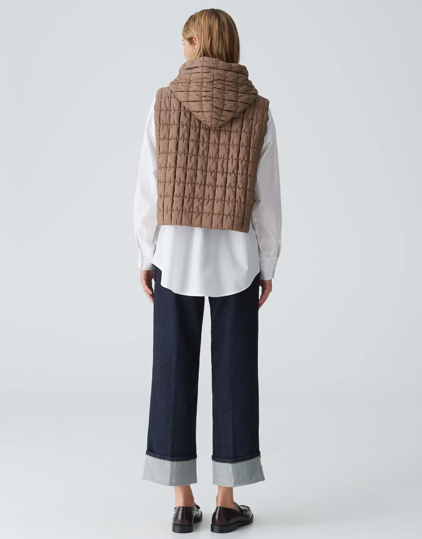 Das Kapuzencape im Stil einer Weste erhält durch die quadratische Steppung eine besondere Textur und ist das ideale Trend Item für einen perfekten Lagenlook.