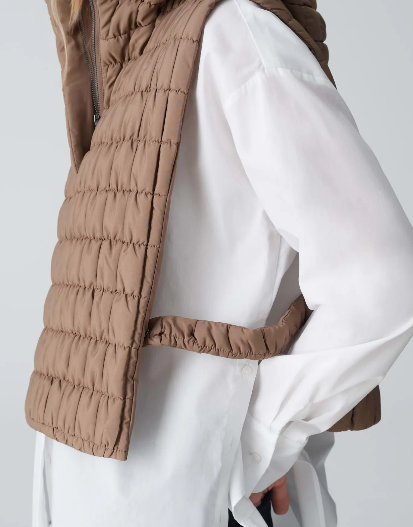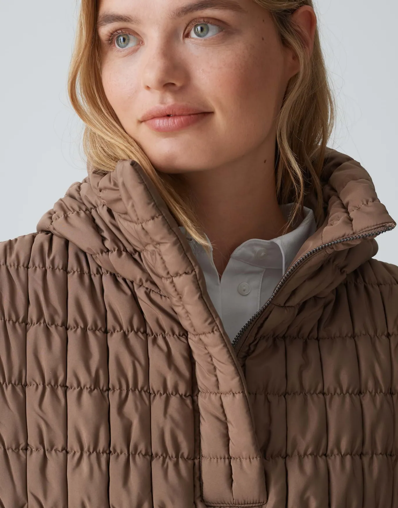 Das Kapuzencape im Stil einer Weste erhält durch die quadratische Steppung eine besondere Textur und ist das ideale Tre…