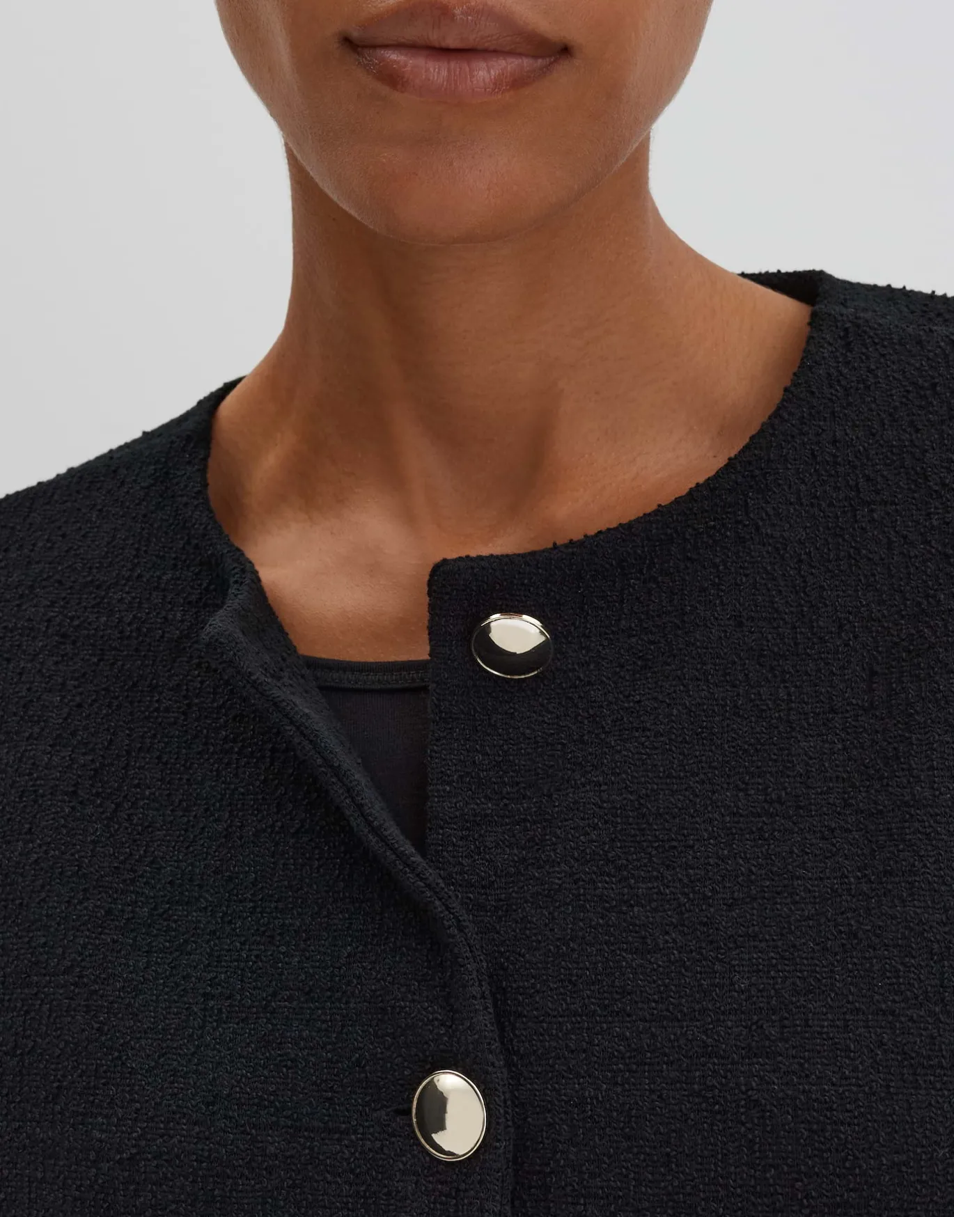 Die Blazerjacke in dünner Bouclé-Ware ist mit den metallische Knöpfen ein eleganter Hingucker. Die Front zieren zwei große Klappentaschen. Die Passform ist weit und kurz gehalten.