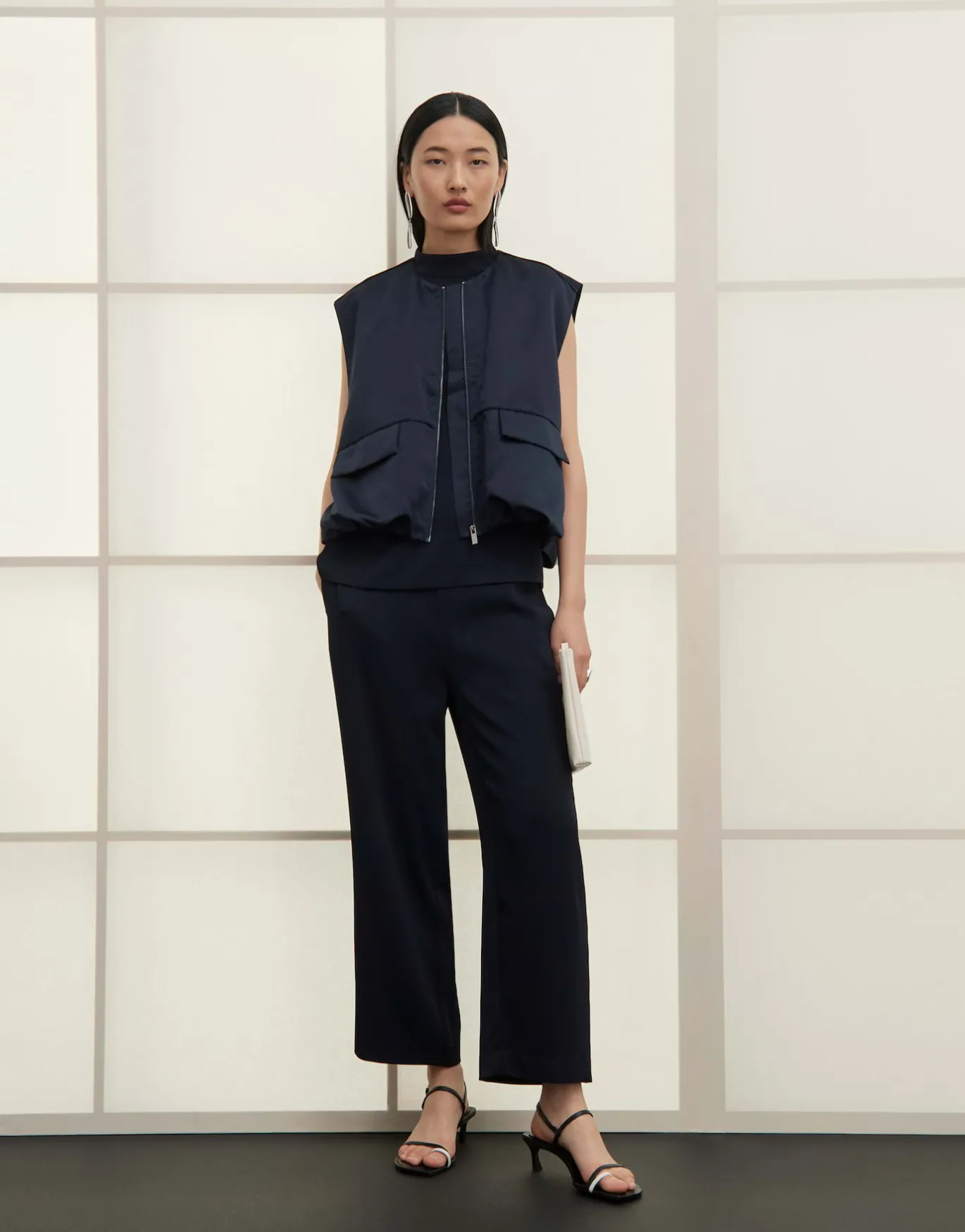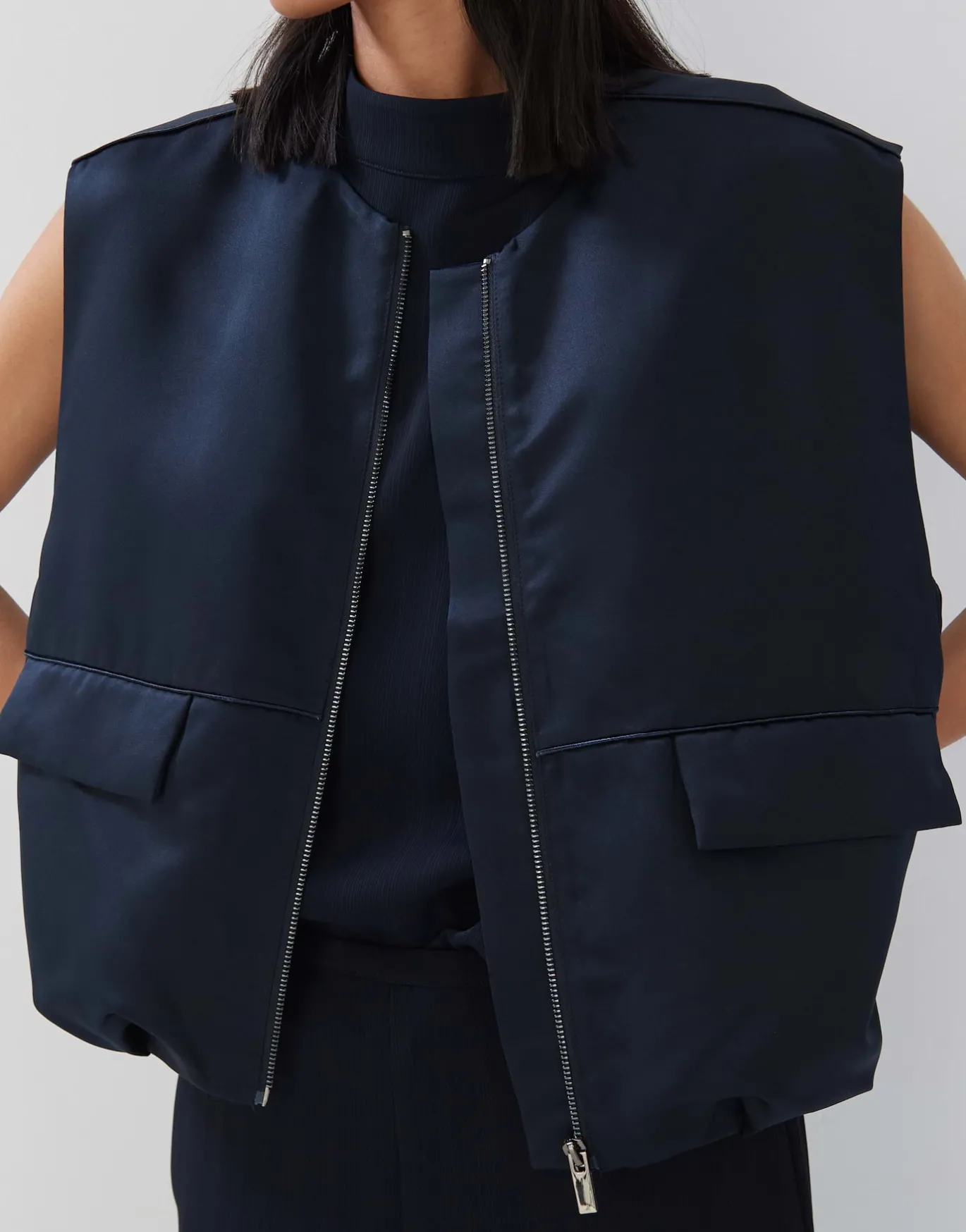 Diese Weste ist verleiht Kleidern oder Shirts einen lässigen Utility Lookund eine feine Note Eleganz.