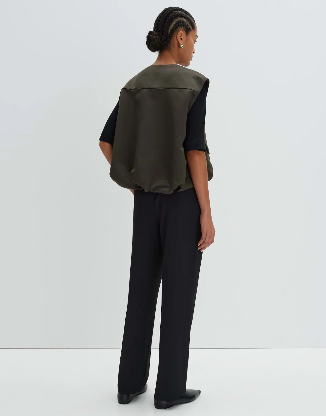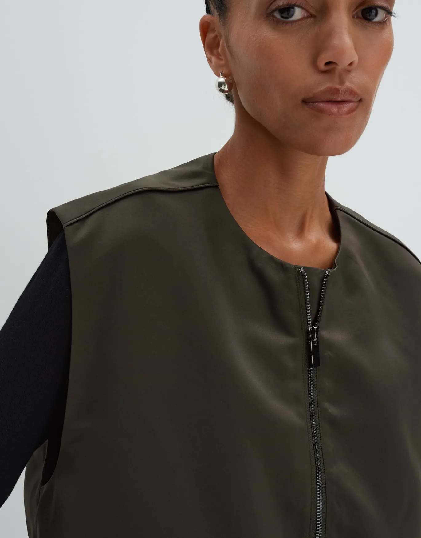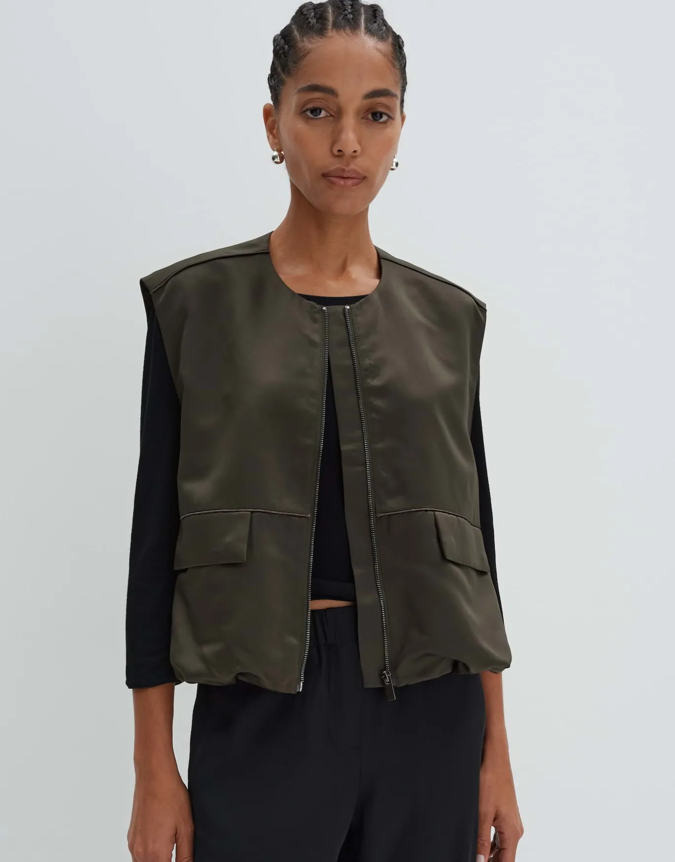 Diese Weste ist verleiht Kleidern oder Shirts einen lässigen Utility Lookund eine feine Note Eleganz.