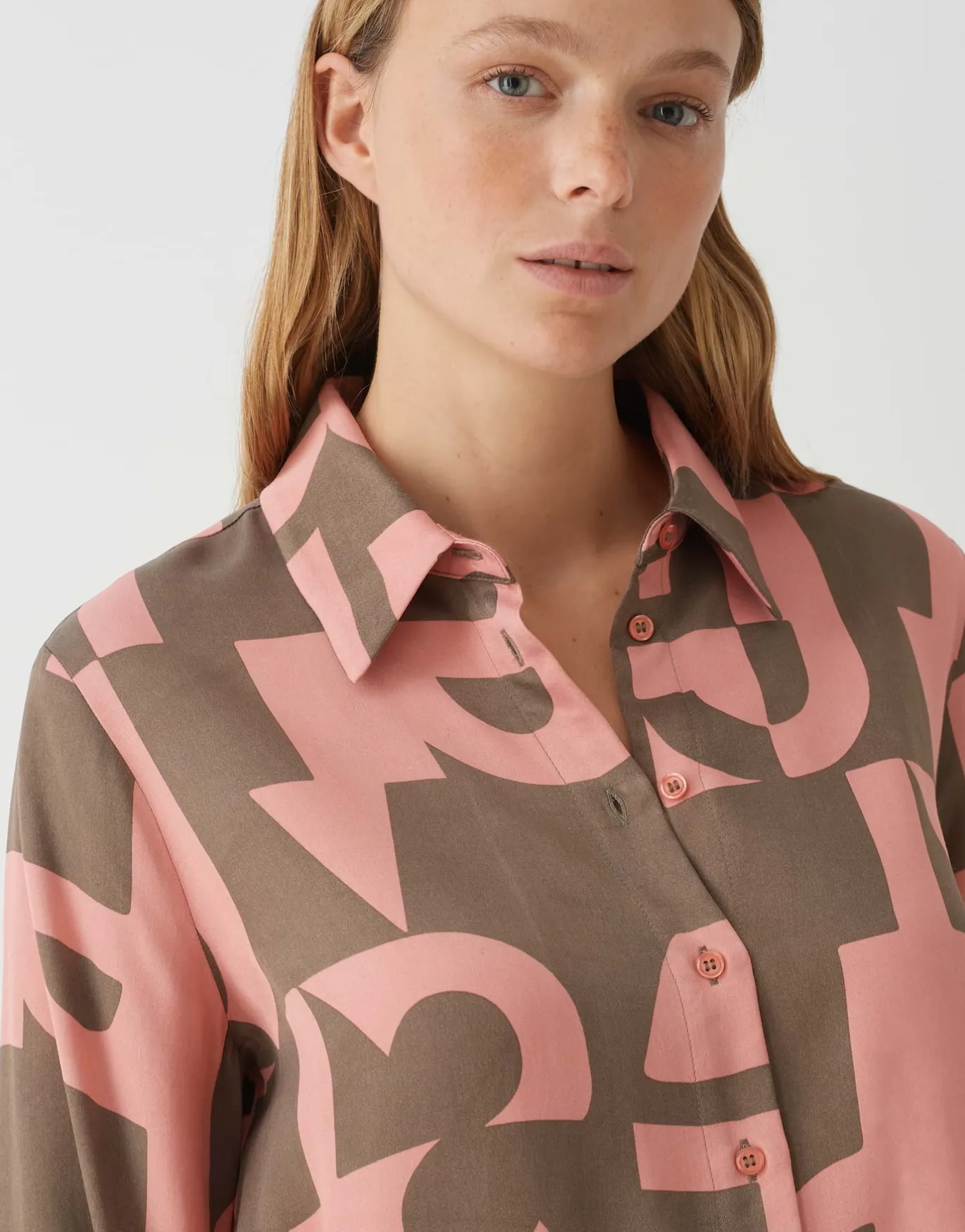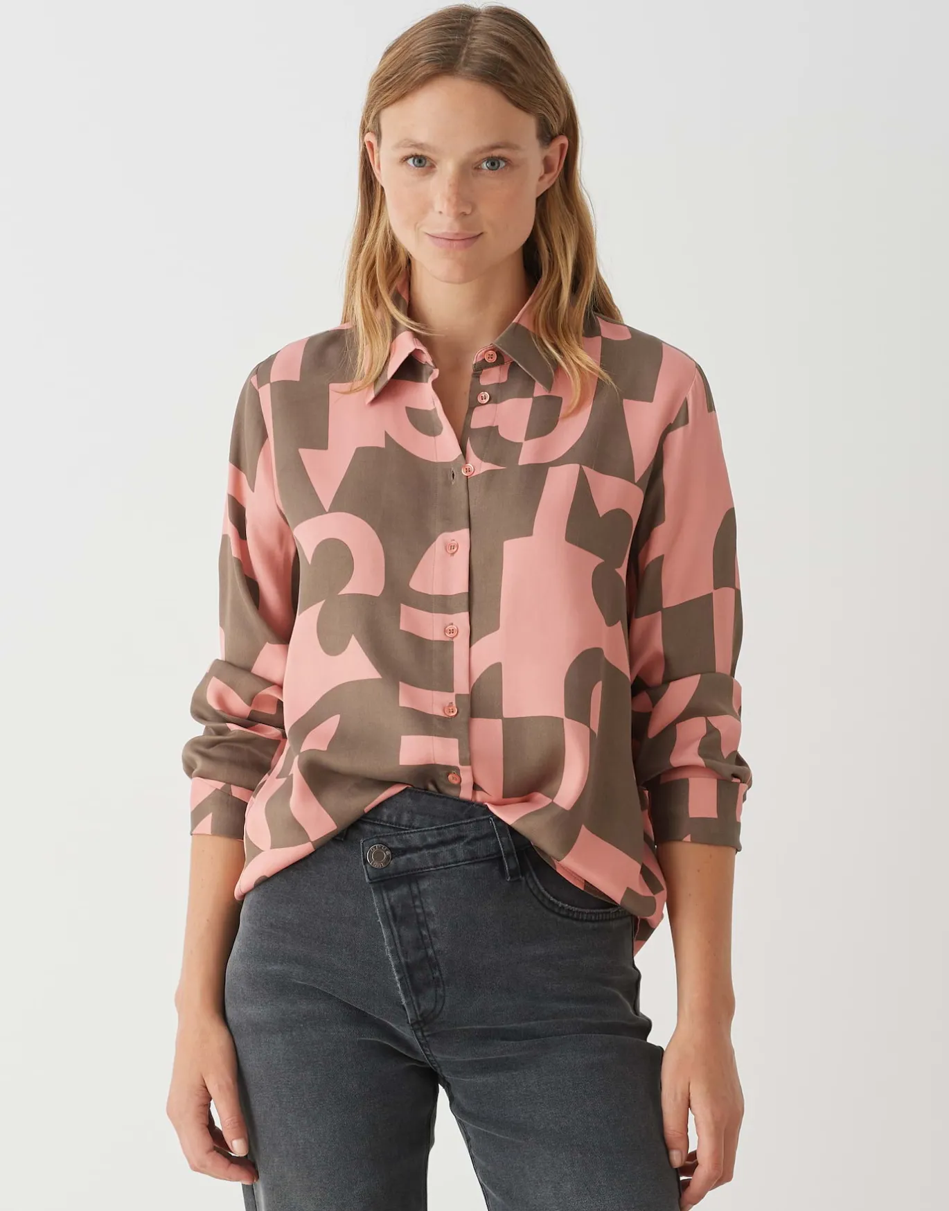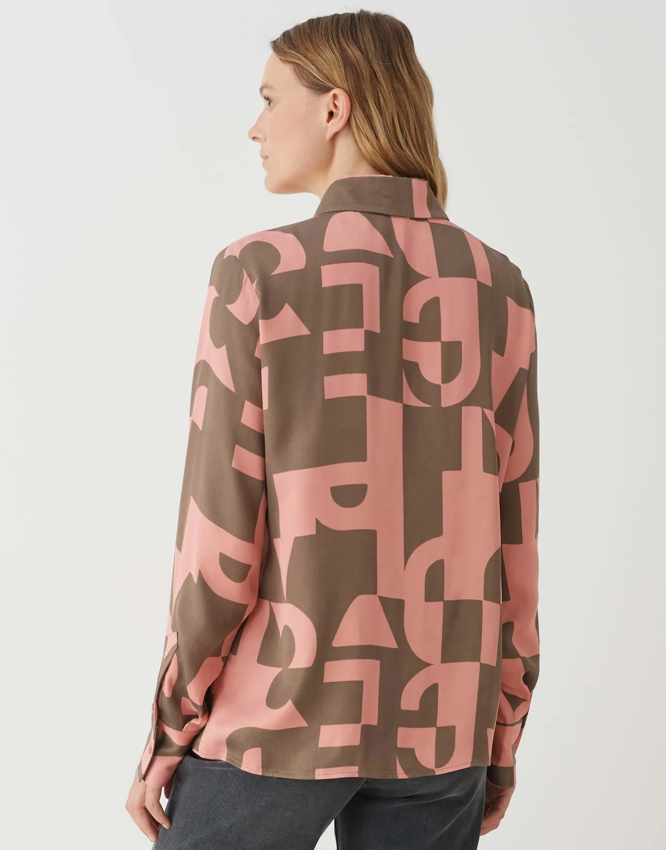 Die stilvolle Hemdbluse aus einem leicht glänzenden Satin-Stoff legt den Fokus auf den abstrakten Allover Print und bringt schöne Akzente in die Looks.