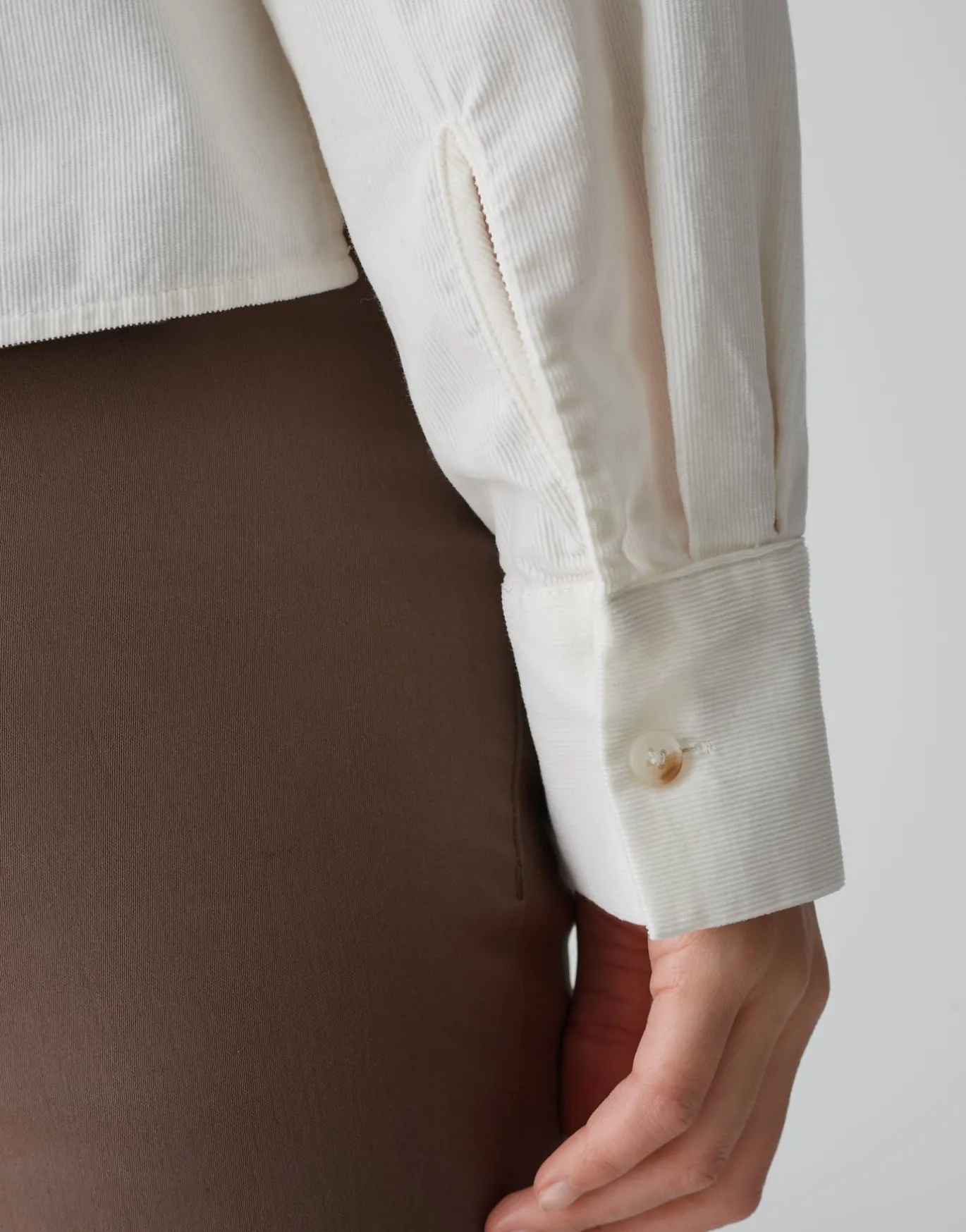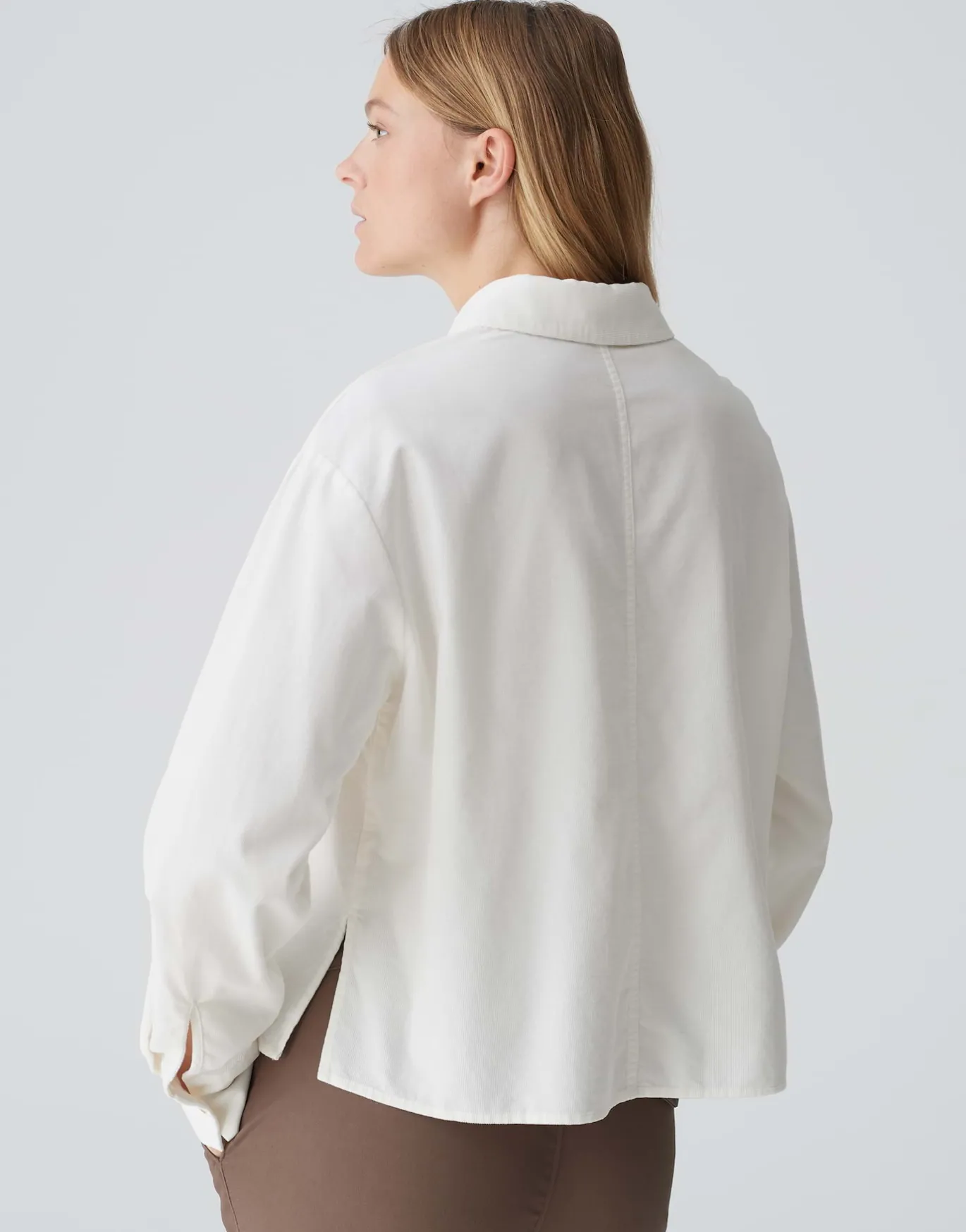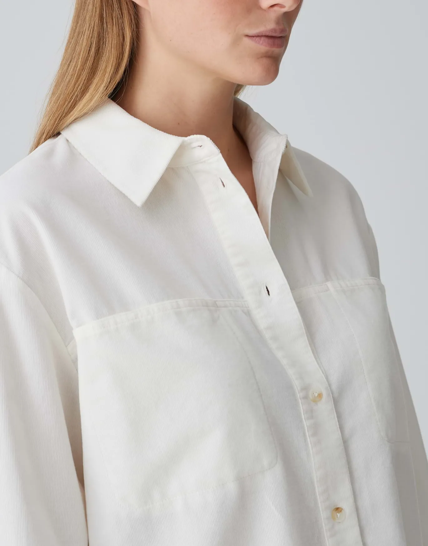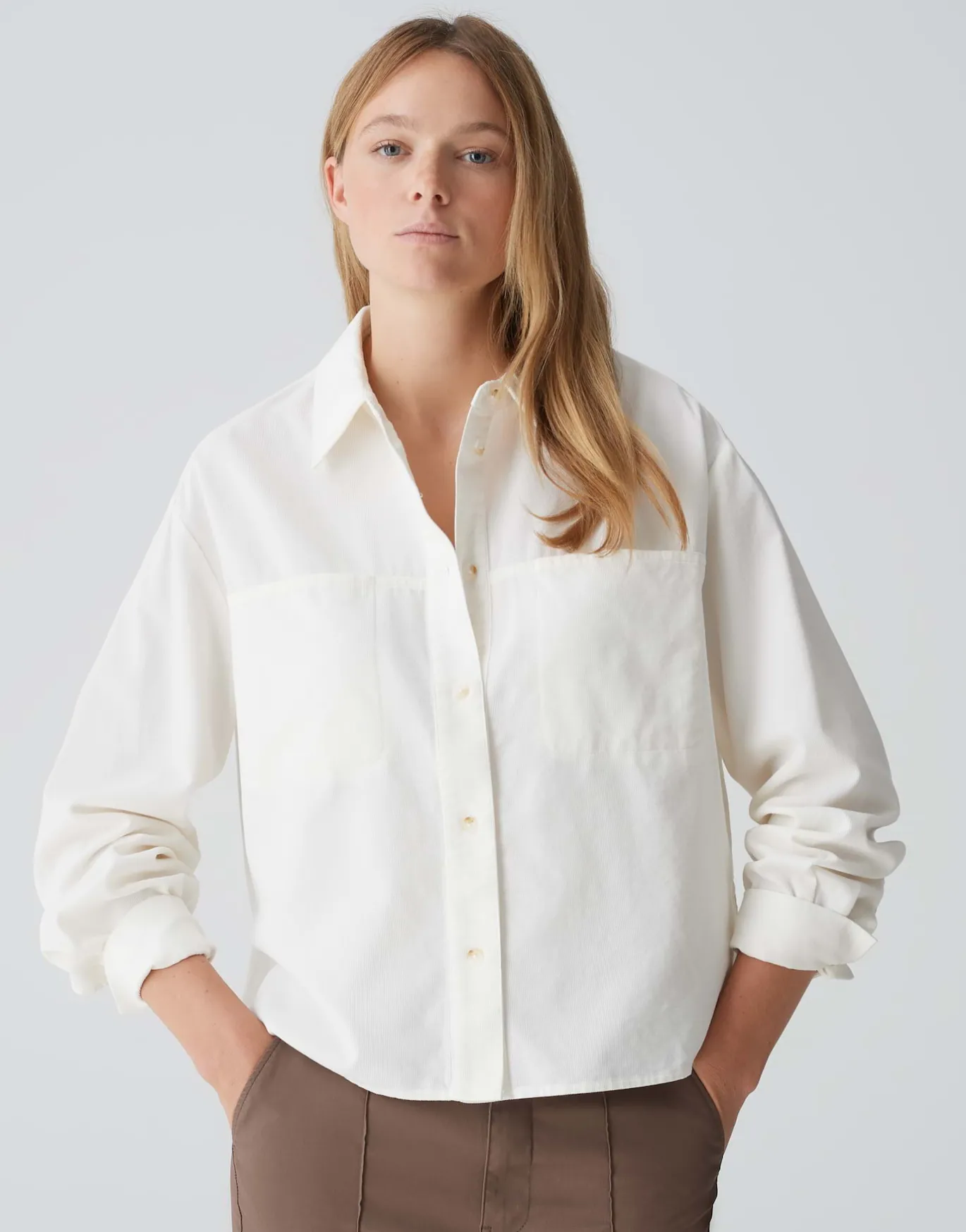 Die Cordbluse begleitet uns auch in dieser Saison und begeistert durch das softe Hand-Feel. Das modische Update erhält die Bluse durch die außergewöhnlichen Brusttaschen und den Hornoptik Knöpfen – für einen natürlichen Look.