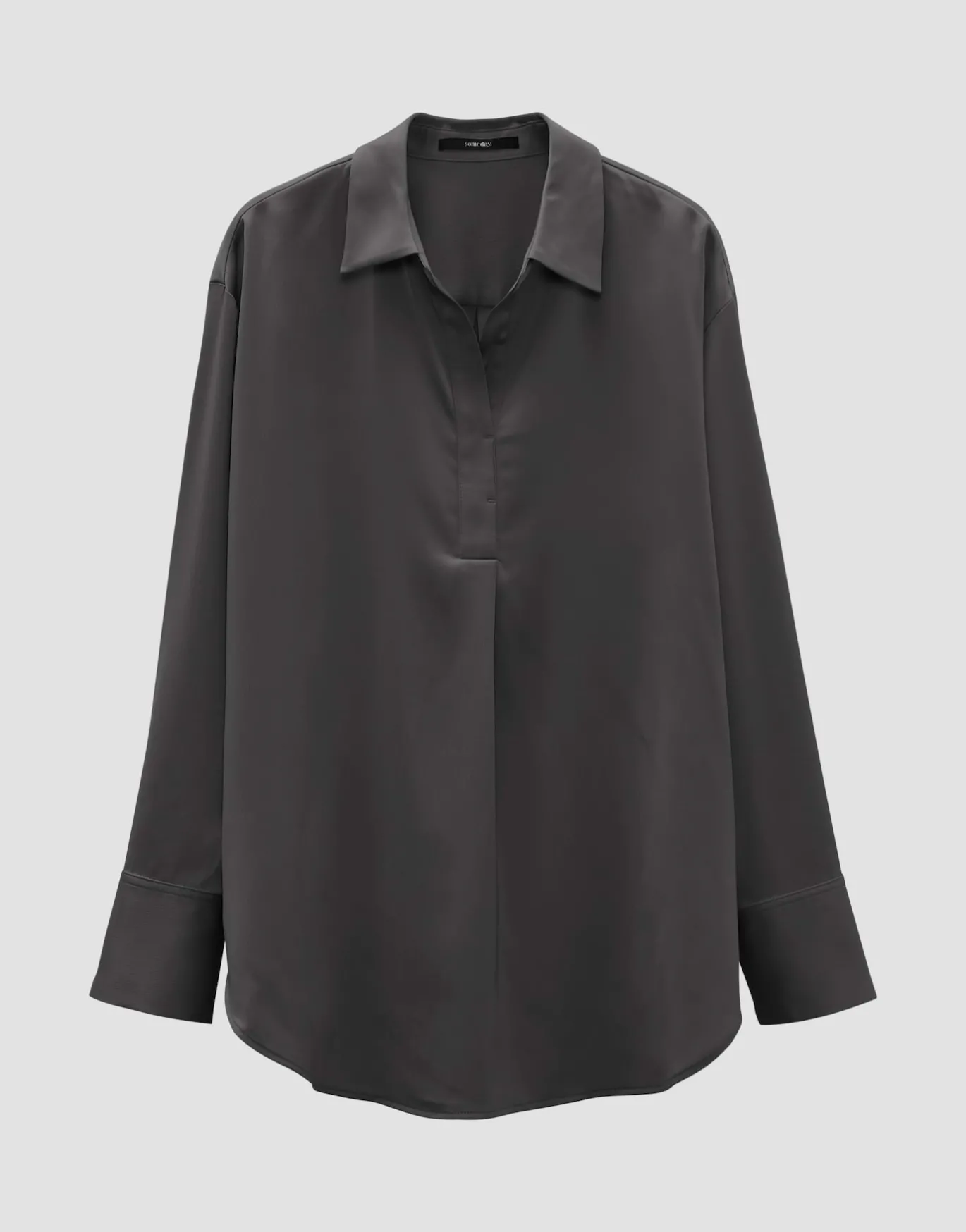 Die Shirtbluse aus einem Recycled Polyester Mix ist ein echtes Christmas Basic. Die schwere, glänzende Ware wirkt beson…
