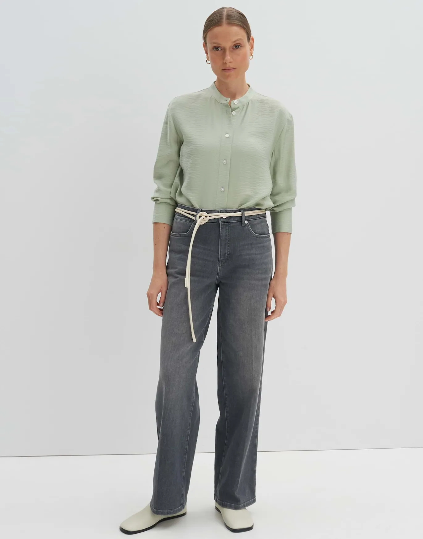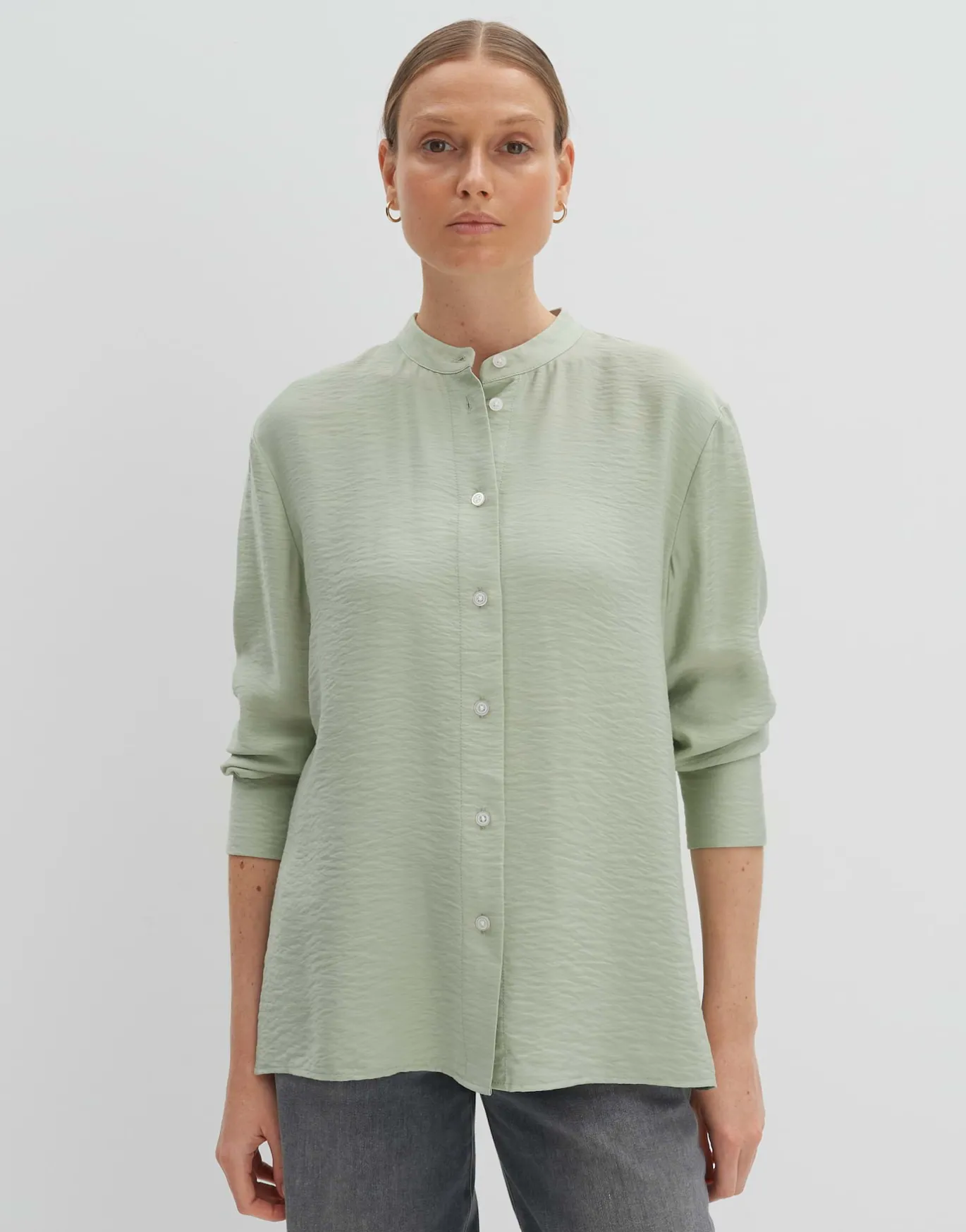 Die Stehkragenbluse verspricht einen klassischen Look gespielt über eine komfortable, fließende Viskose Ware.