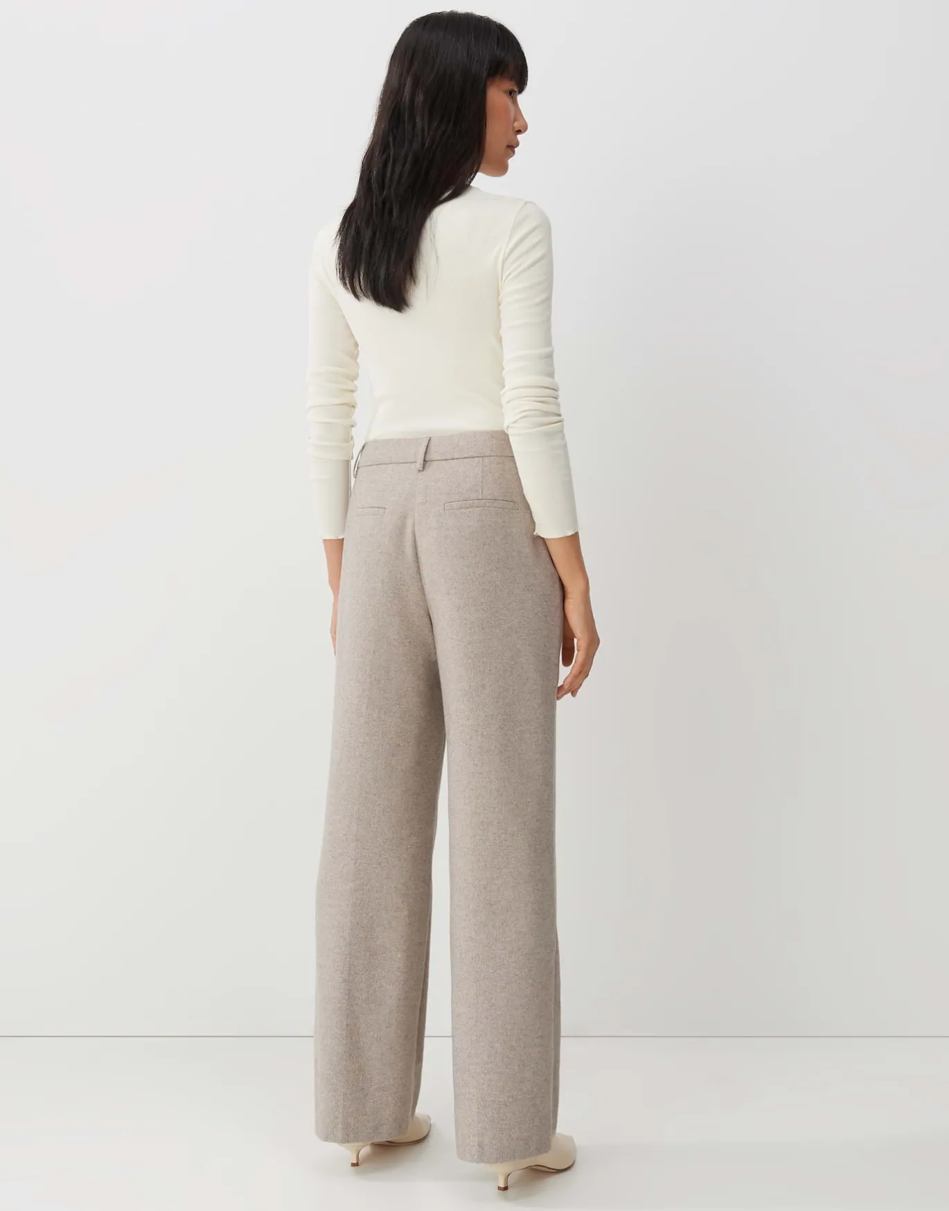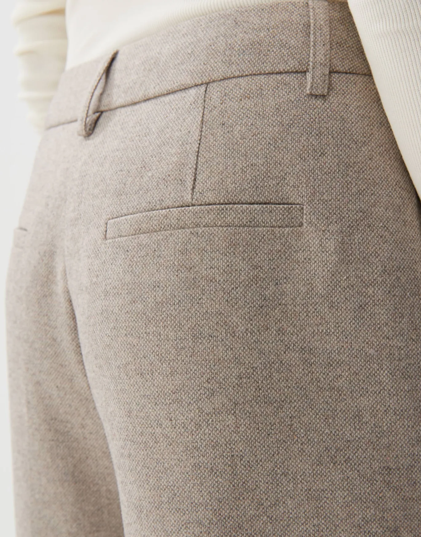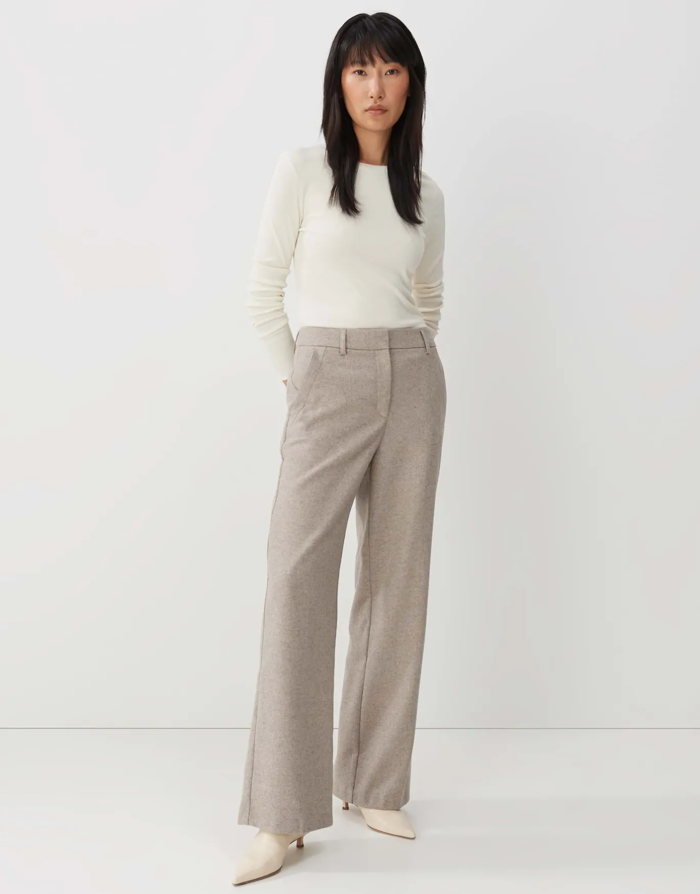 Die Anzughose aus einem weichen Woll-Mix spielt eine klassische Salz-Pfeffer-Optik über einen geraden, langen Beinverla…