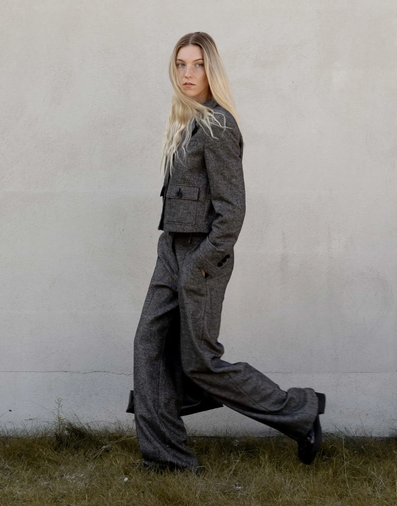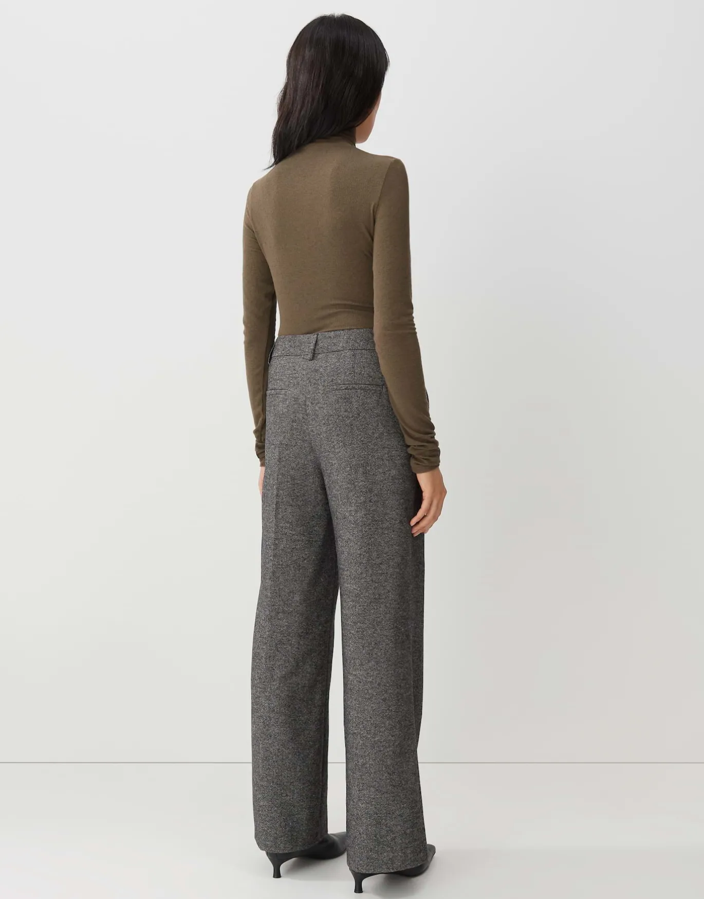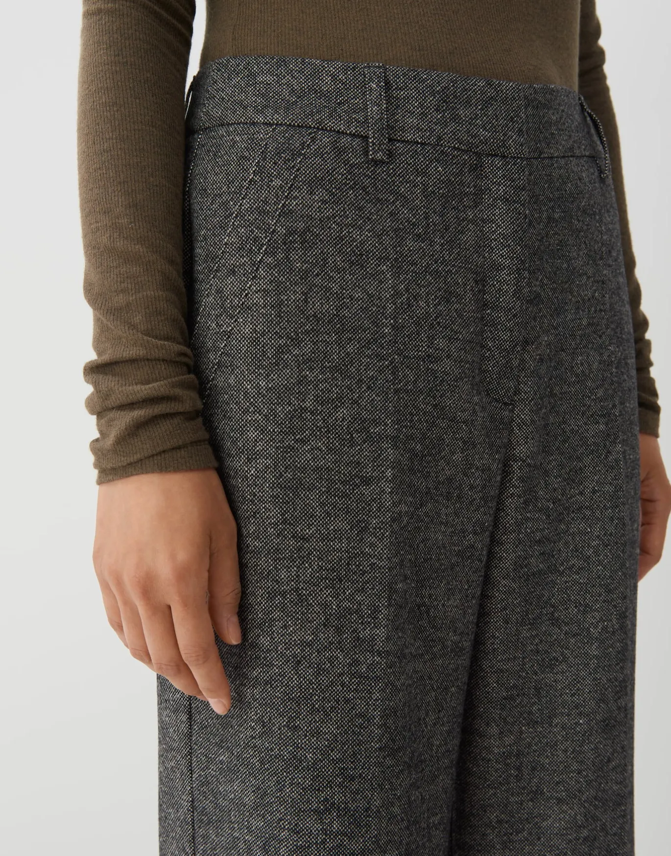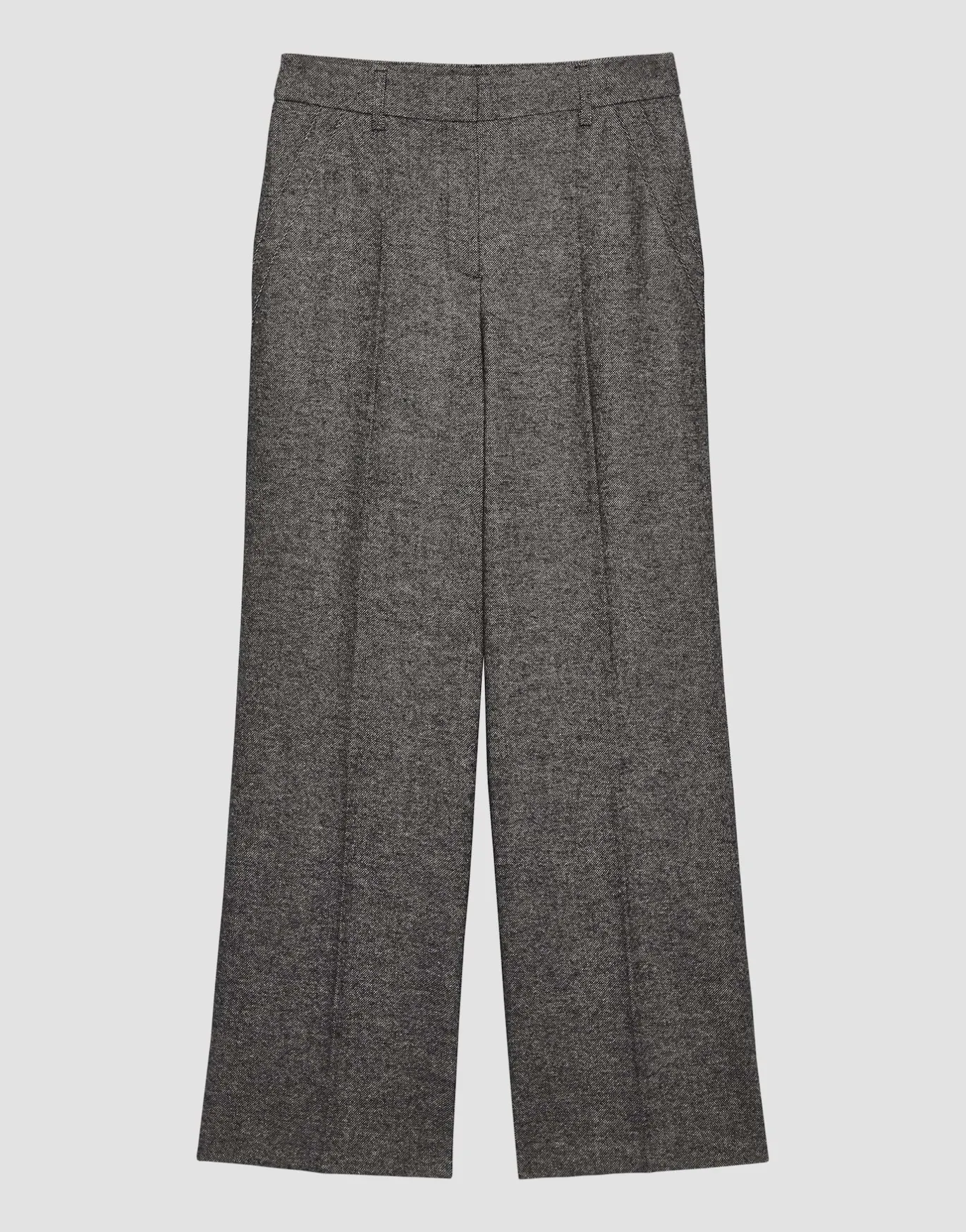 Die Anzughose aus einem weichen Woll-Mix spielt eine klassische Salz-Pfeffer-Optik über einen geraden, langen Beinverla…