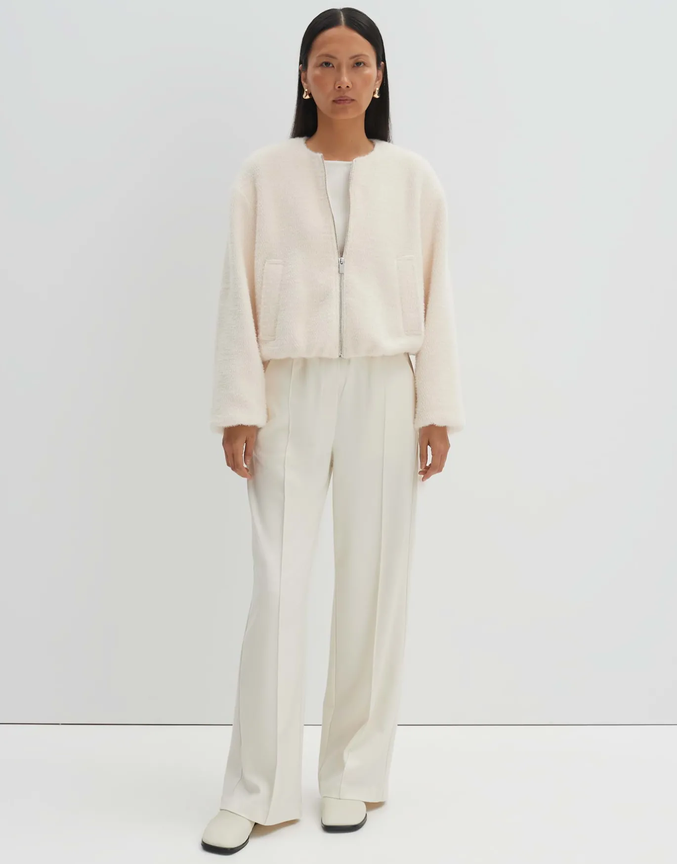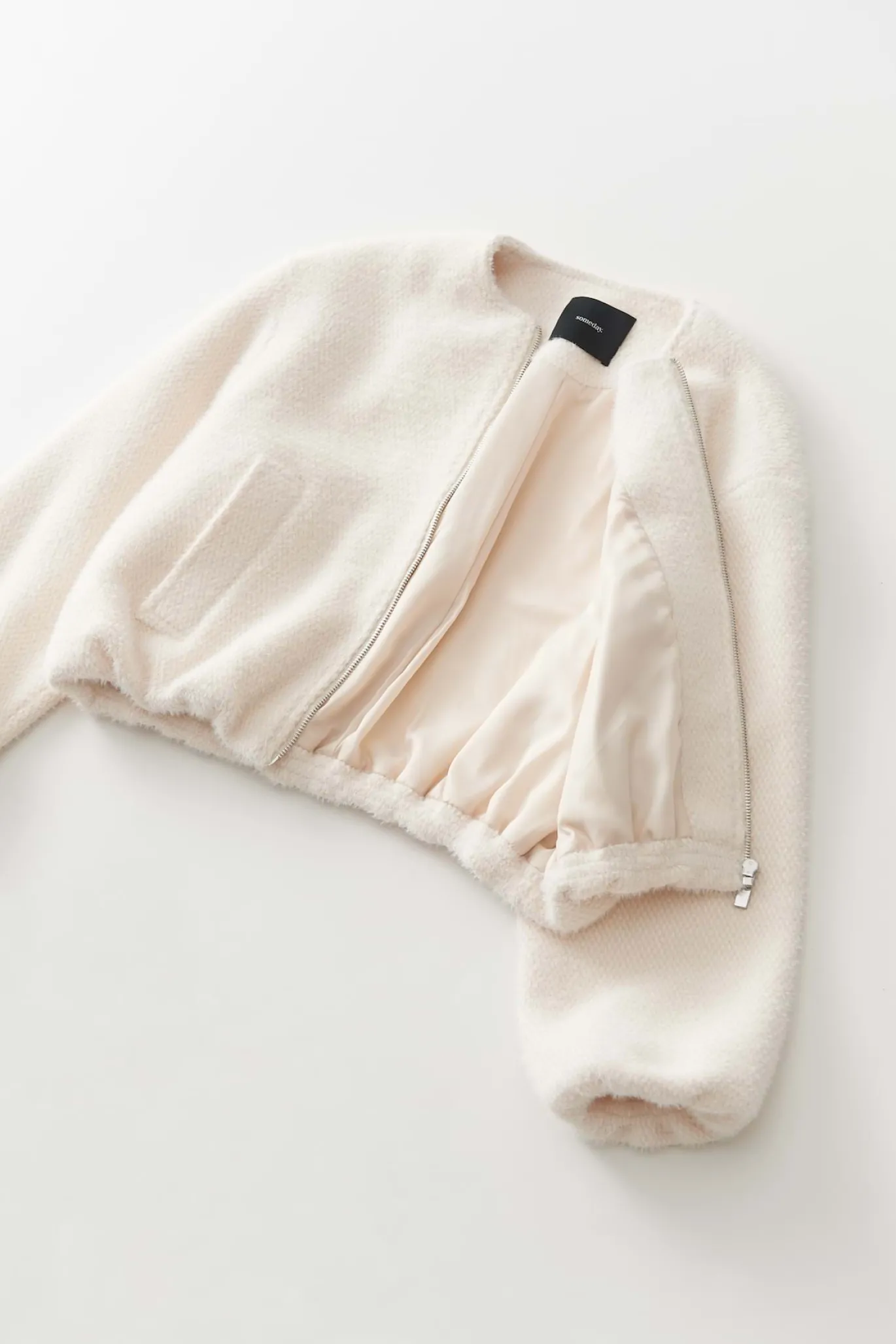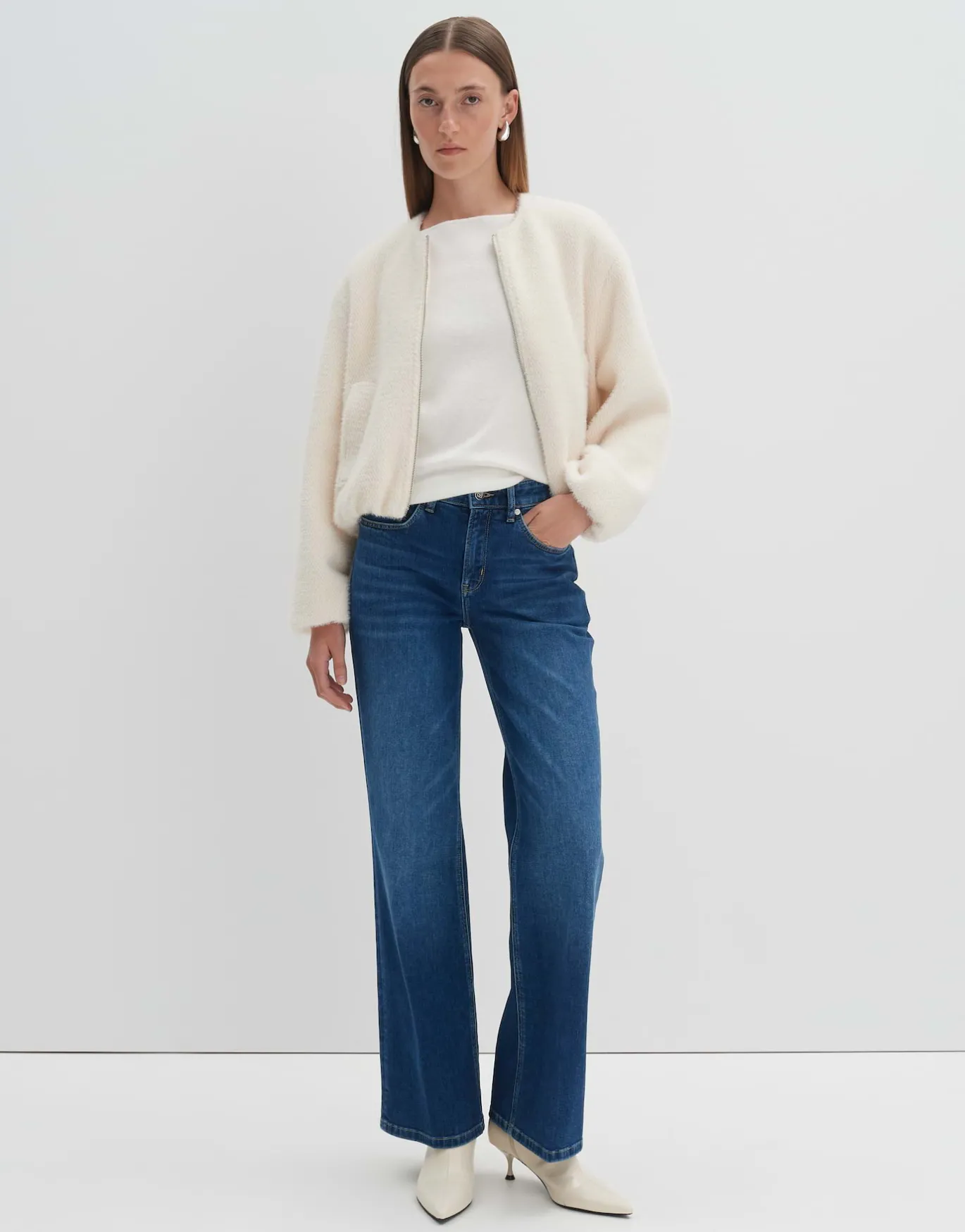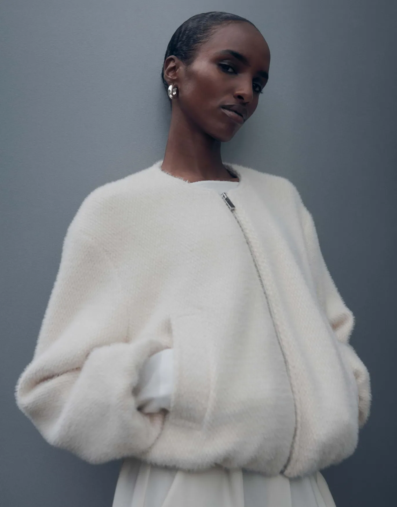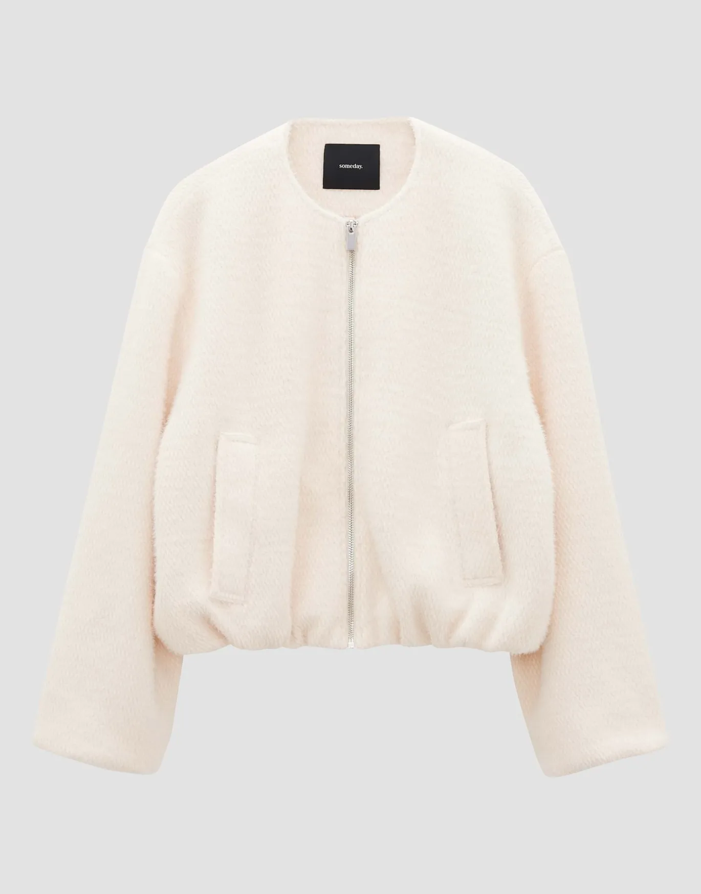 Dieser flauschige Blouson setzt auf feines, tonales Muster und eine super weiche Oberfläche, perfekt für einen hellen Herbst Look.