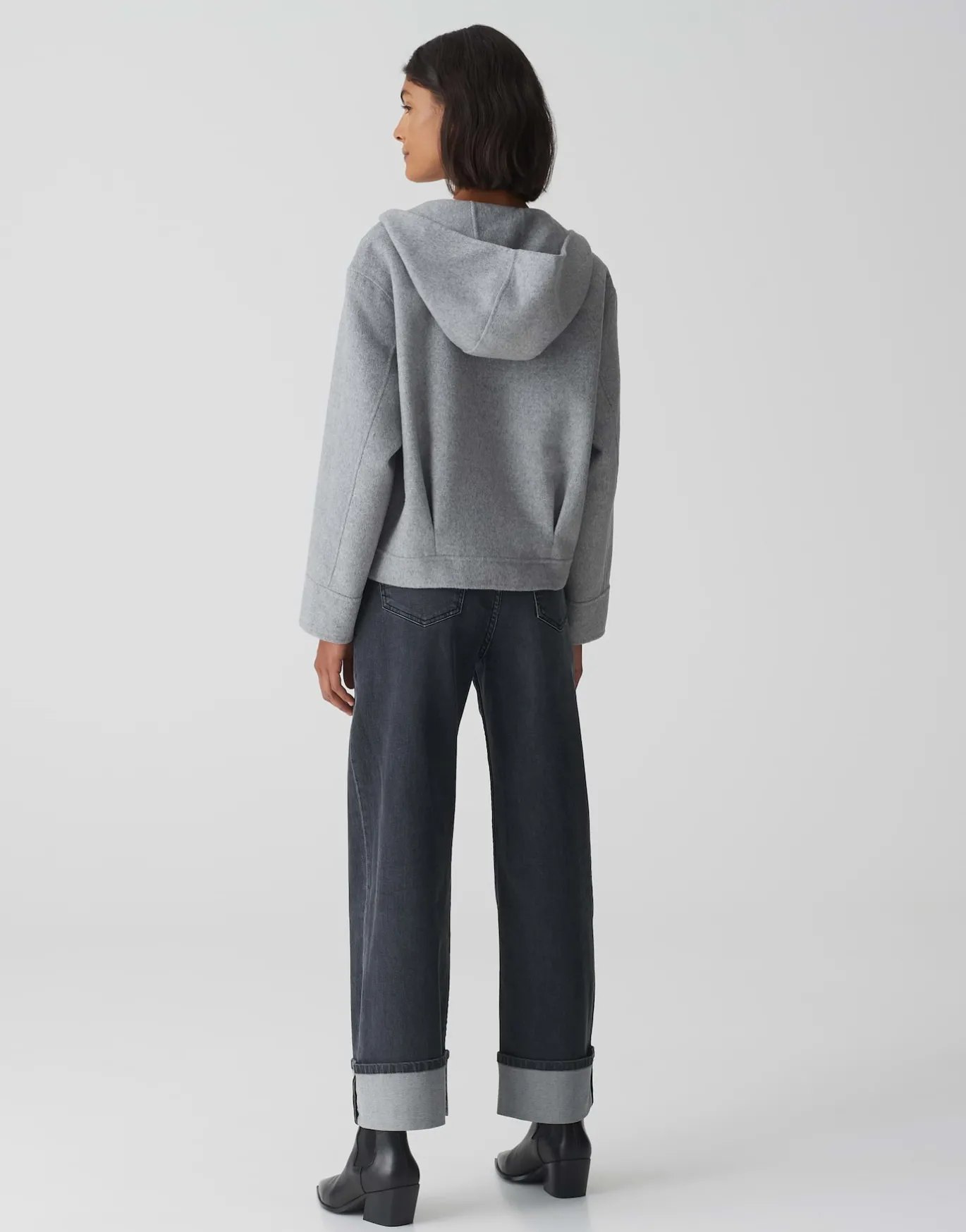 Die Wolljacke spielt ein raffiniertes Detail im Rücken und lässt sich durch die angenehme Qualität super transseasonal stylen.