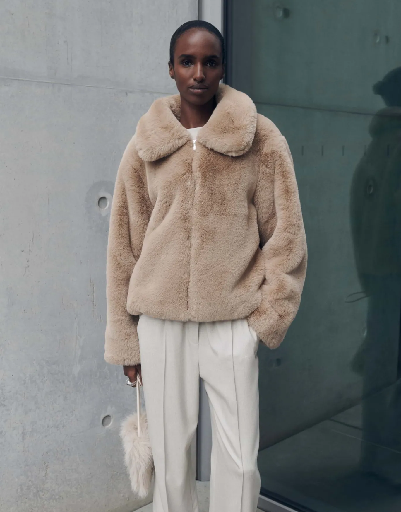 Die kurze und weite Jacke aus authentischem Fellimitat ist extrem weich, voluminös und hält angenehm warm.