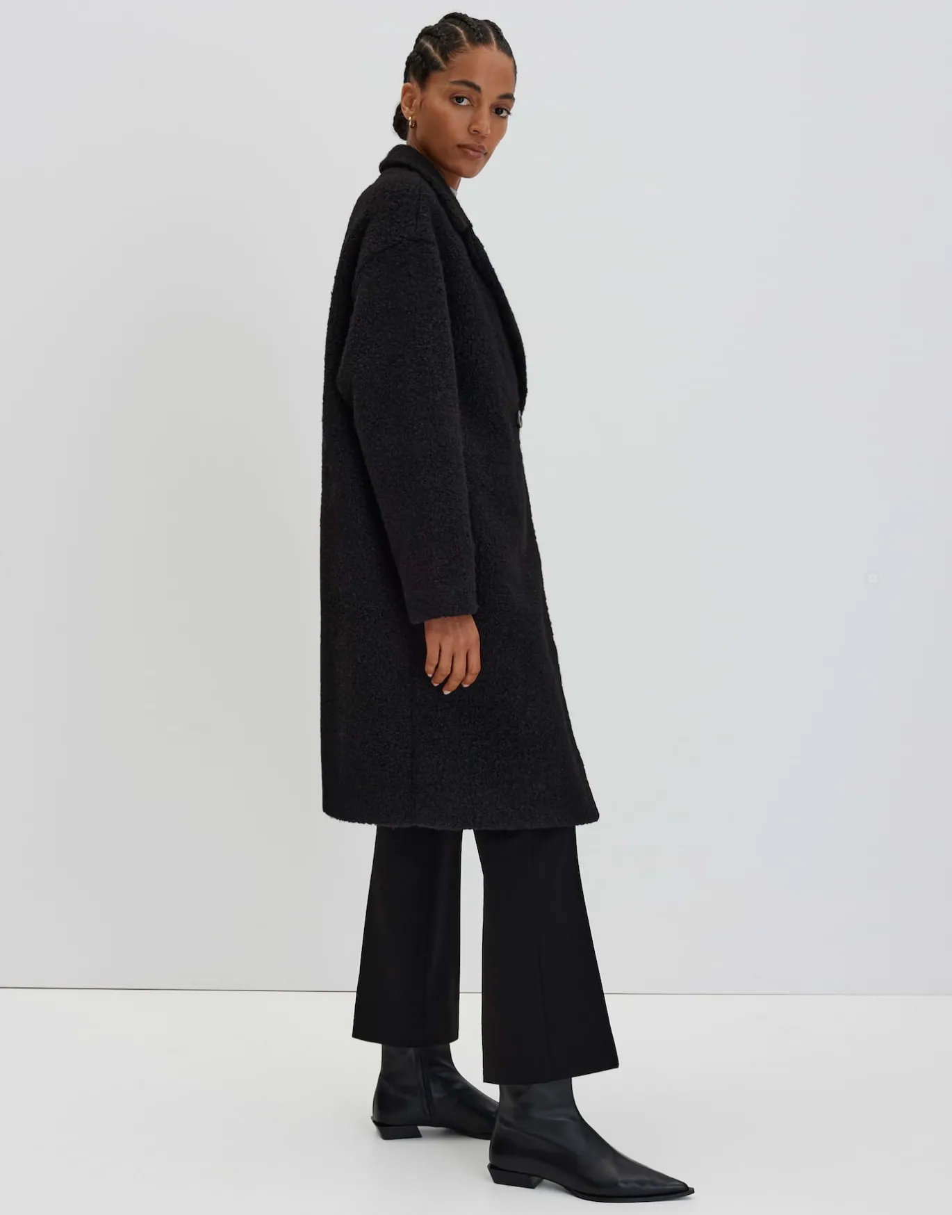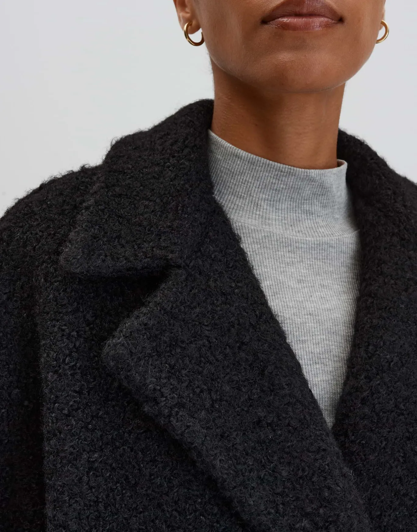Der Mantel aus einem weichen Viskose-Mix ist in modischer Fake Fur Optik gehalten. Durch die krause Struktur erhält der knielange Mantel eine dynamische Oberfläche. Über eine doppelte Knopfreihe lässt er sich verschließen.