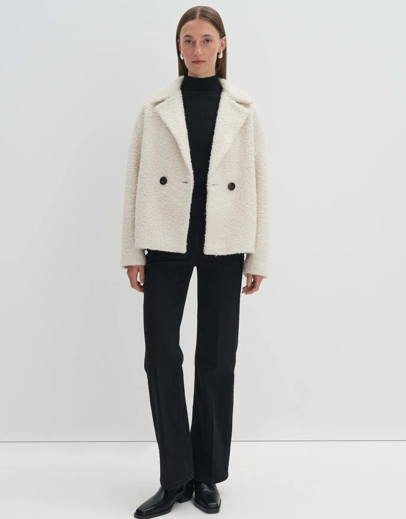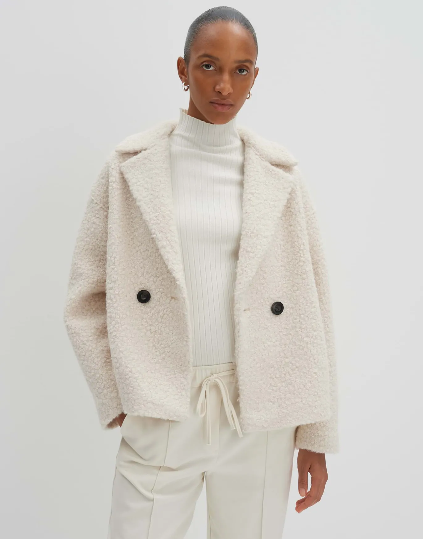Die Teddyjacke aus einer wollig anmutenden Bouclé Ware sorgt im Herbst und Winter für einen modischen und eleganten Look.
