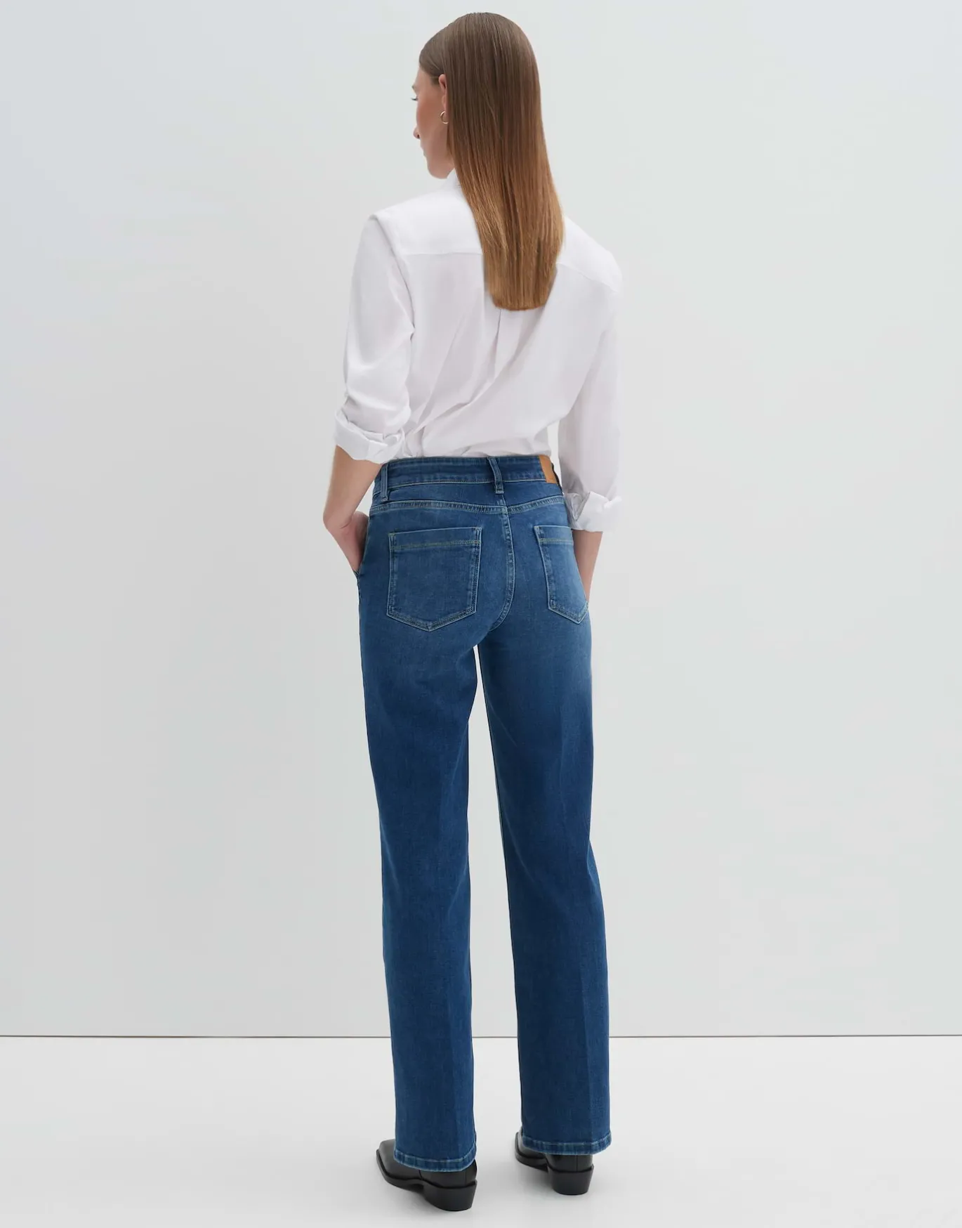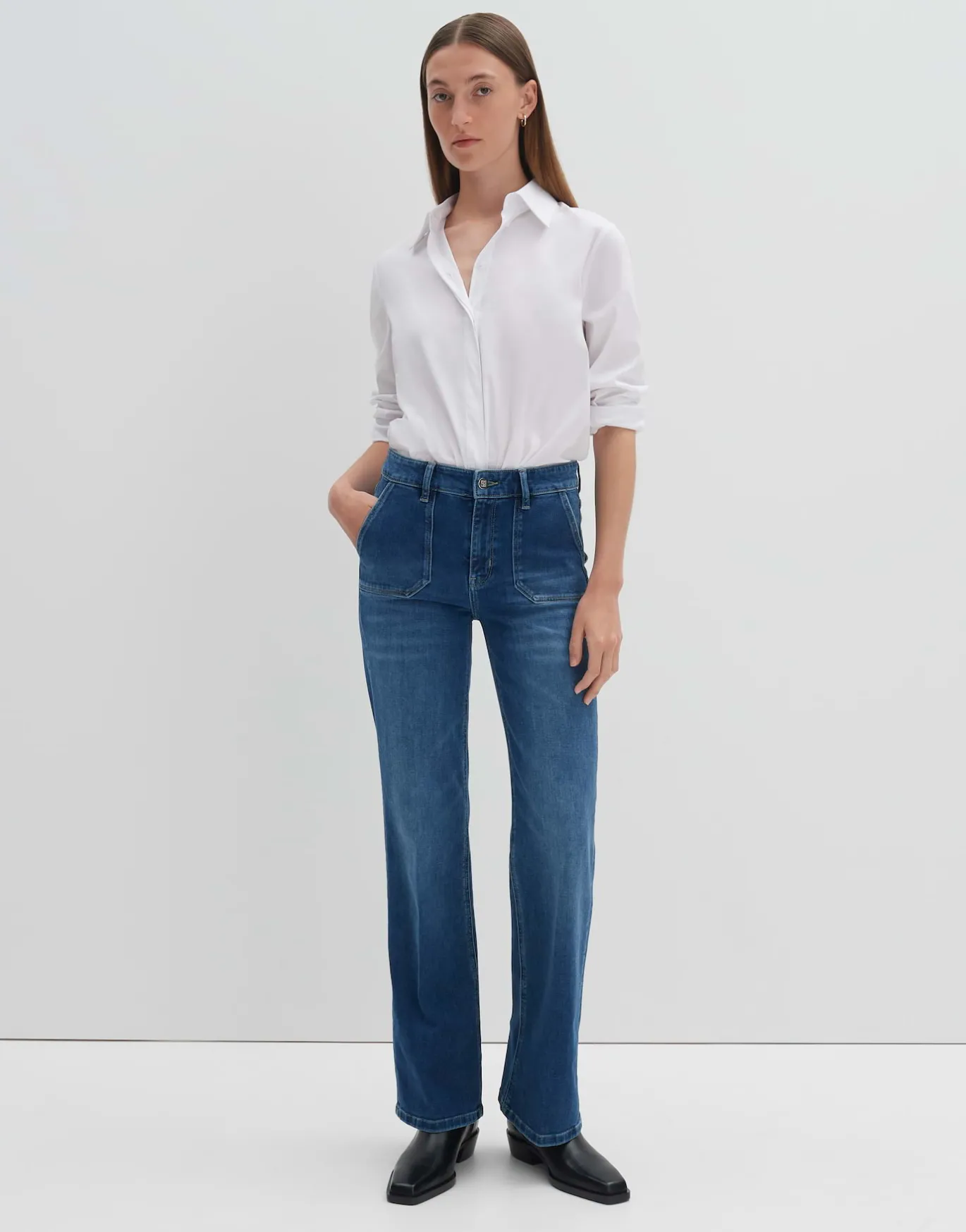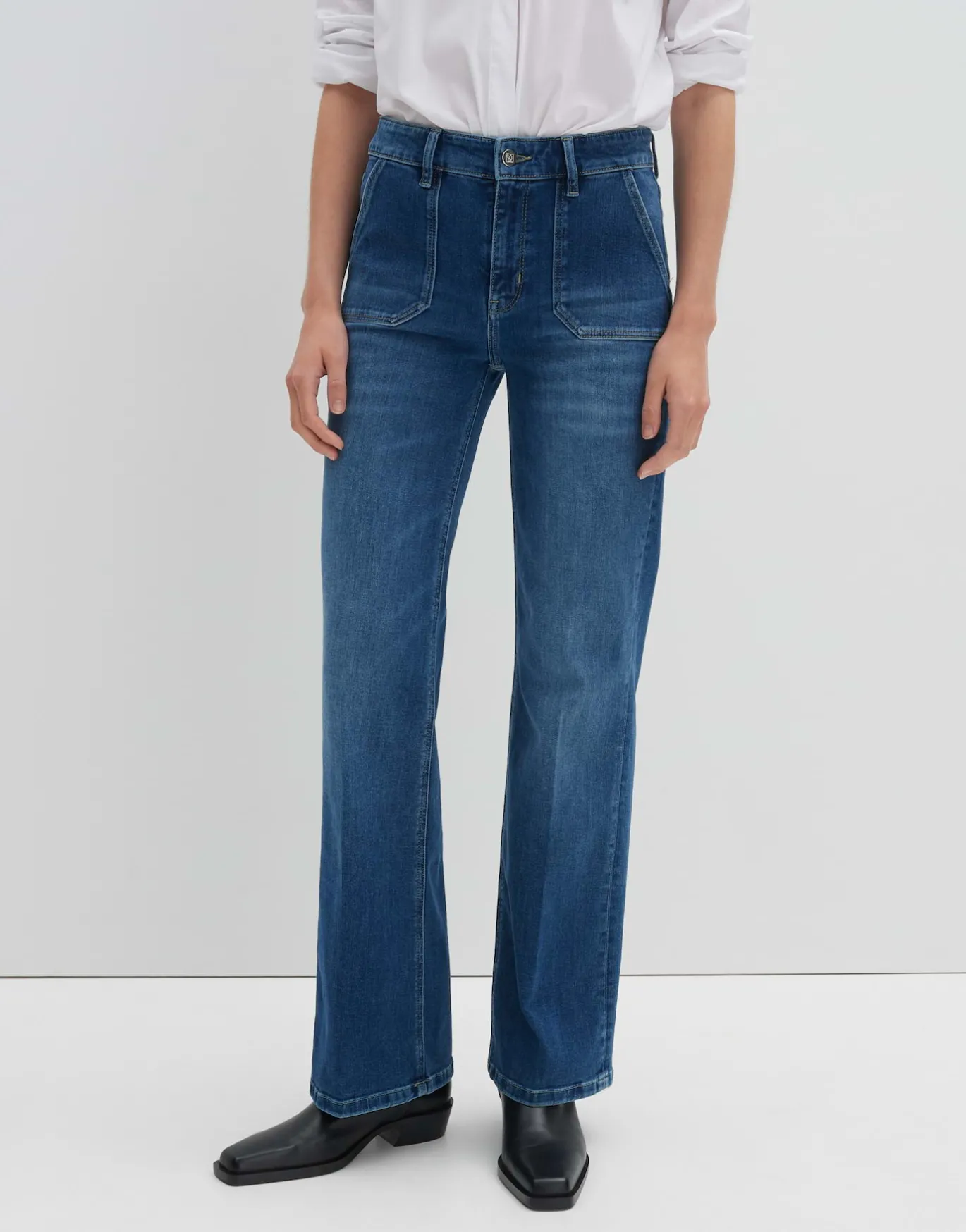 Die Flared Jeans überzeugt mit eckig abgesetzten Taschen im Utility Stil und setzt so einen coolen Akzent zum femininen Denim Look.