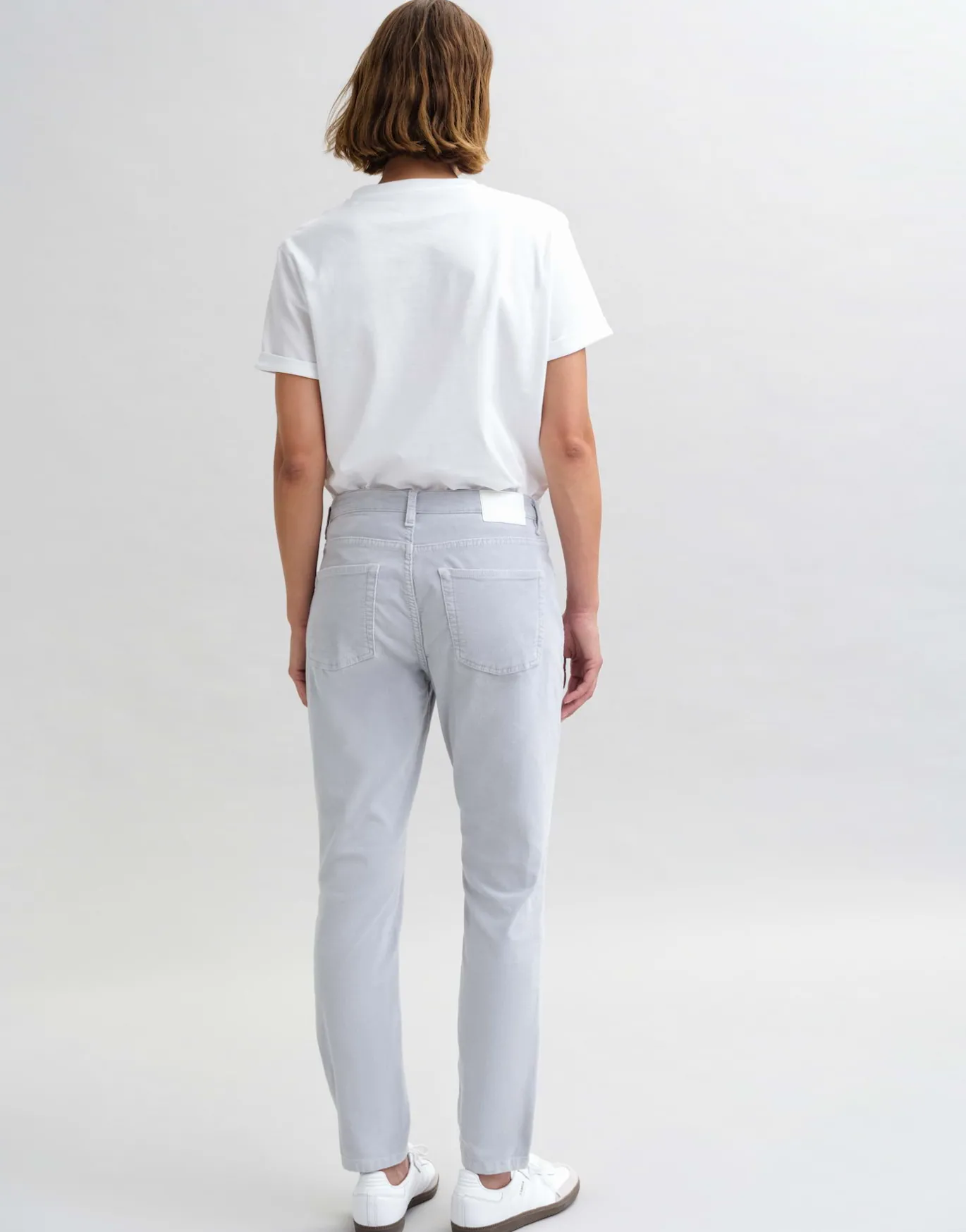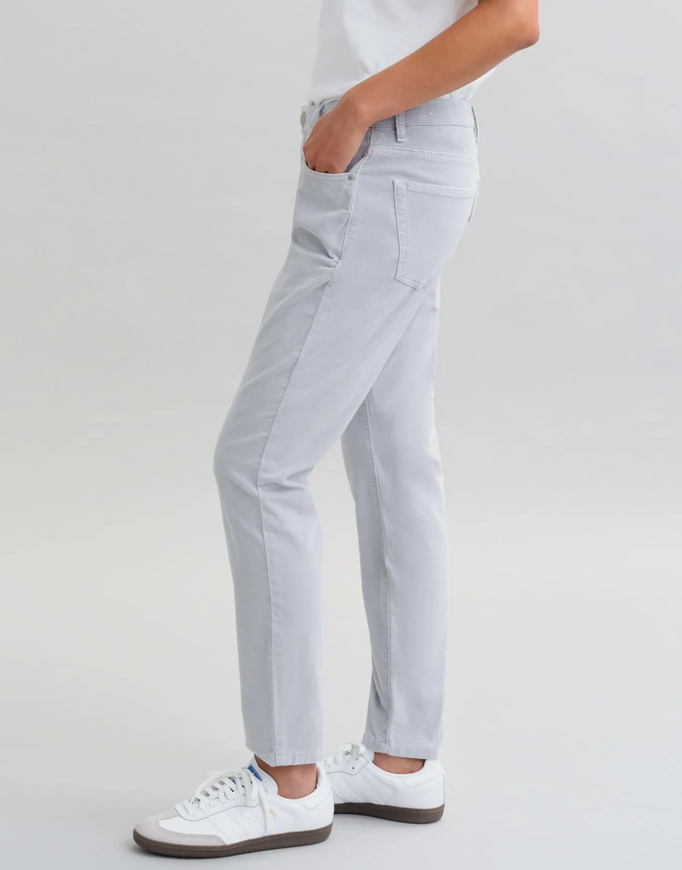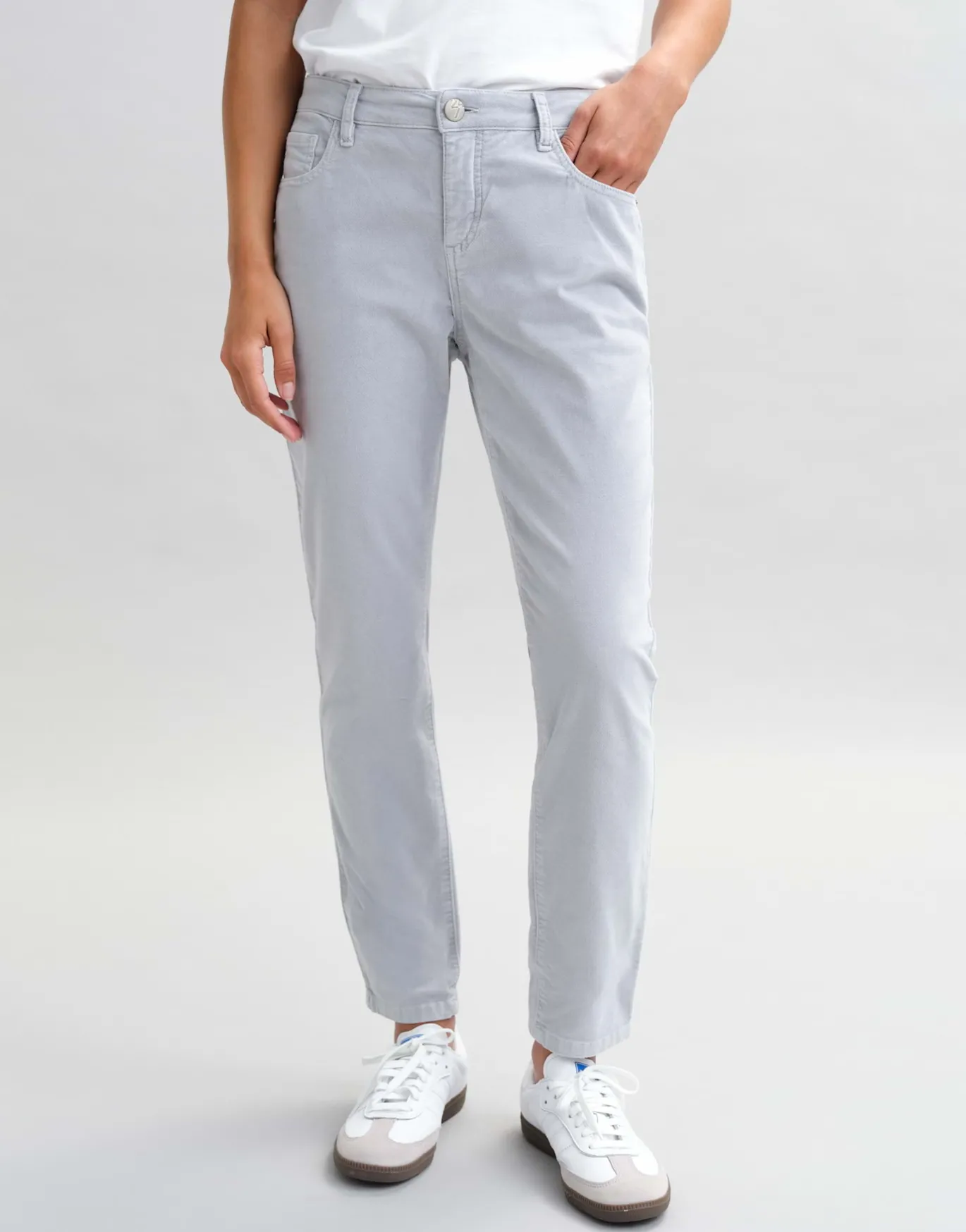 Die schmale Hose kommt durch die samtige Oberfläche mit einem extra weichem Tragekomfort daher und kreiert einen legeren Herbstlook.