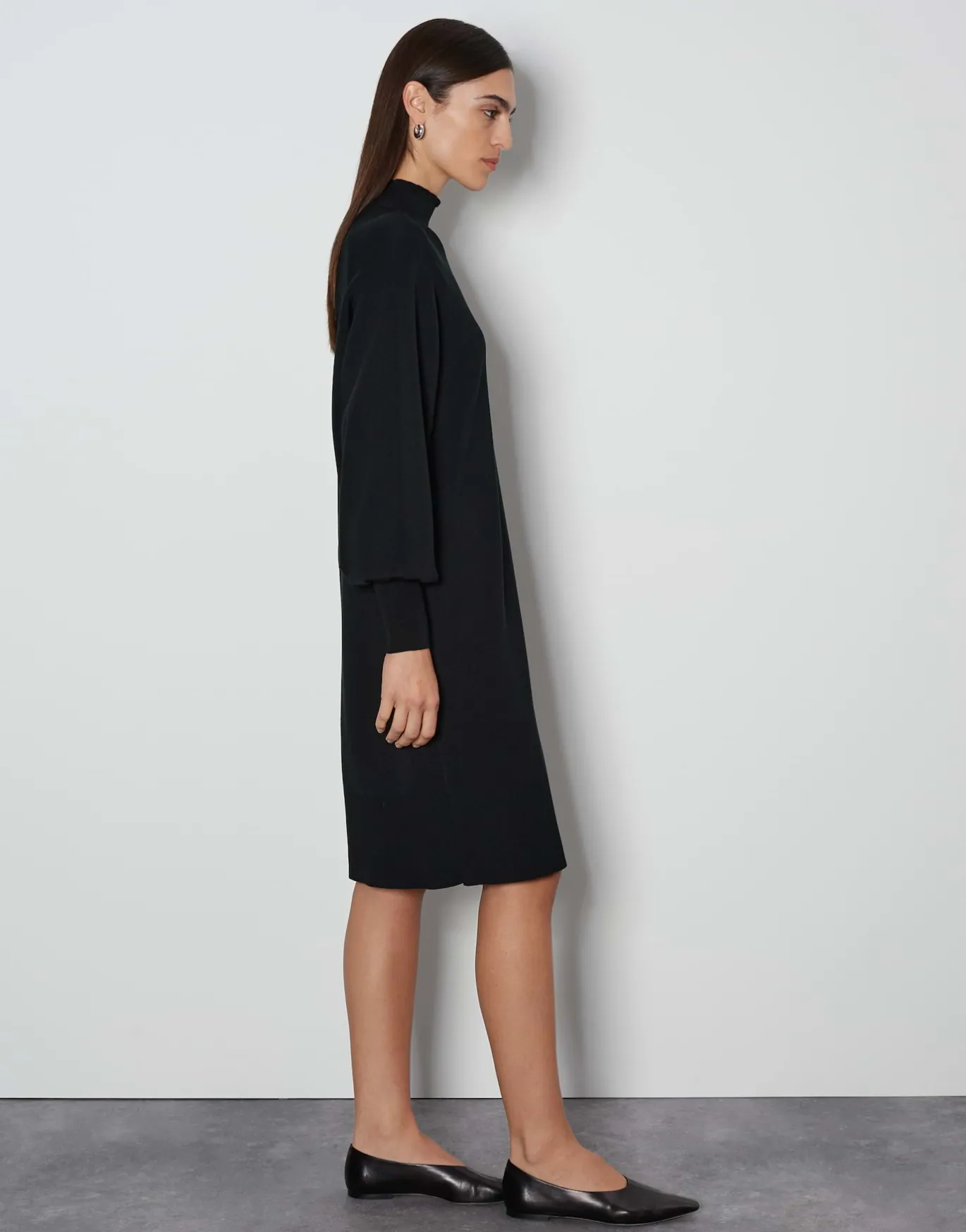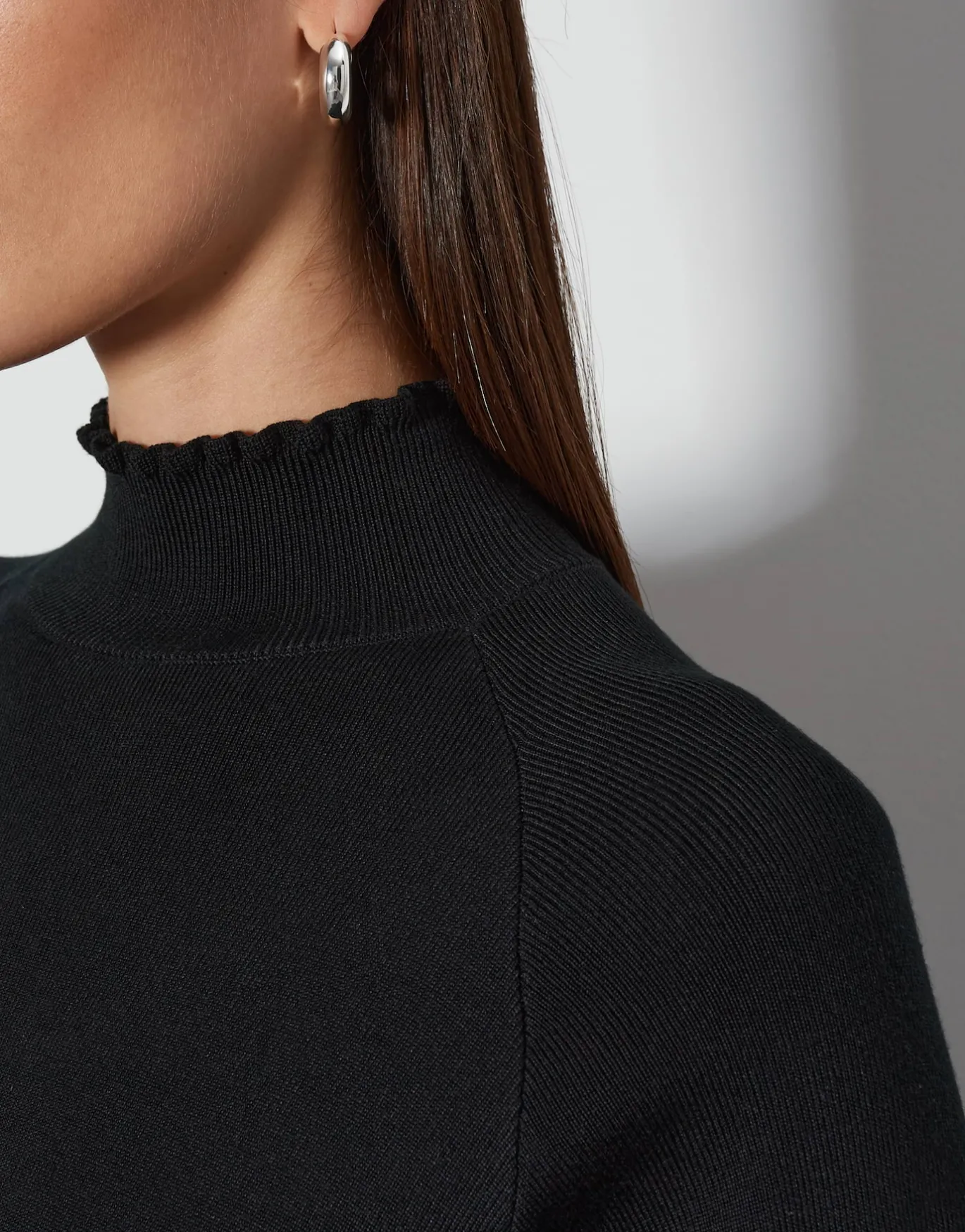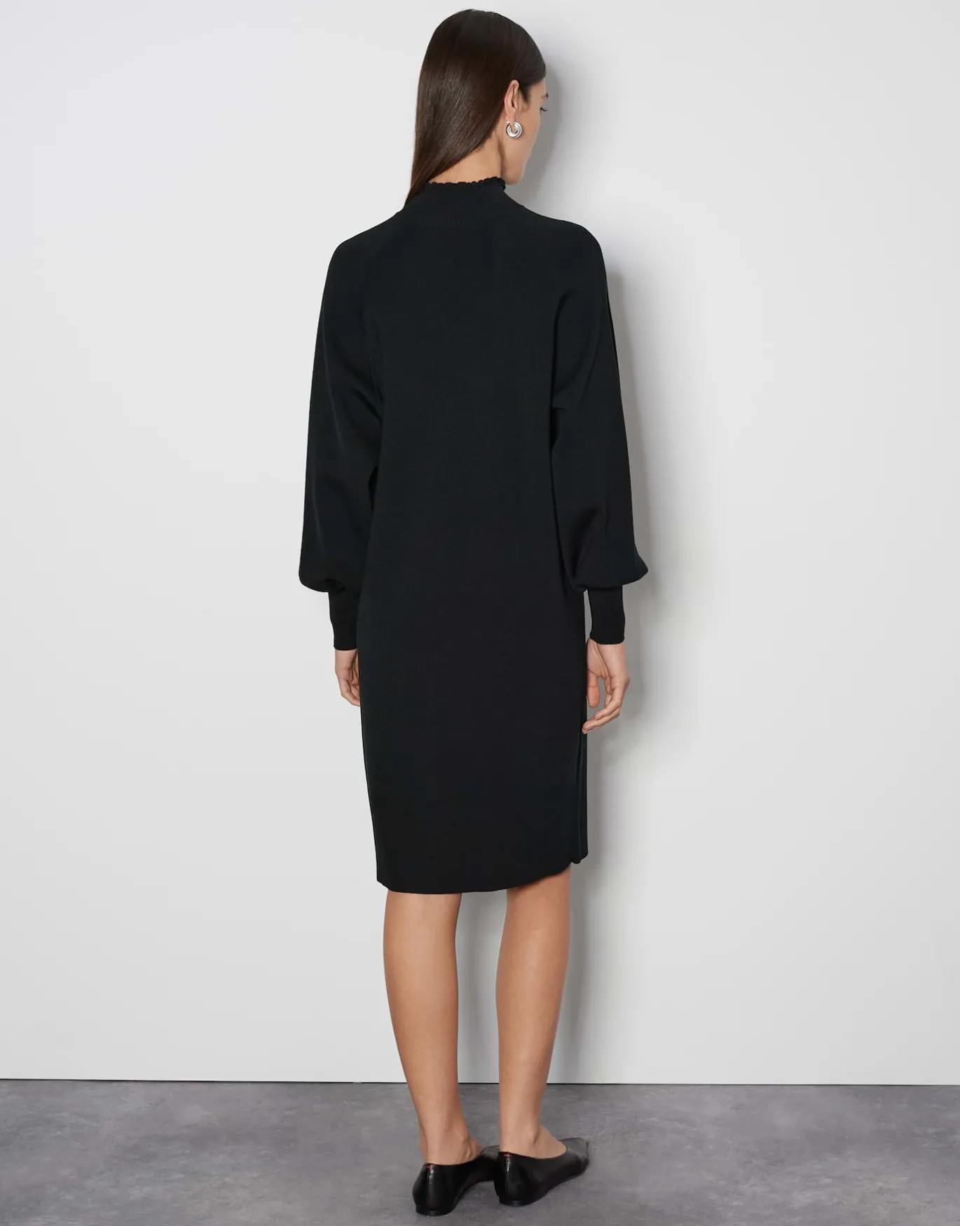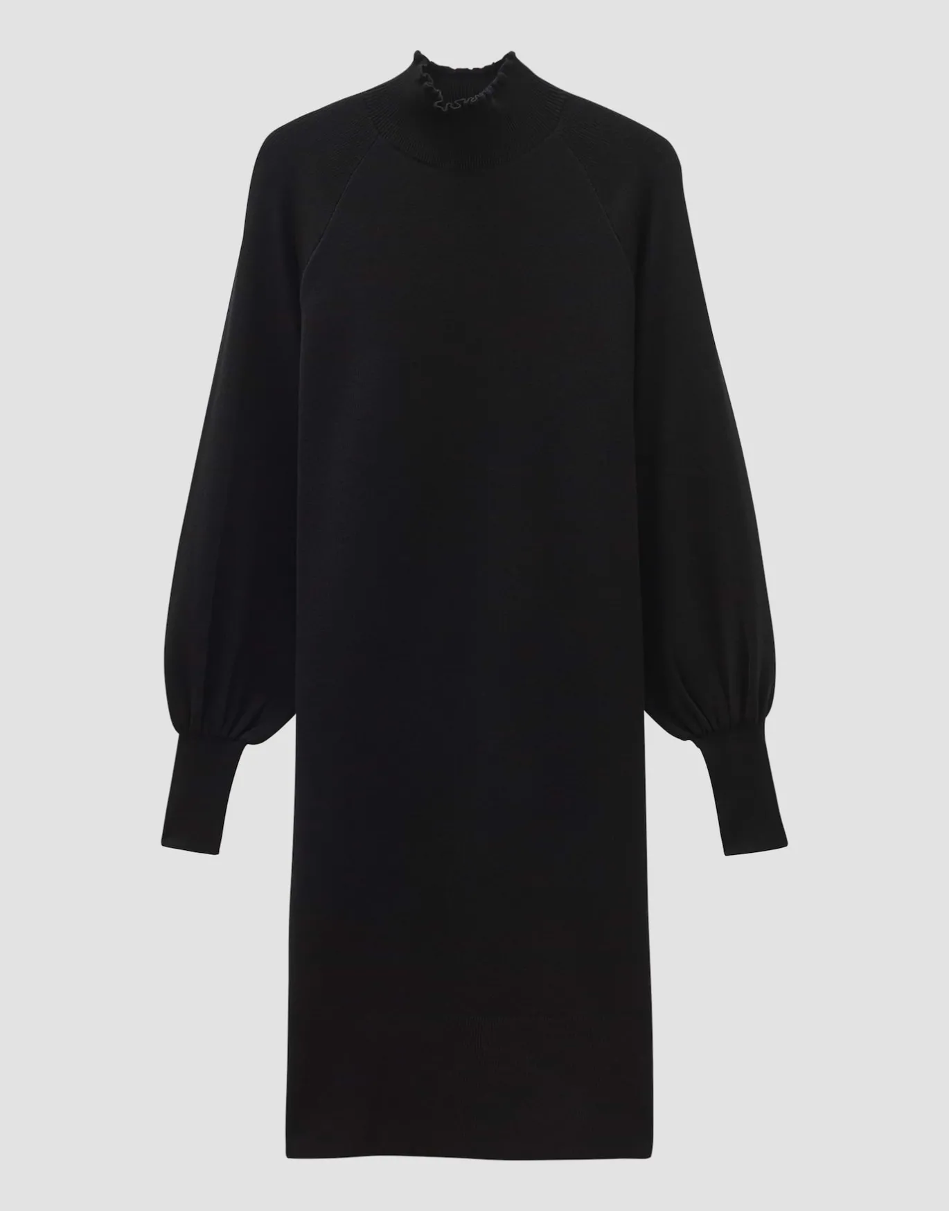 Das Strickkleid überzeugt mit schlichter Eleganz. Die voluminösen Ärmel und der gekräuselte Kragen sorgen für das gewisse Etwas.