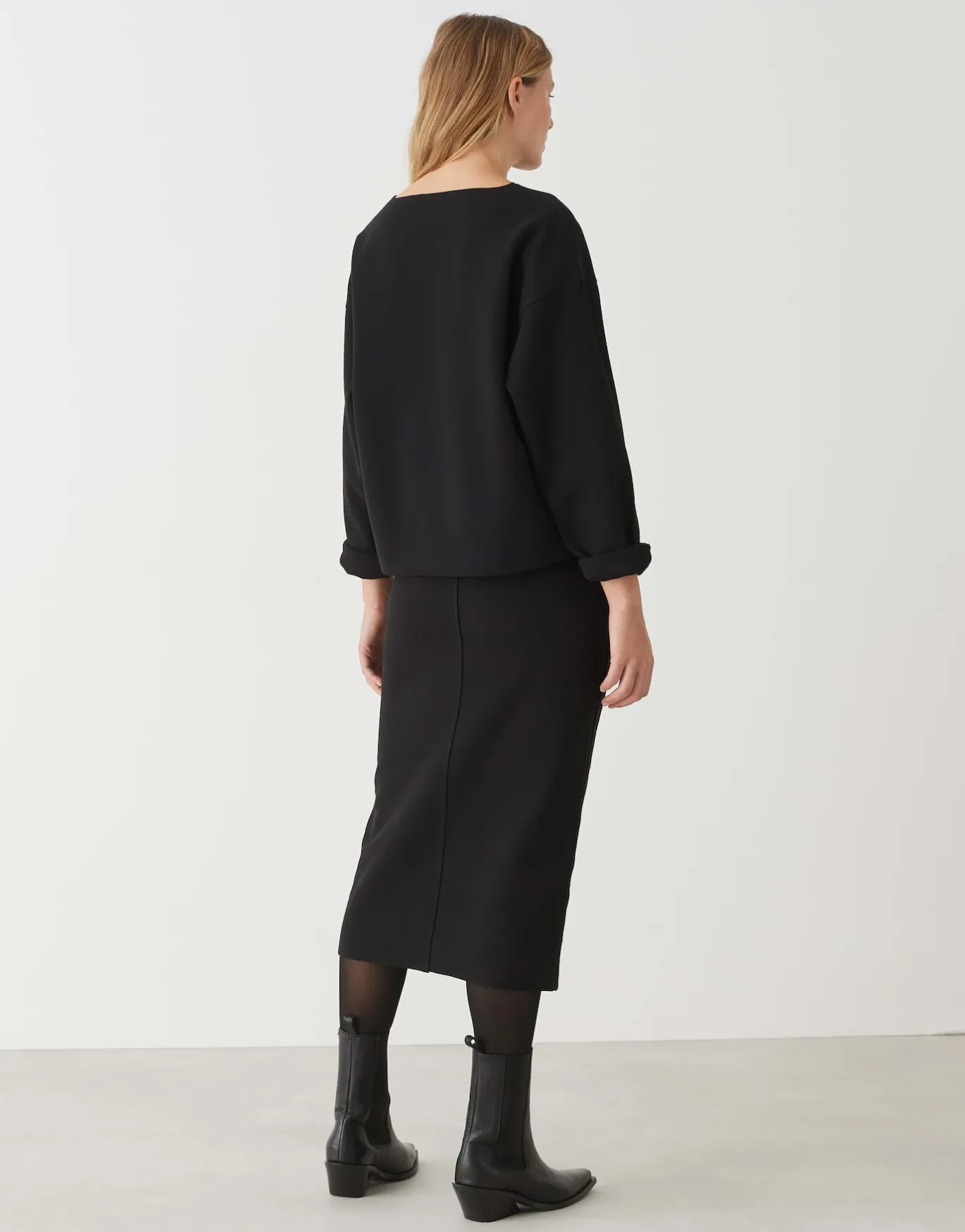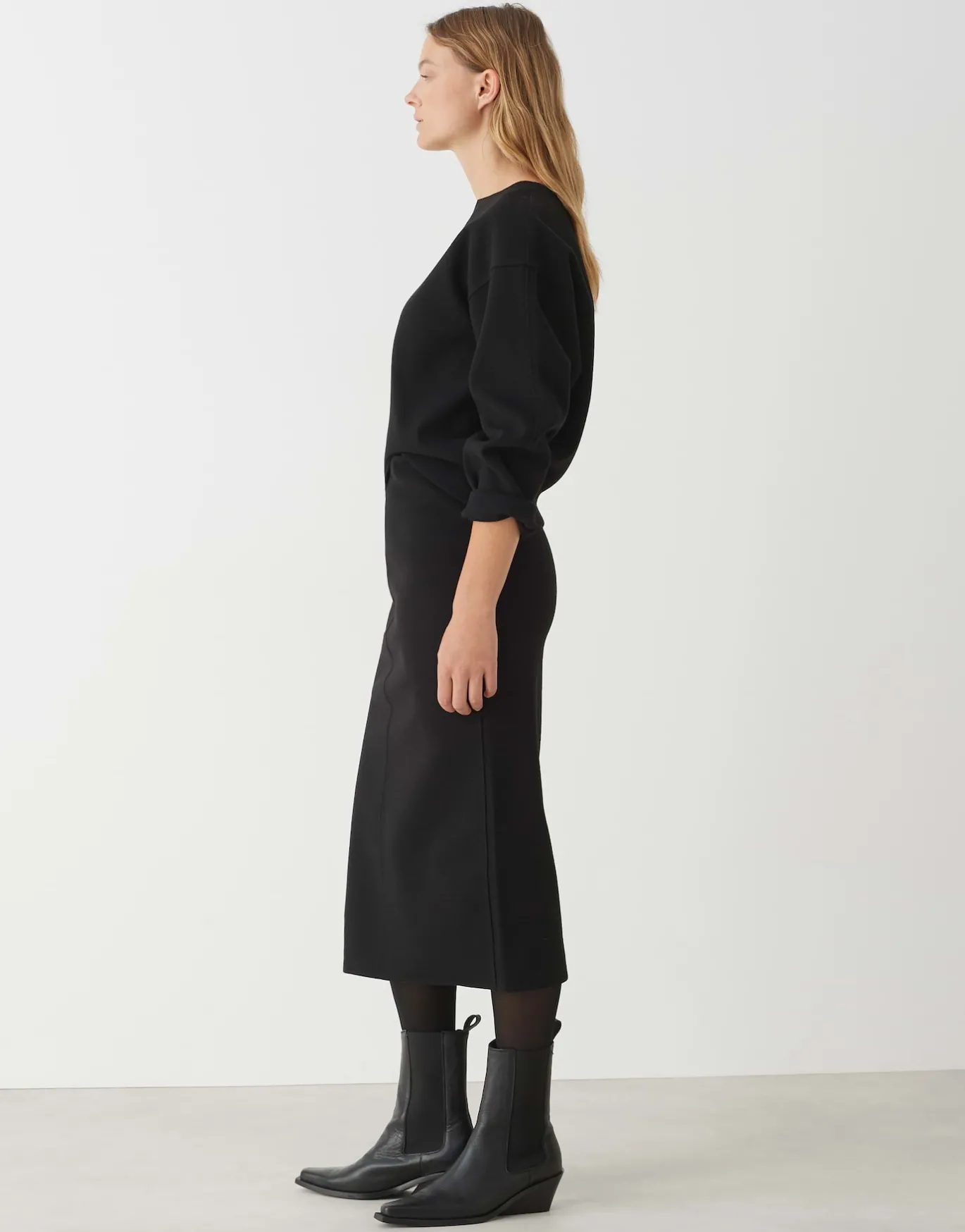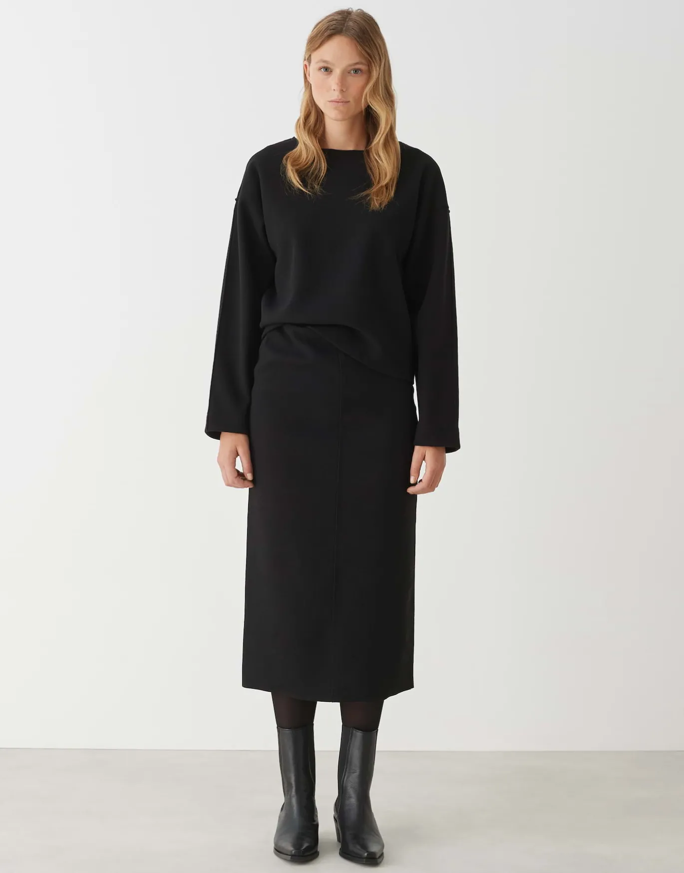 Der puristische Bleistiftrock ist in einer weichen, komfortablen Sweatware gefertigt und kreiert mit dem passenden Pullover einen lässigen Set Look für jeden Tag.
