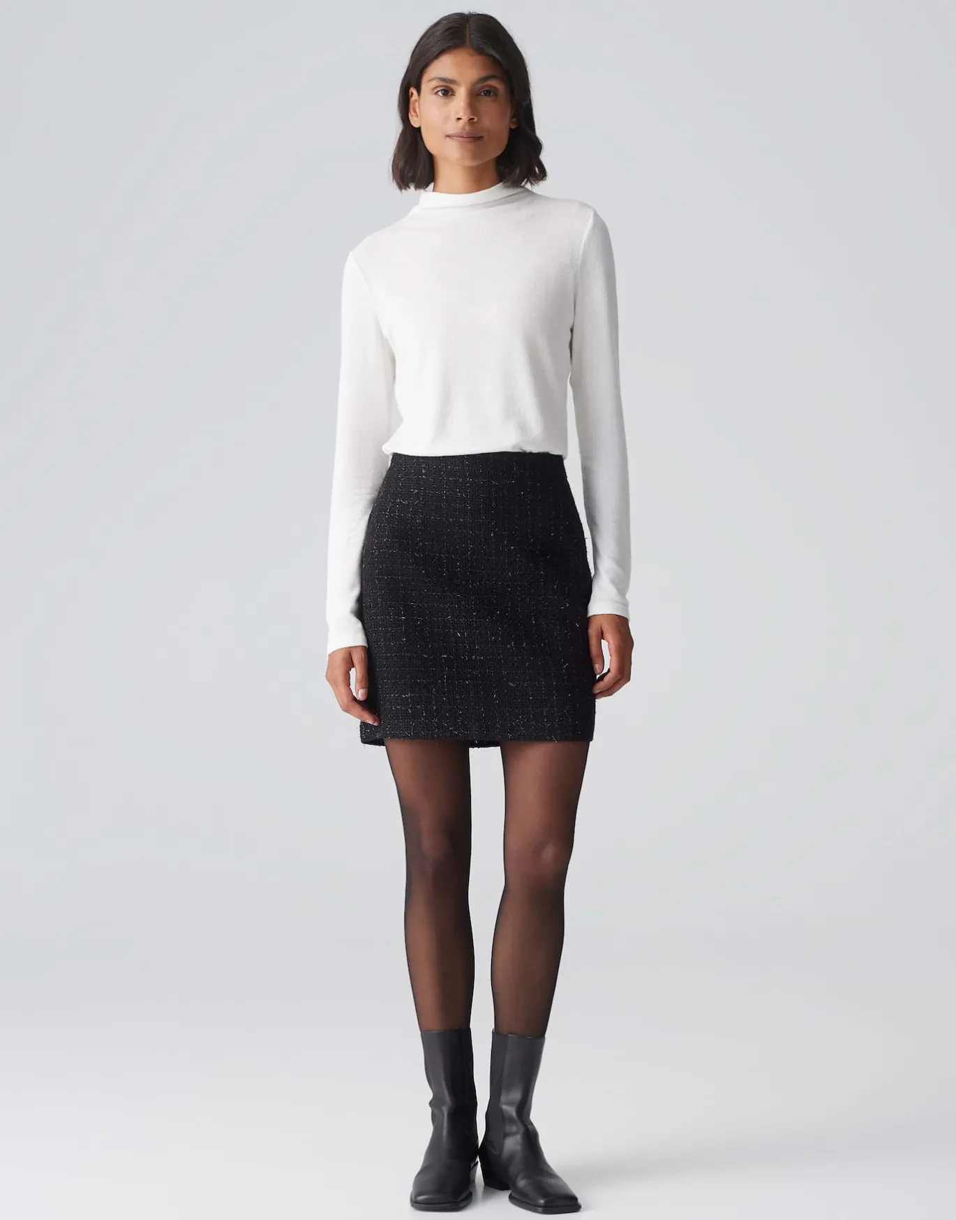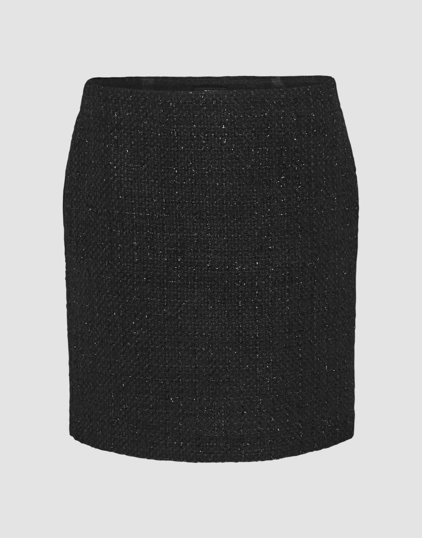 Der Minirock ist immer eine gute Wahl und kreiert durch die edle Bouclé-Ware mit den Glitzer Details feminine und elegante Momente.