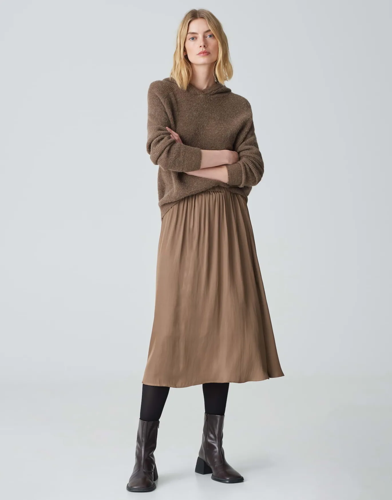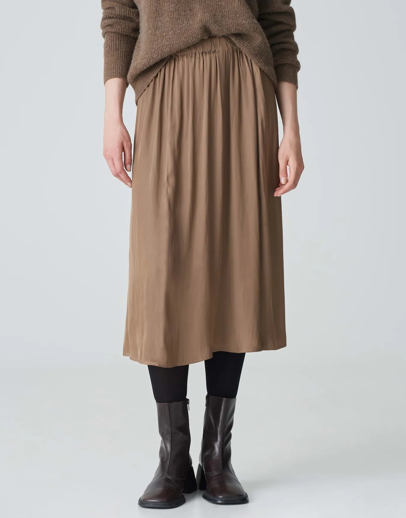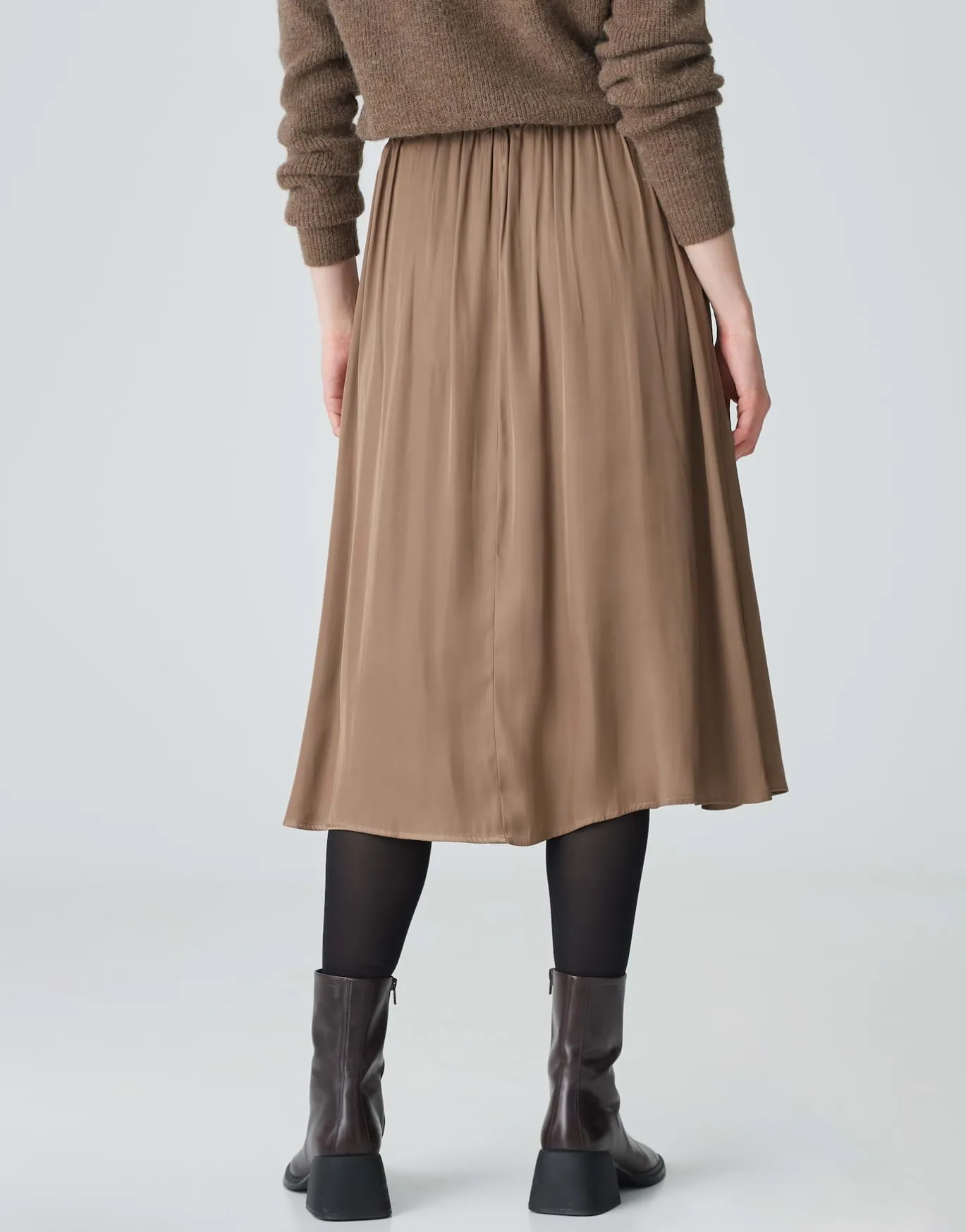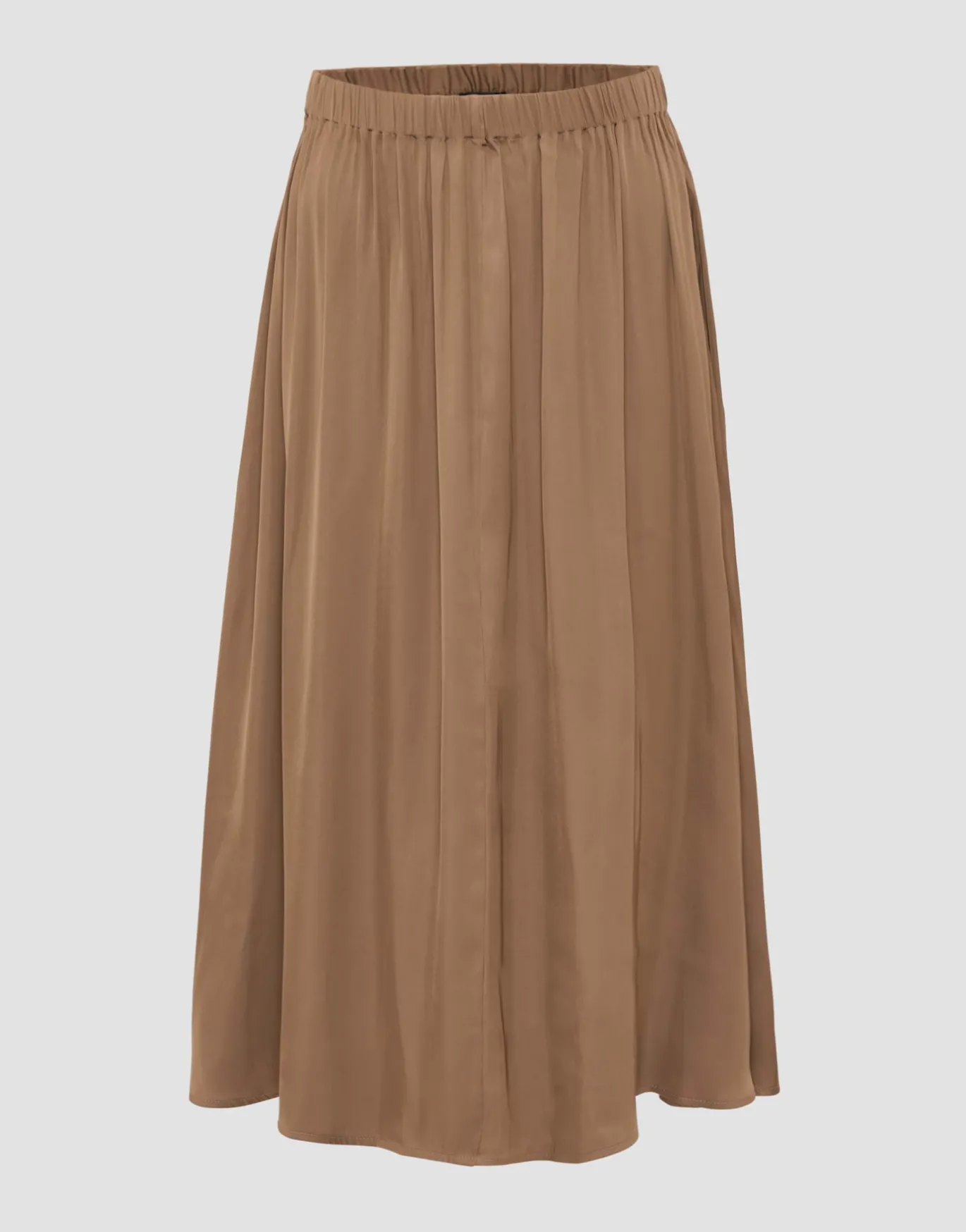 Der weichfallende Satinrock in schmeichelnder Midi-Länge begeistert mit einer glänzenden Oberfläche und kann mit den passenden Pieces sowohl leger als auch elegant gestylt werden.