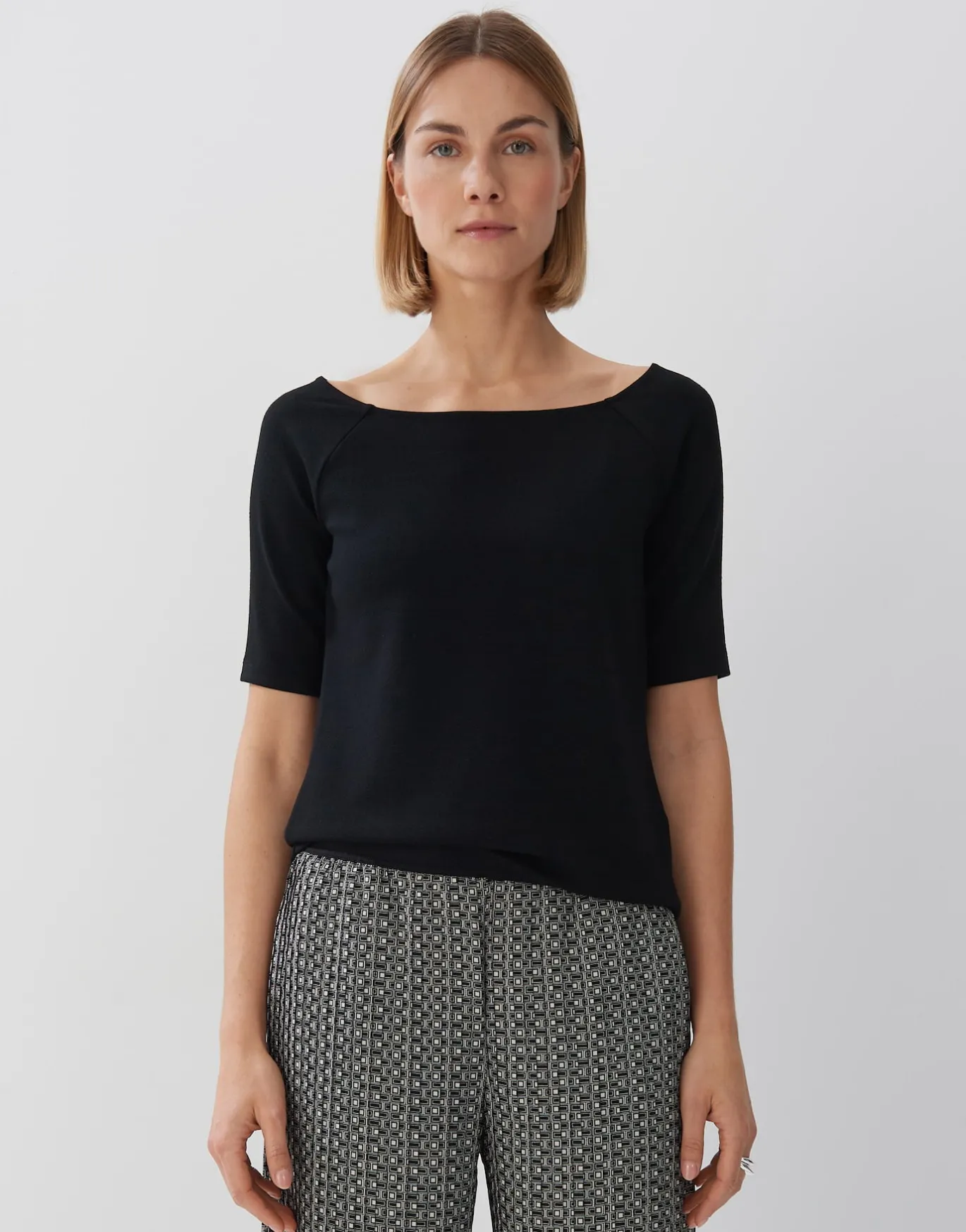 Das Shirt setzt den Fokus auf den weiten Ausschnitt der einen schmeichelnden Off-Shoulder-Effekt erzeugt.