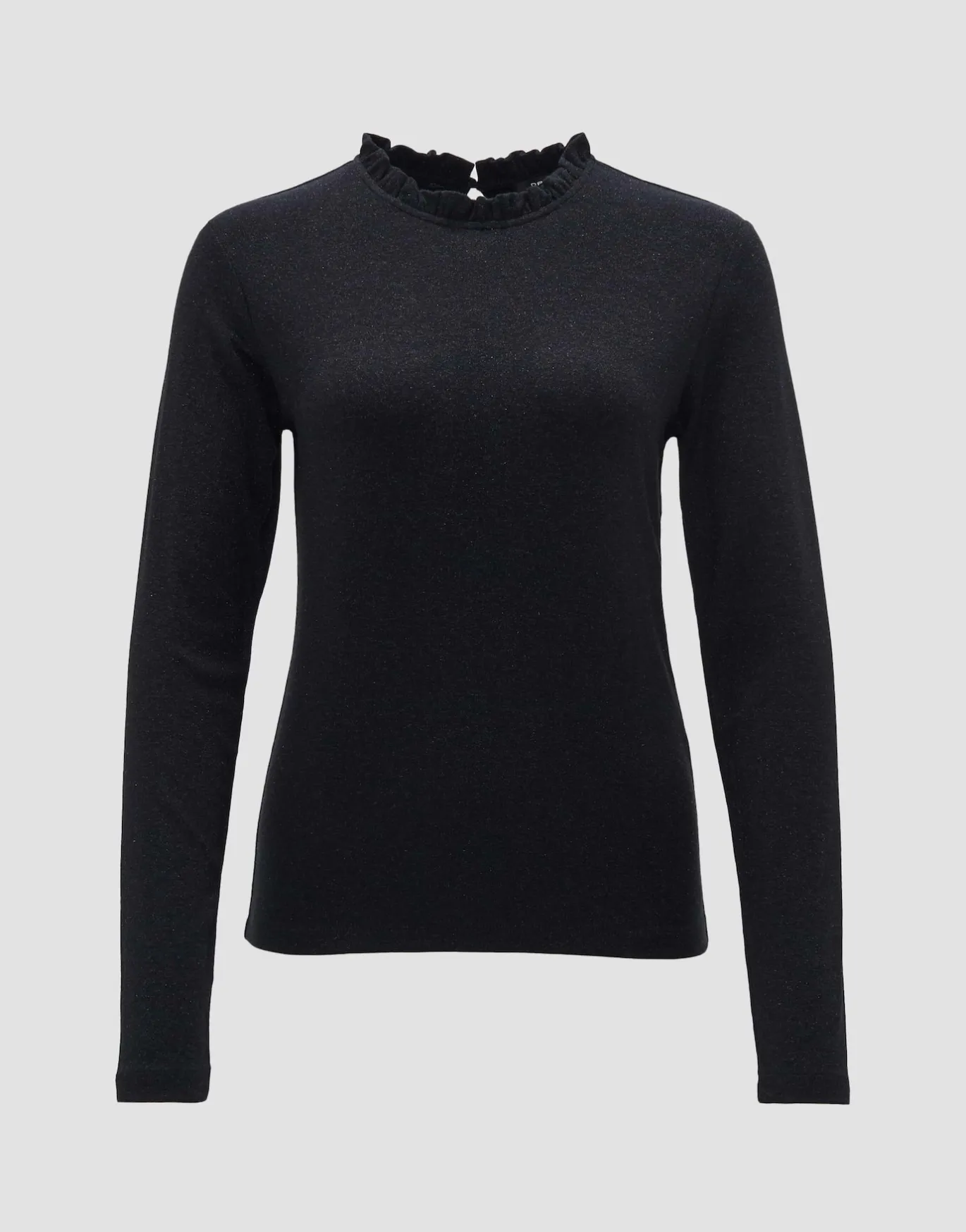Das Shirt legt den Fokus auf die Rüschenkante am Kragen und dem Schlitz Detail im Rücken – für einen femininen Look.