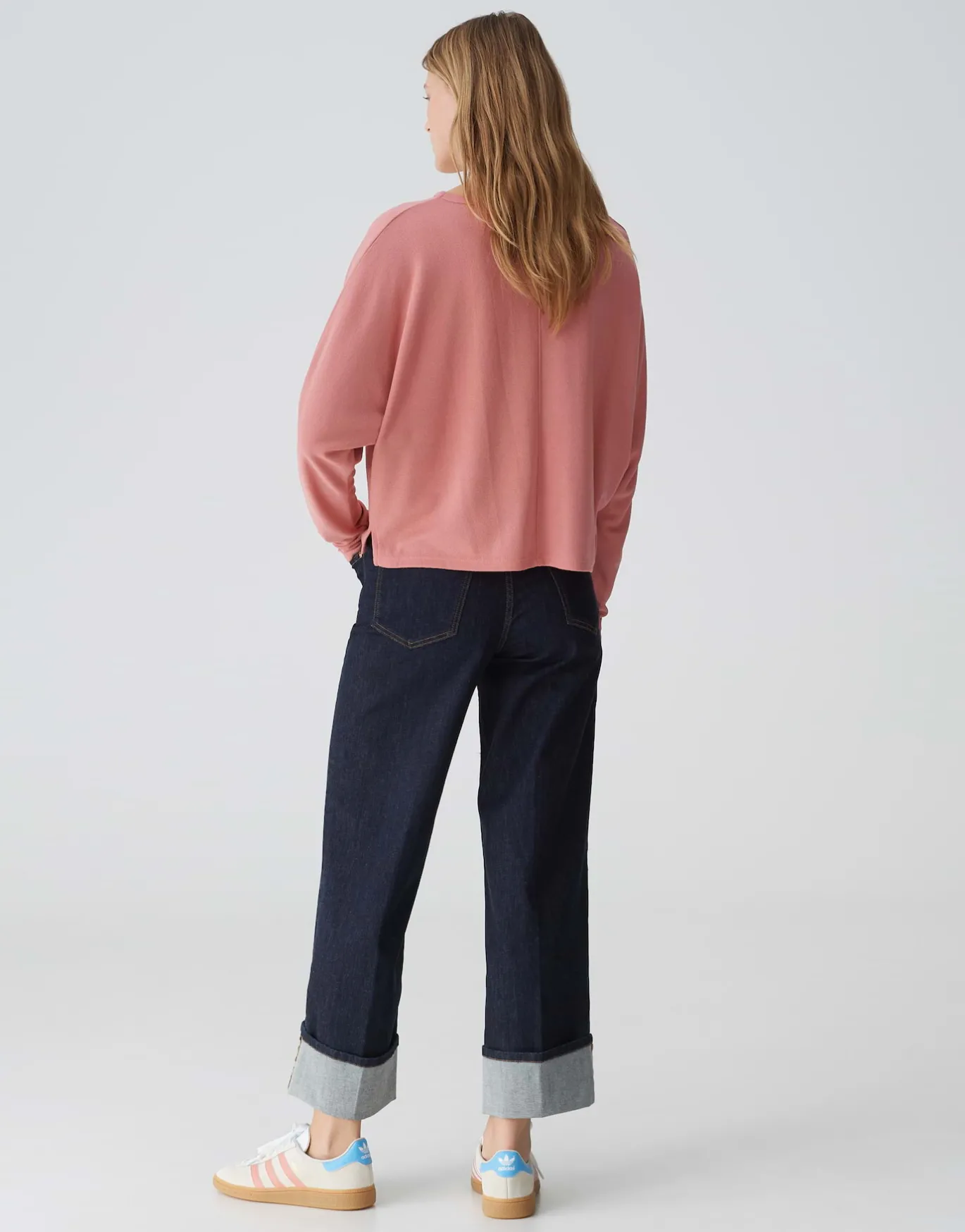 Das minimalistische Shirt in Feinstrick Optik und lässiger Batwing Silhouette kreiert einen unkomplizierten Casual Look.