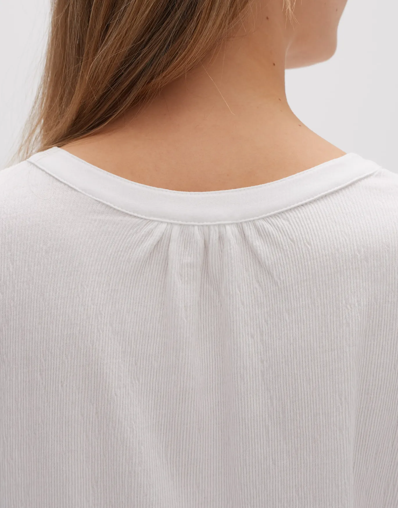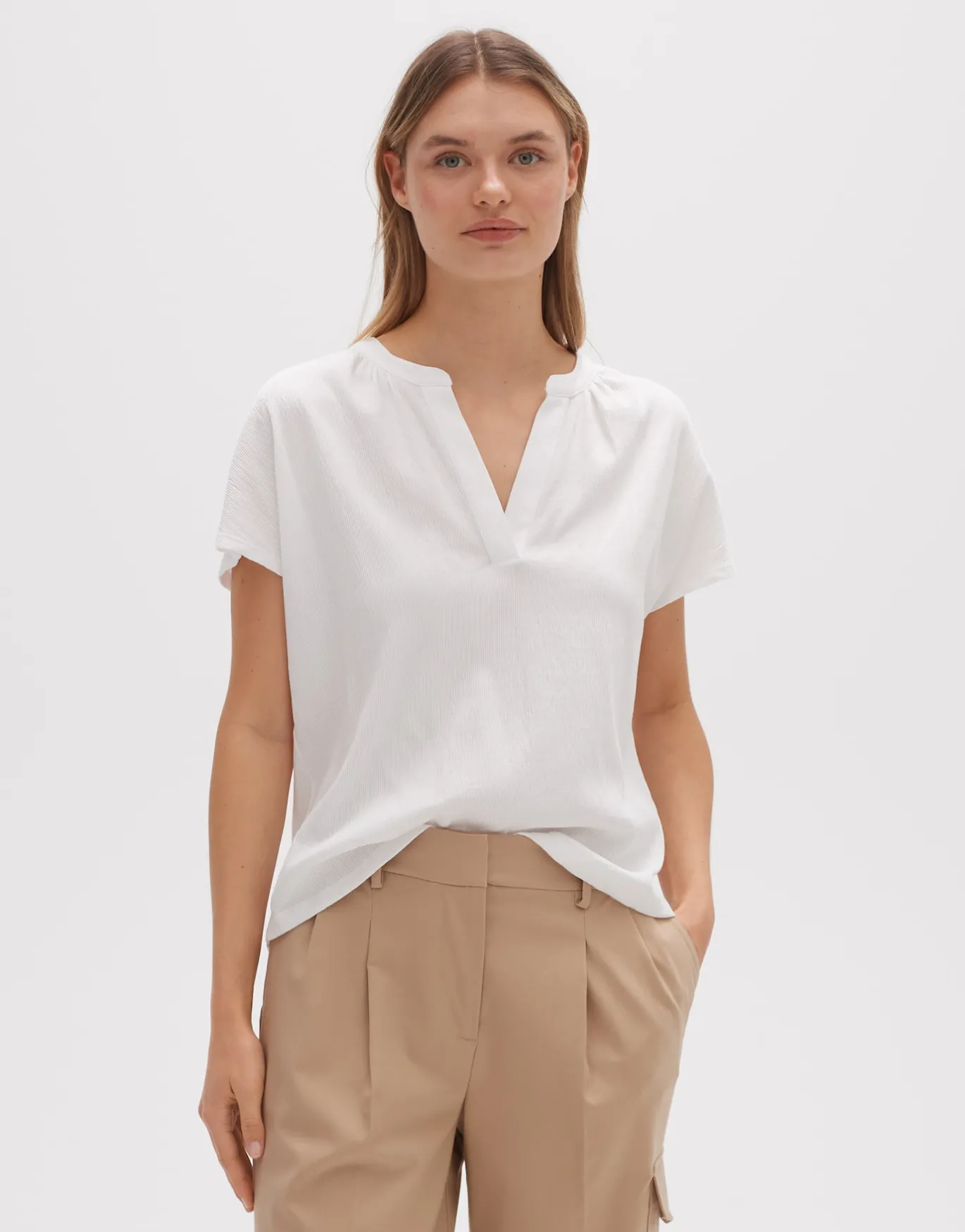 Das Shirt aus einem BCI Cotton Mix ist mit raffinierten Details versehen. Eine feine Struktur aus Längsstreifen sorgt für eine dynamische Oberfläche. Kleine Raffungen am Ausschnitt versprechen einen schönen Fall.
