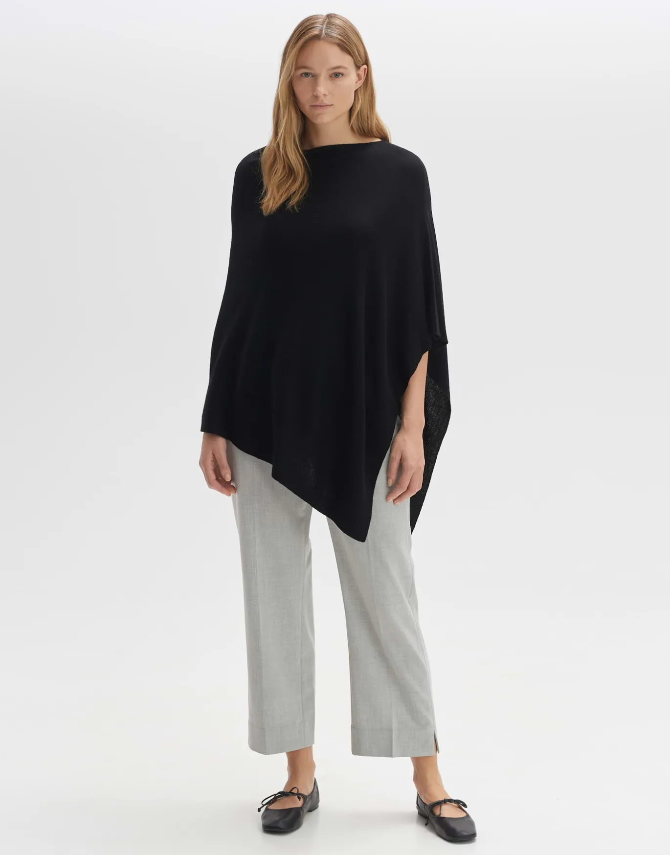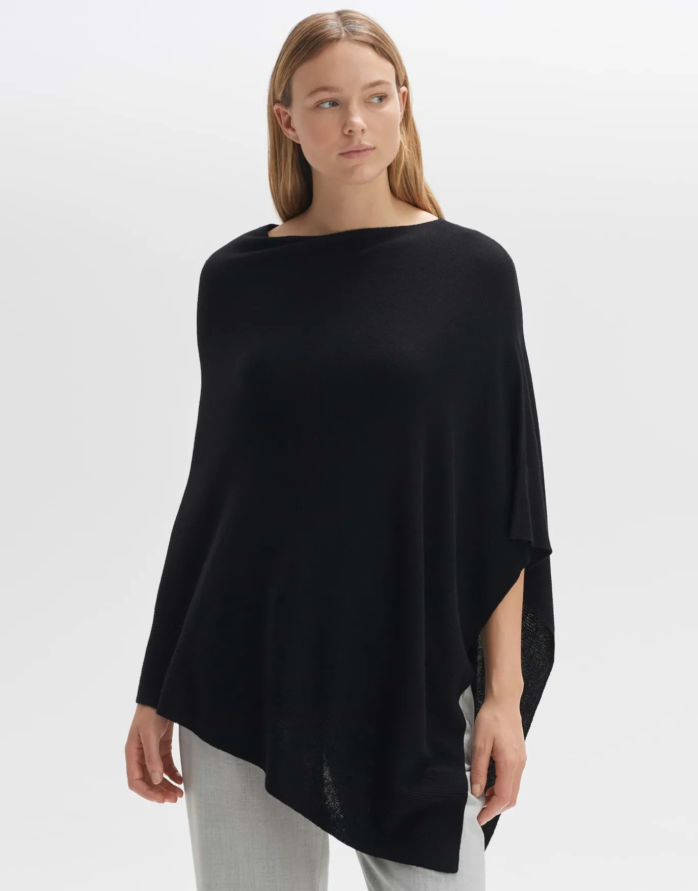 Der Poncho in feiner Strick-Qualität ist der perfekte Begleiter für die Übergangszeit und kann durch die einheitliche, weite Passform vielfältig kombiniert werden. Der asymmetrische Saum bringt zusätzlich eine schöne Spannung in die Looks.