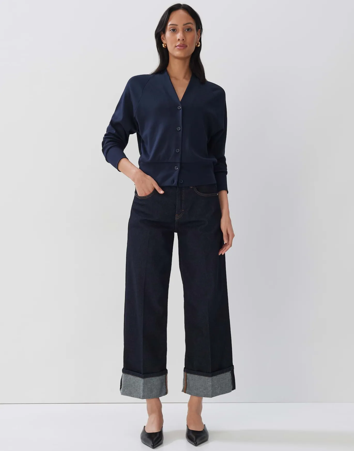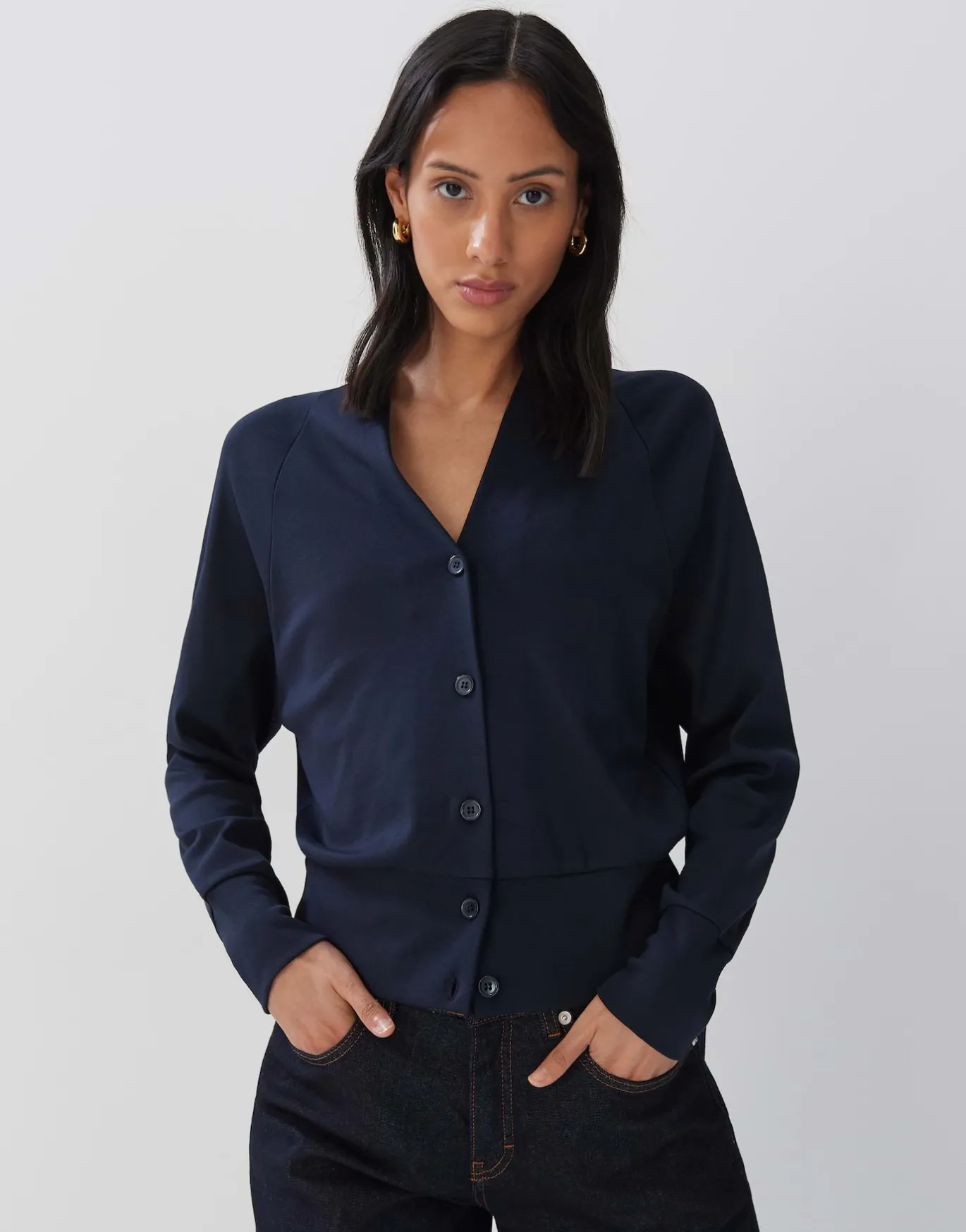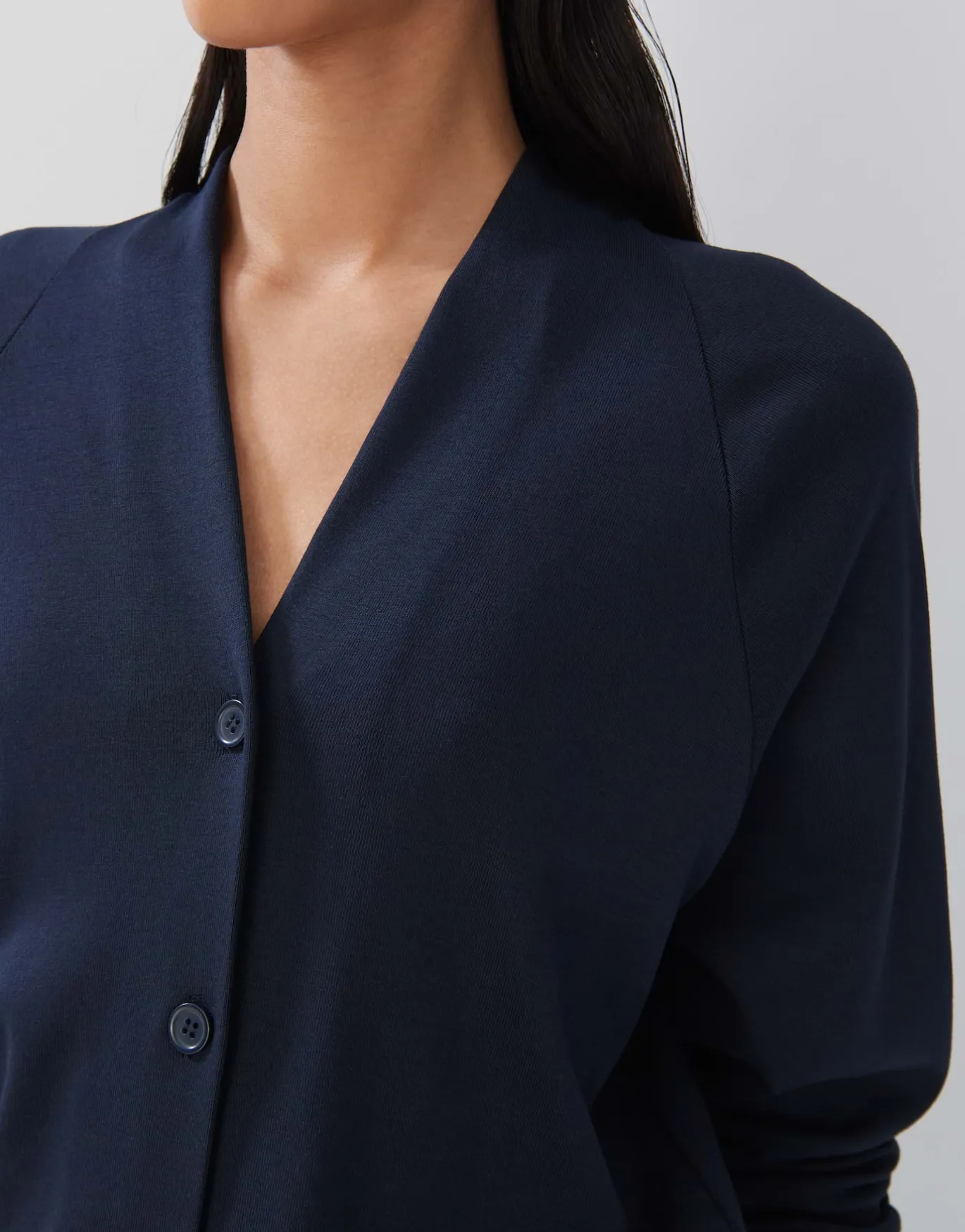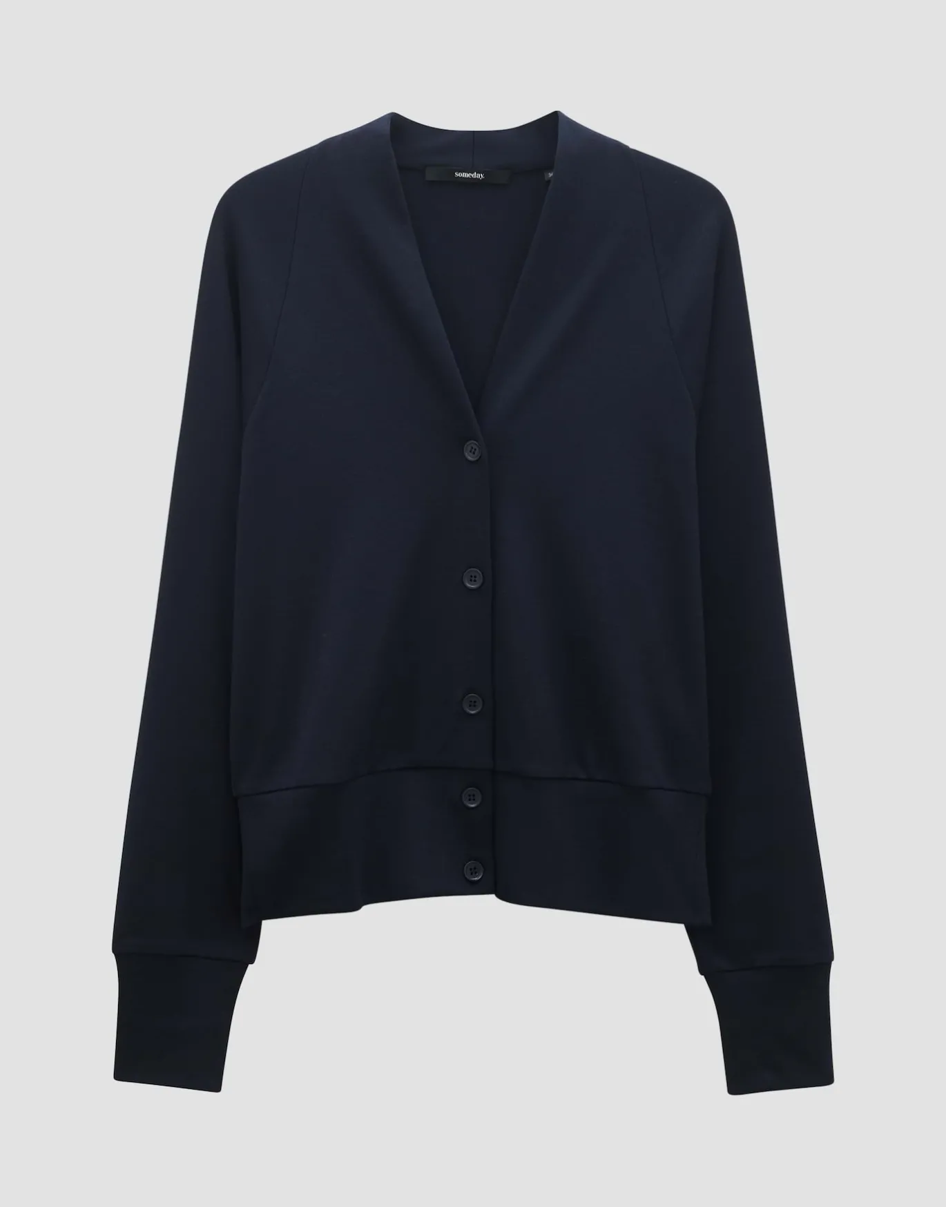 Die Sweatjacke überzeugt mit der Funktionalität und Form einer Strickjacke gespielt über super weichen Jersey.