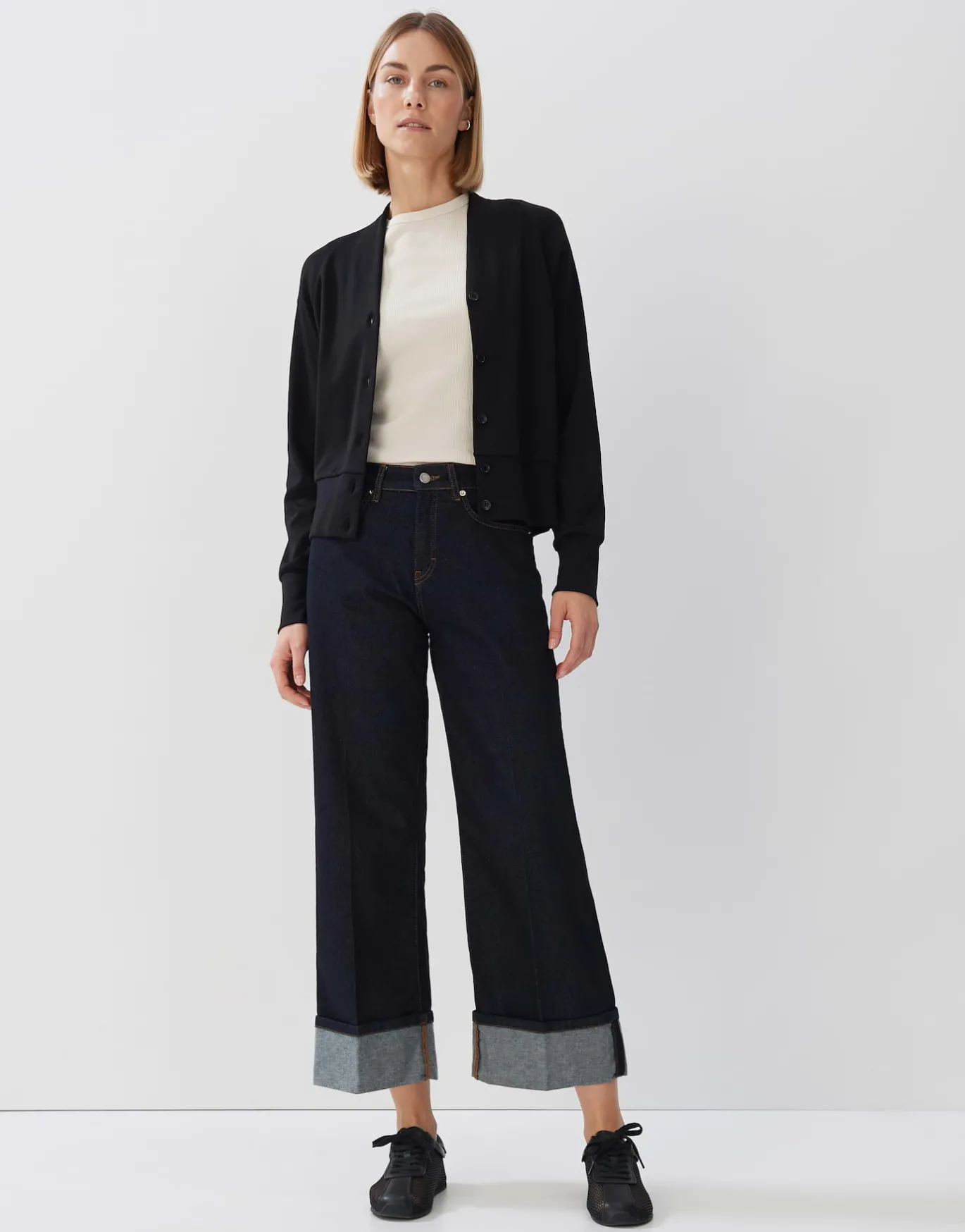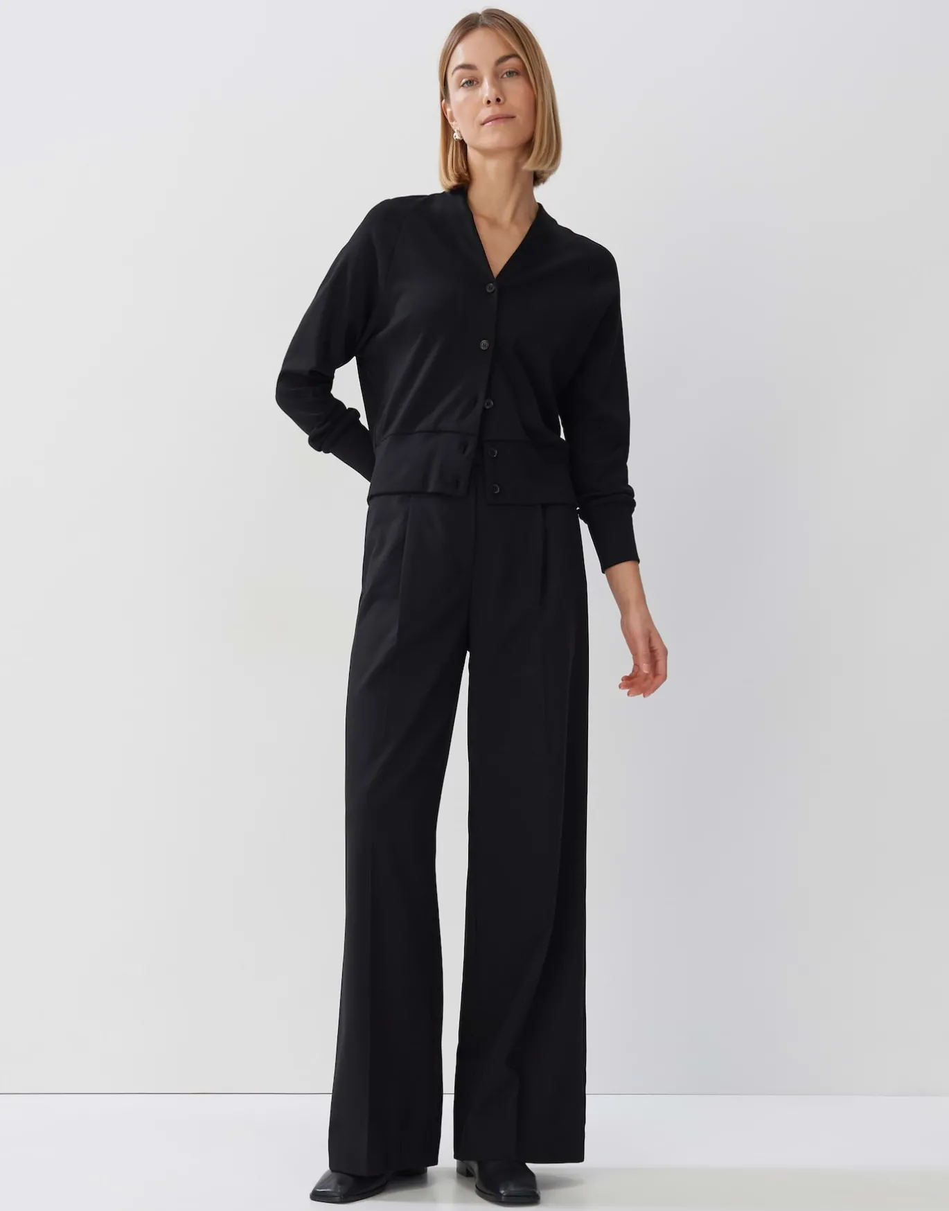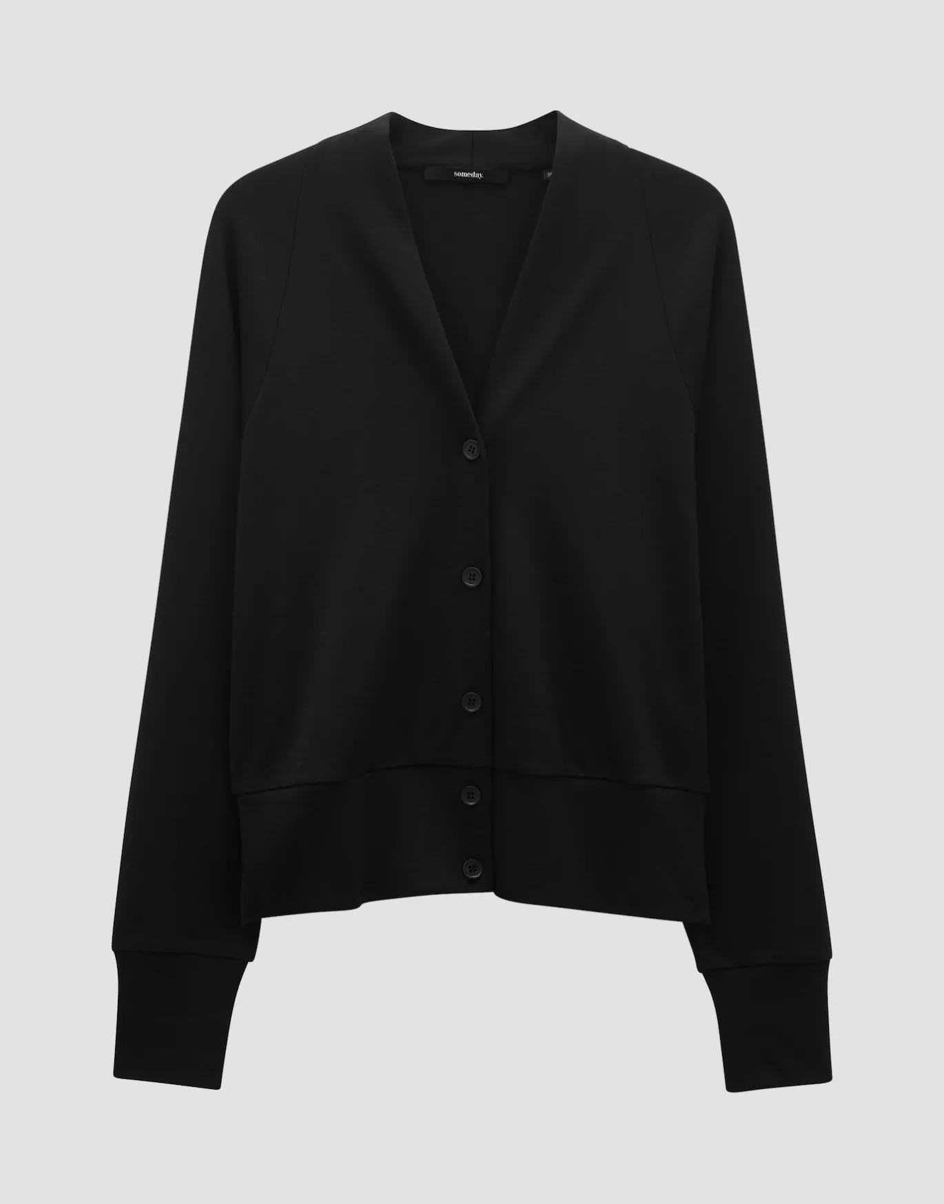 Die Sweatjacke überzeugt mit der Funktionalität und Form einer Strickjacke gespielt über super weichen Jersey.