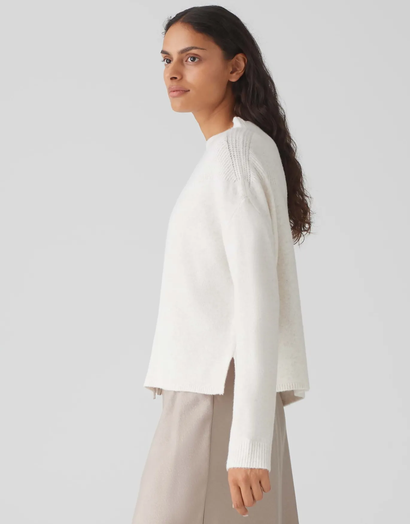 Der Feinstrickpullover überrascht mit einem ultra weichen Kaschmir Feeling und legt mit der dezenten Rippstruktur den Fokus auf die Kragenpartie.