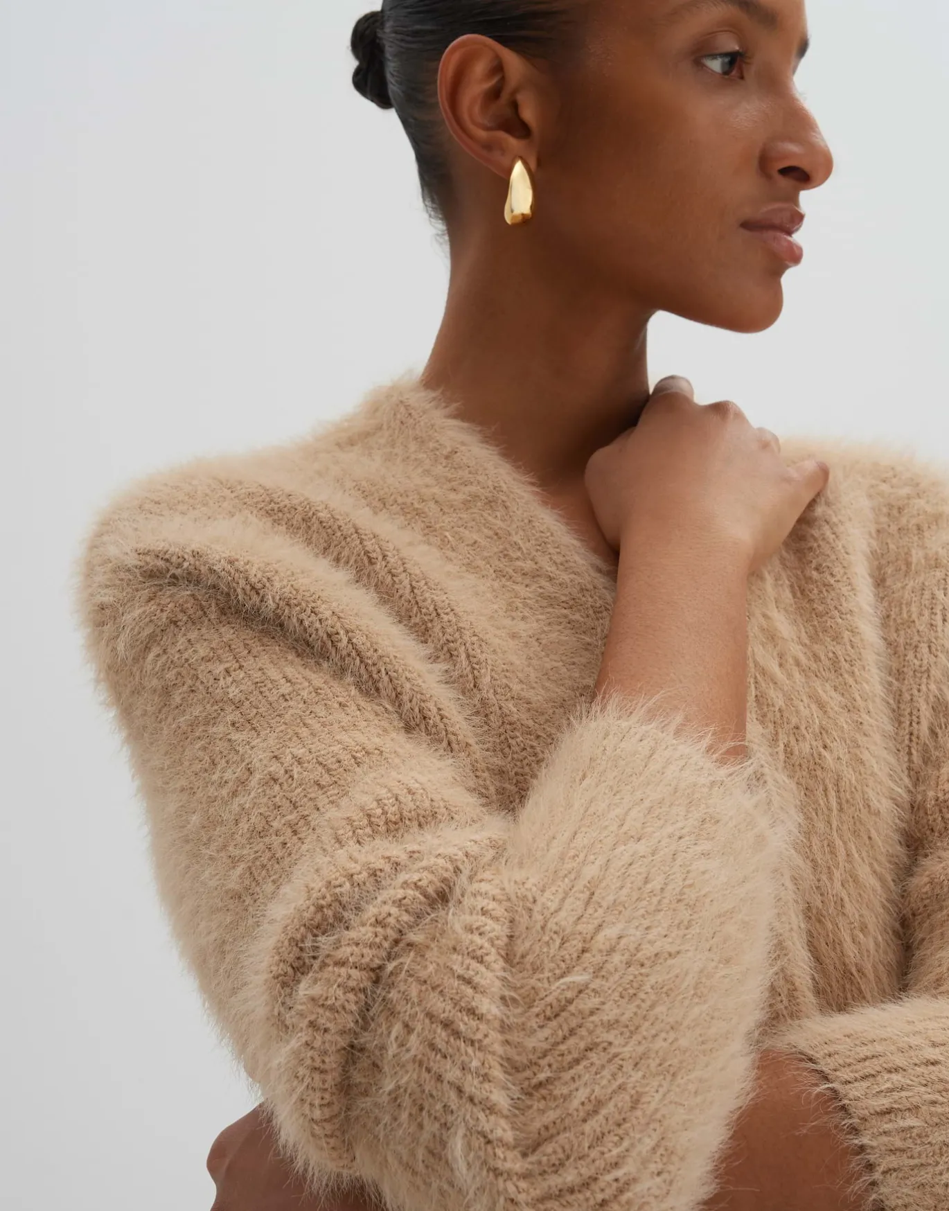 Die Strickjacke ist haarig und flauschig und kann mit oder ohne Unterzieher getragen werden.