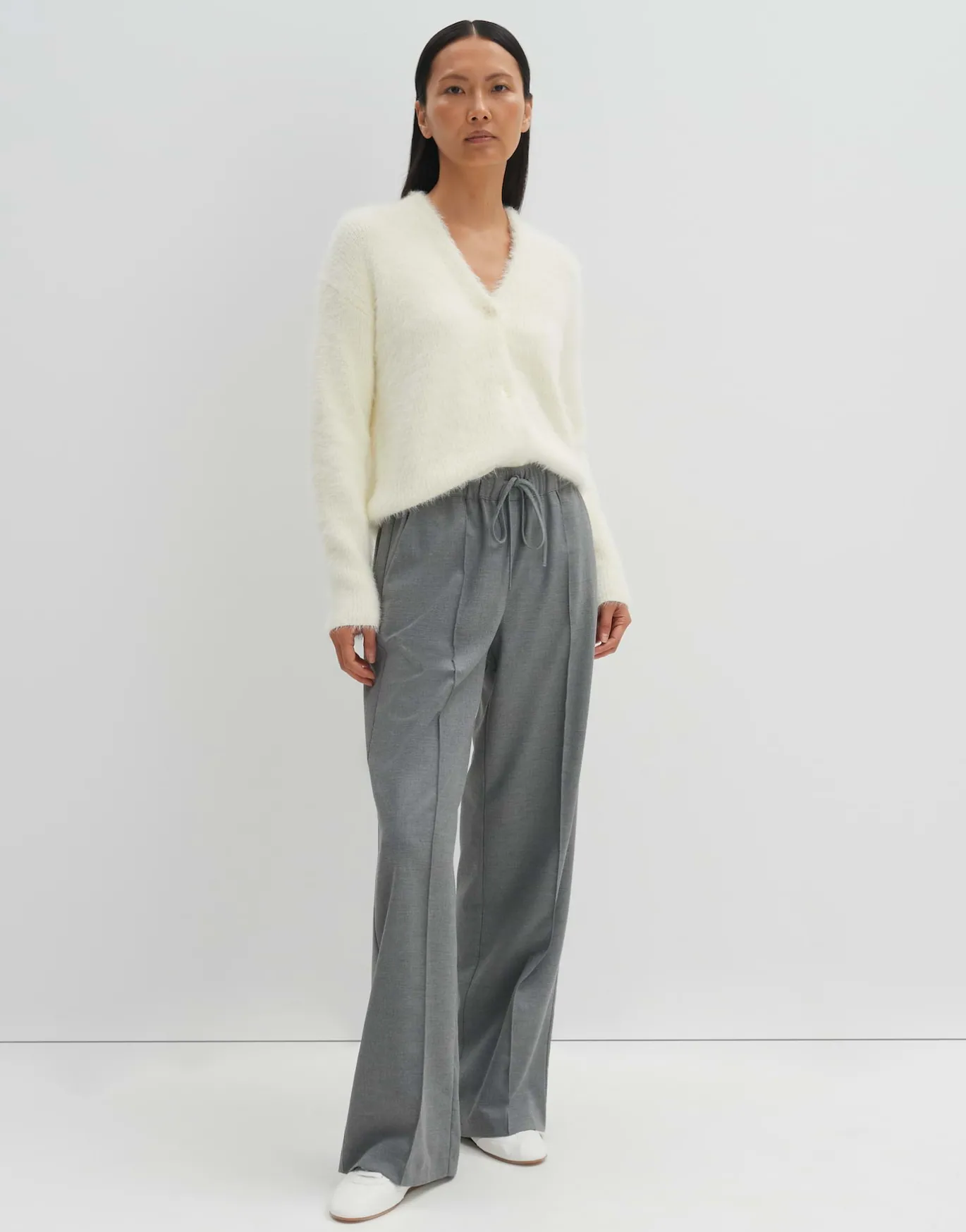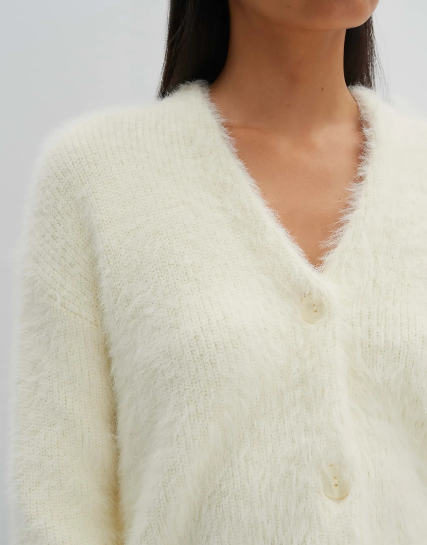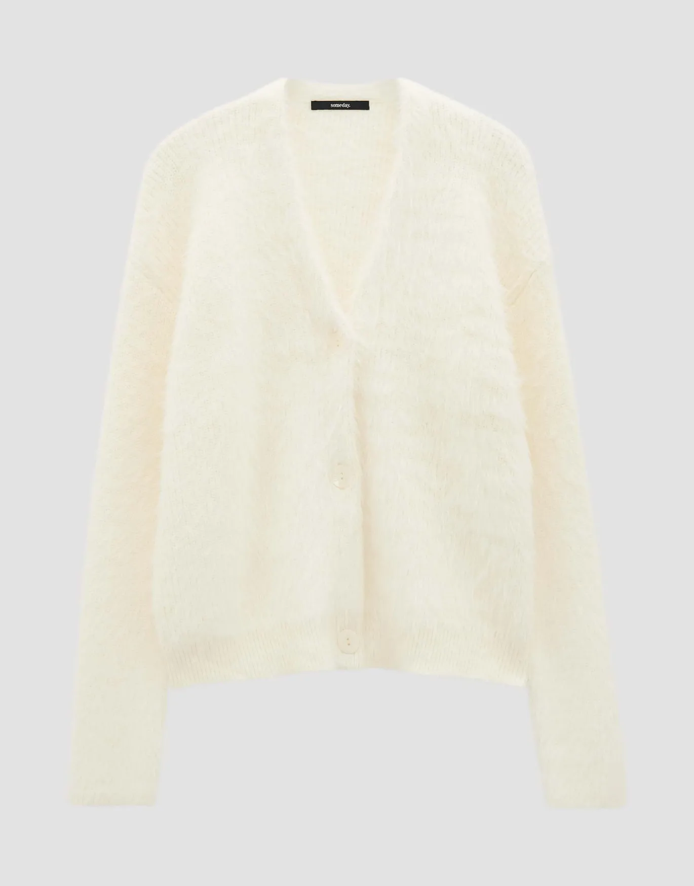 Die Strickjacke ist haarig und flauschig und kann mit oder ohne Unterzieher getragen werden.