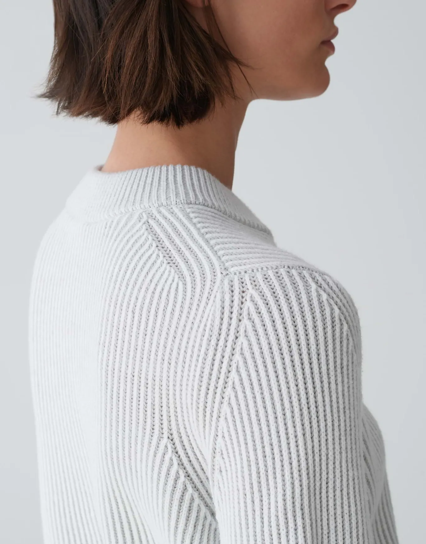 Der Strickpullover verfügt durch die zweifarbige Rippstruktur eine spannende Oberfläche und bringt schöne Akzente in die Looks.