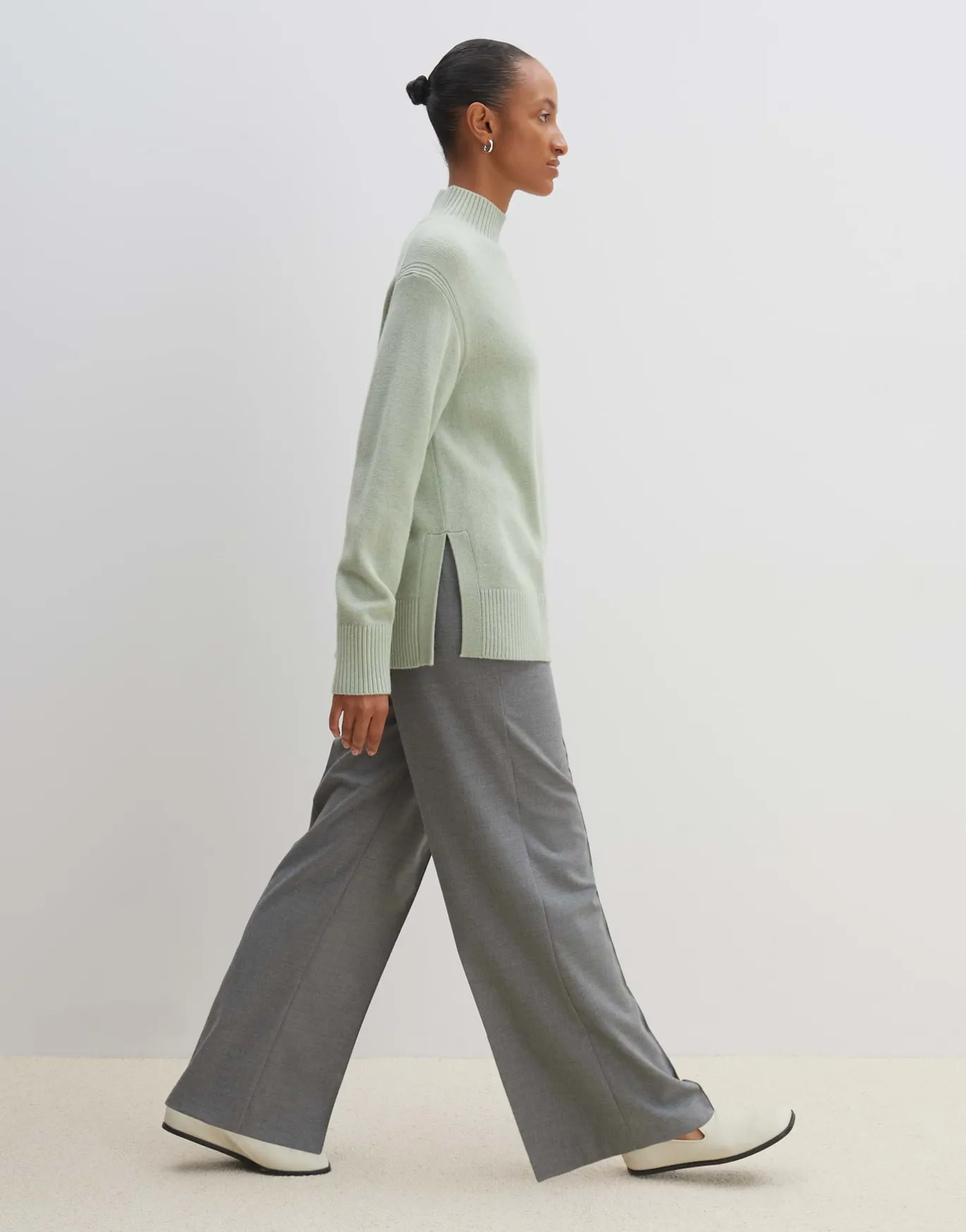 Der Strickpullover ist schlicht gehalten und setzt den Fokus auf den extrem weichen Griff. Kleine Schlitzdetails lockern den Look auf.