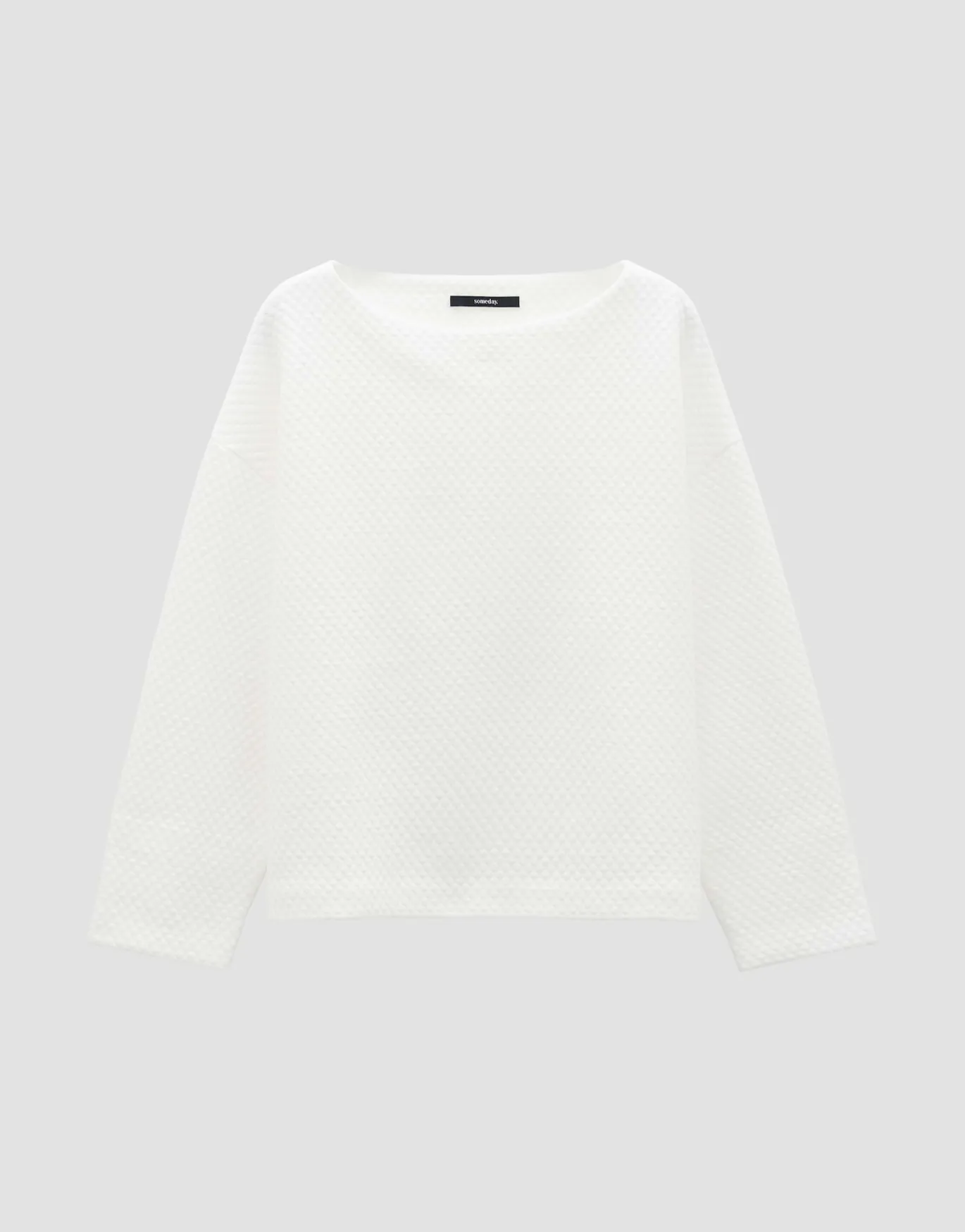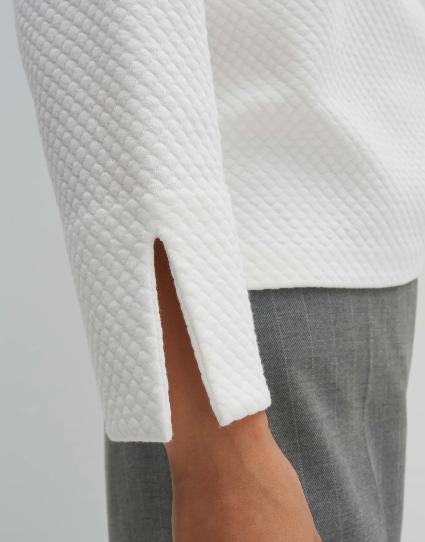 Der Sweater besticht mit dreidimensionaler Punkte Struktur, die mit der moderenen Formgebung harmoniert.
