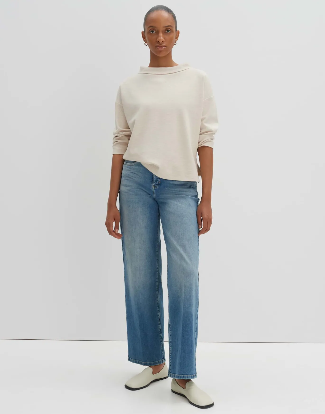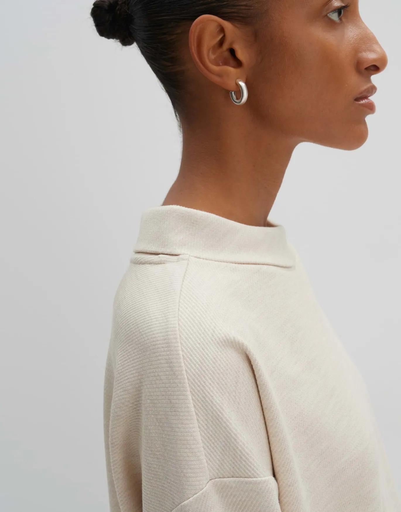 Der Sweater ist puristisch und modern gehalten und setzt den Fokus auf die lässige Passform mit dem elegantem Kragen.