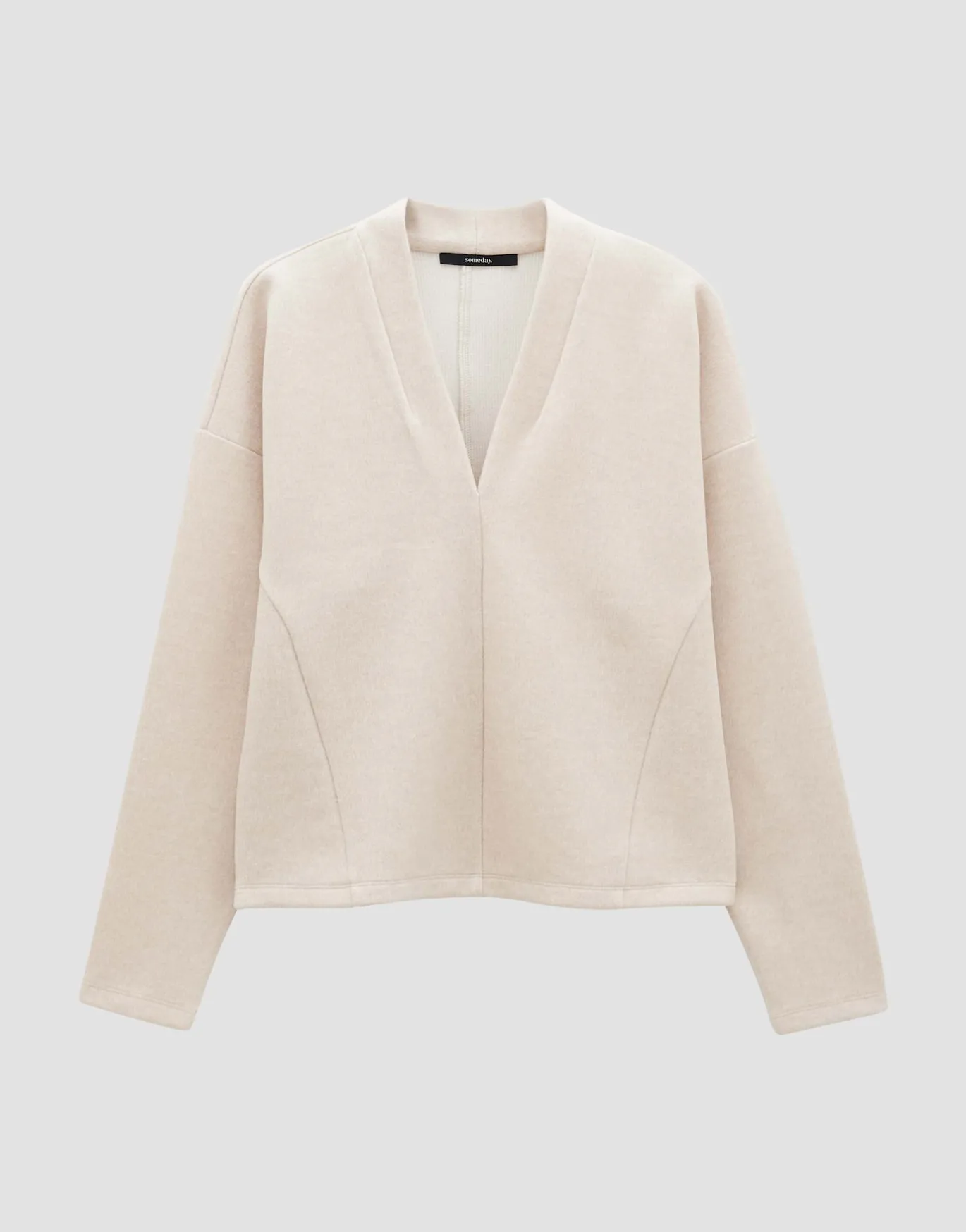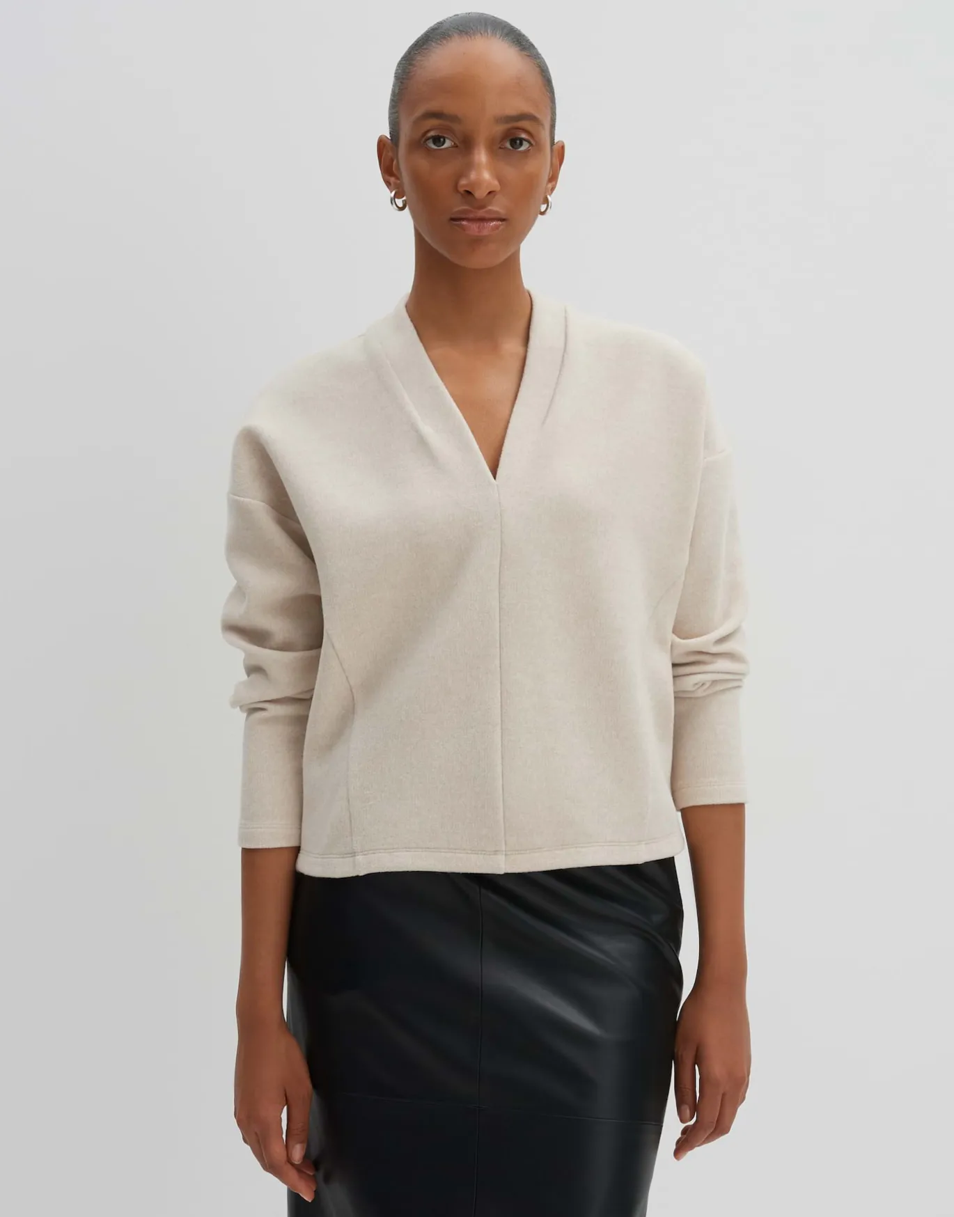 Der Sweater überzeugt mit einem extrem weichen Griff und einer lässigen Passform, die eine feminine Note durch den V-Ausschnitt erhält.