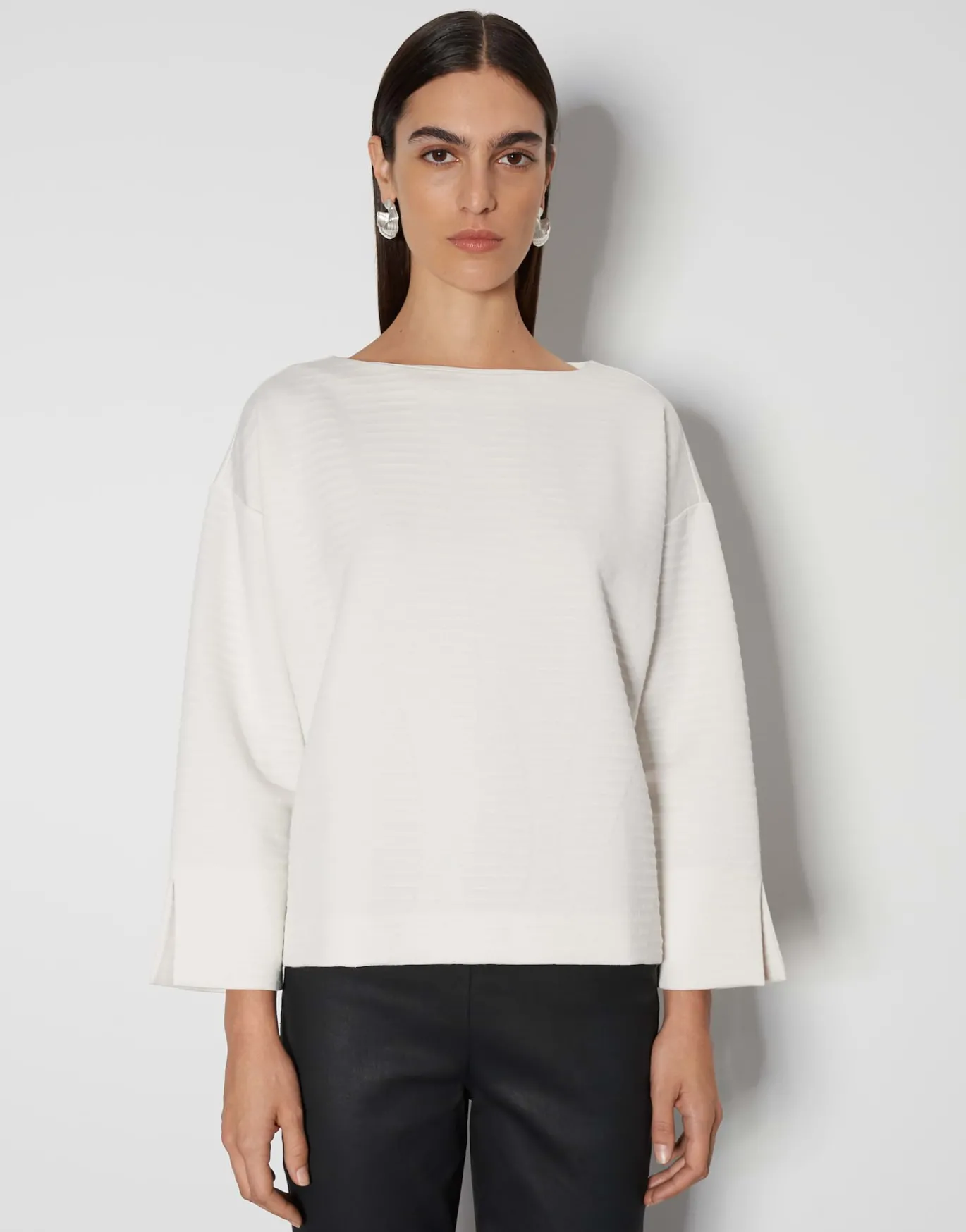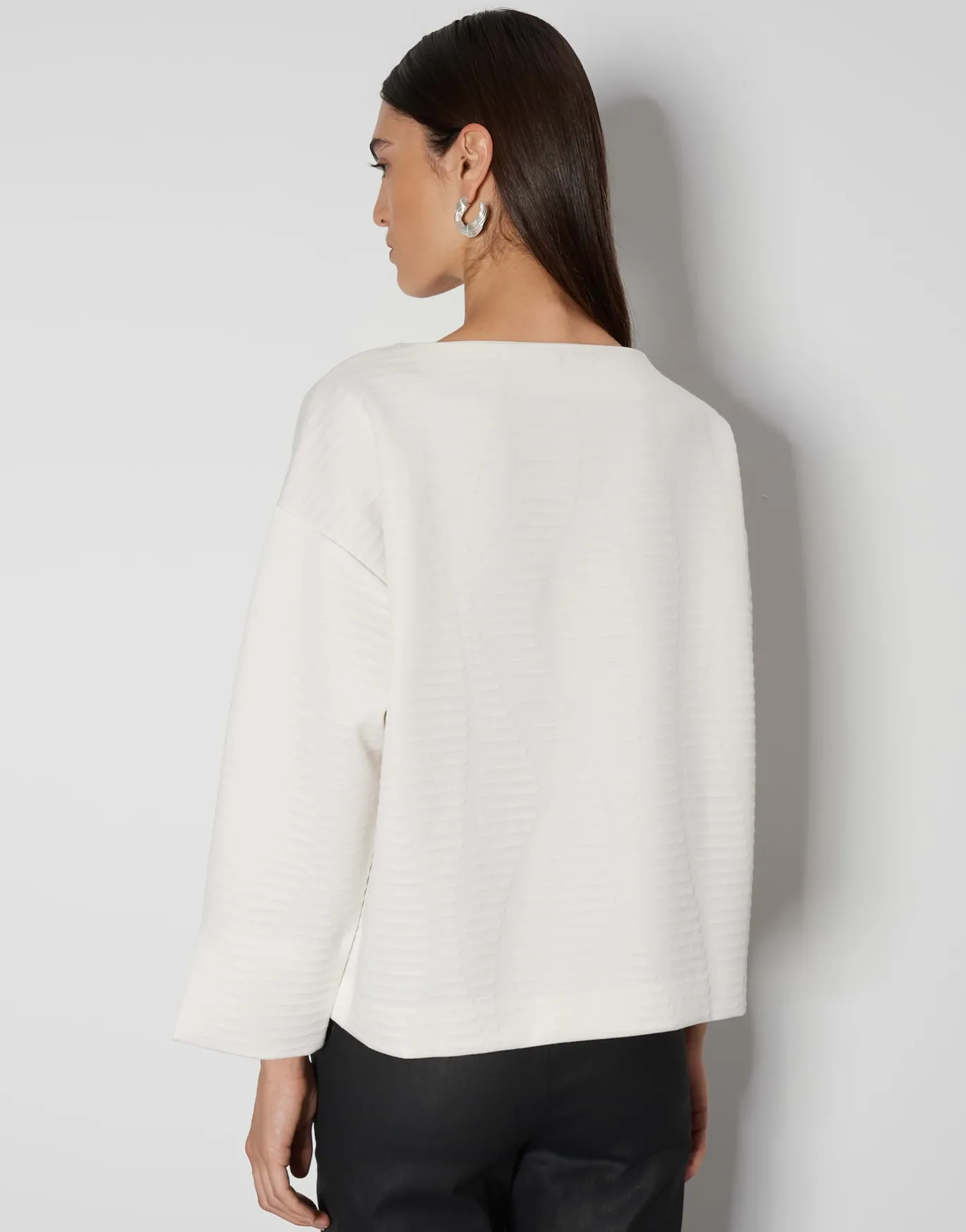 Der Sweater besticht mit einem dicken und dennoch weichem Stoff, der eine dreidimensionale Struktur wie ein tonales Streifenmuster wirken lässt.
