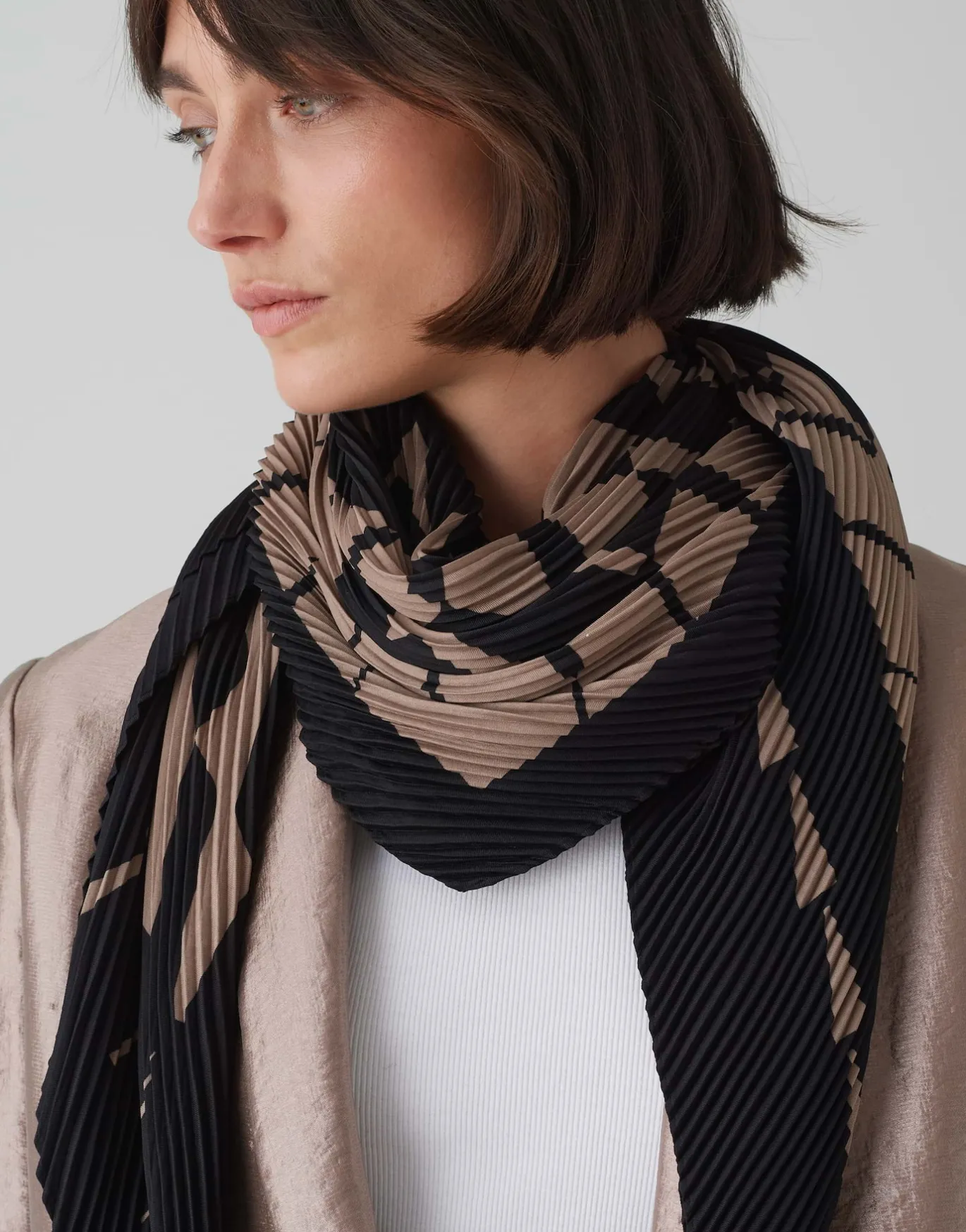 Das Plisseetuch mit einem aufregenden Print setzt schöne Highlights in jedem Look und kann durch die angenehme Größe ganz individuell getragen werden.