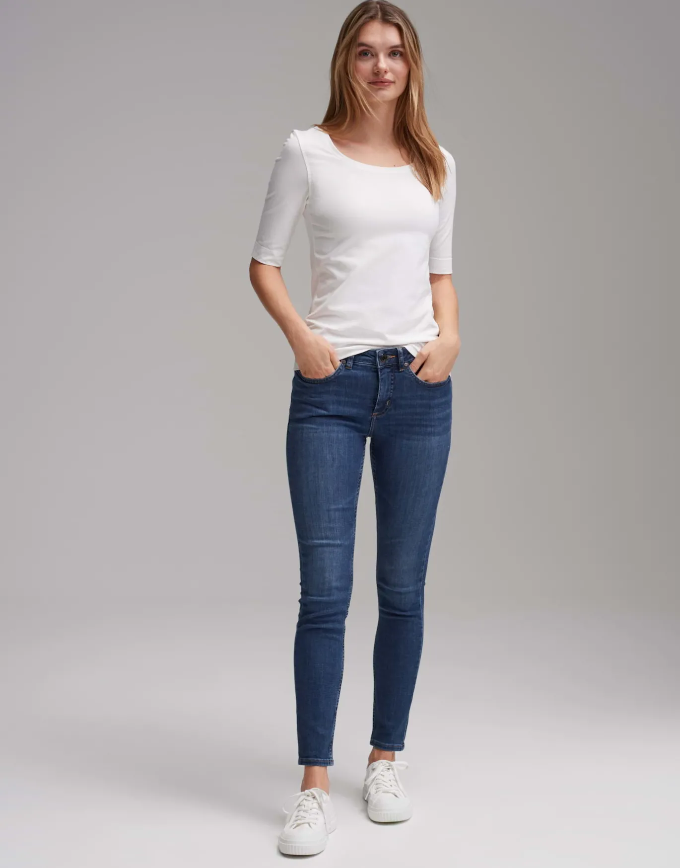 Dieses Shirt kommt in einem Baumwoll-Jersey aus BCI Cotton daher. Durch den Elastananteil schmiegt sich das Shirt nicht nur wunderbar an den Körper an, sondern behält auch dauerhaft seine schmale Form. Der leicht verlängerte T-Shirt Ärmel und der feminine Rundhalsausschnitt runden das Basic optimal ab.
