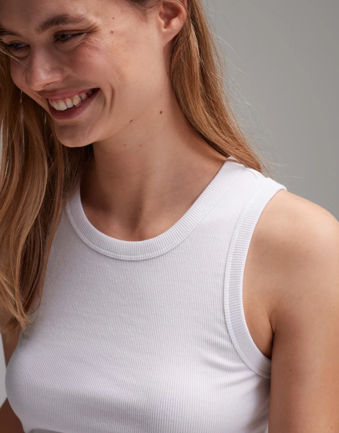 Das Tanktop ist ein vielfältiger Klassiker. Typisch sind die feine Rippe, der breite Träger und die figurbetonte Form.