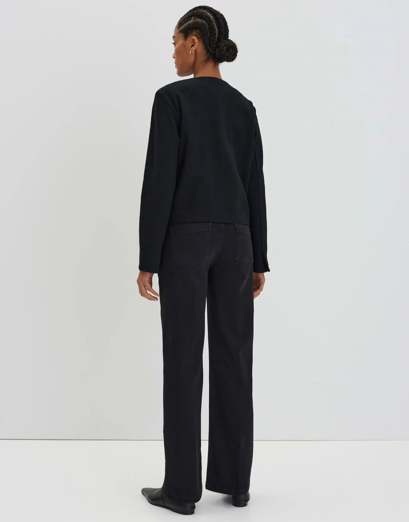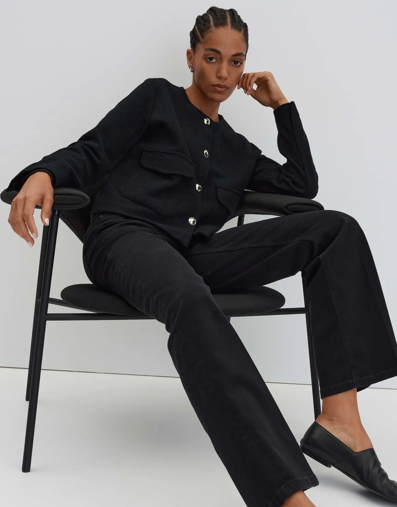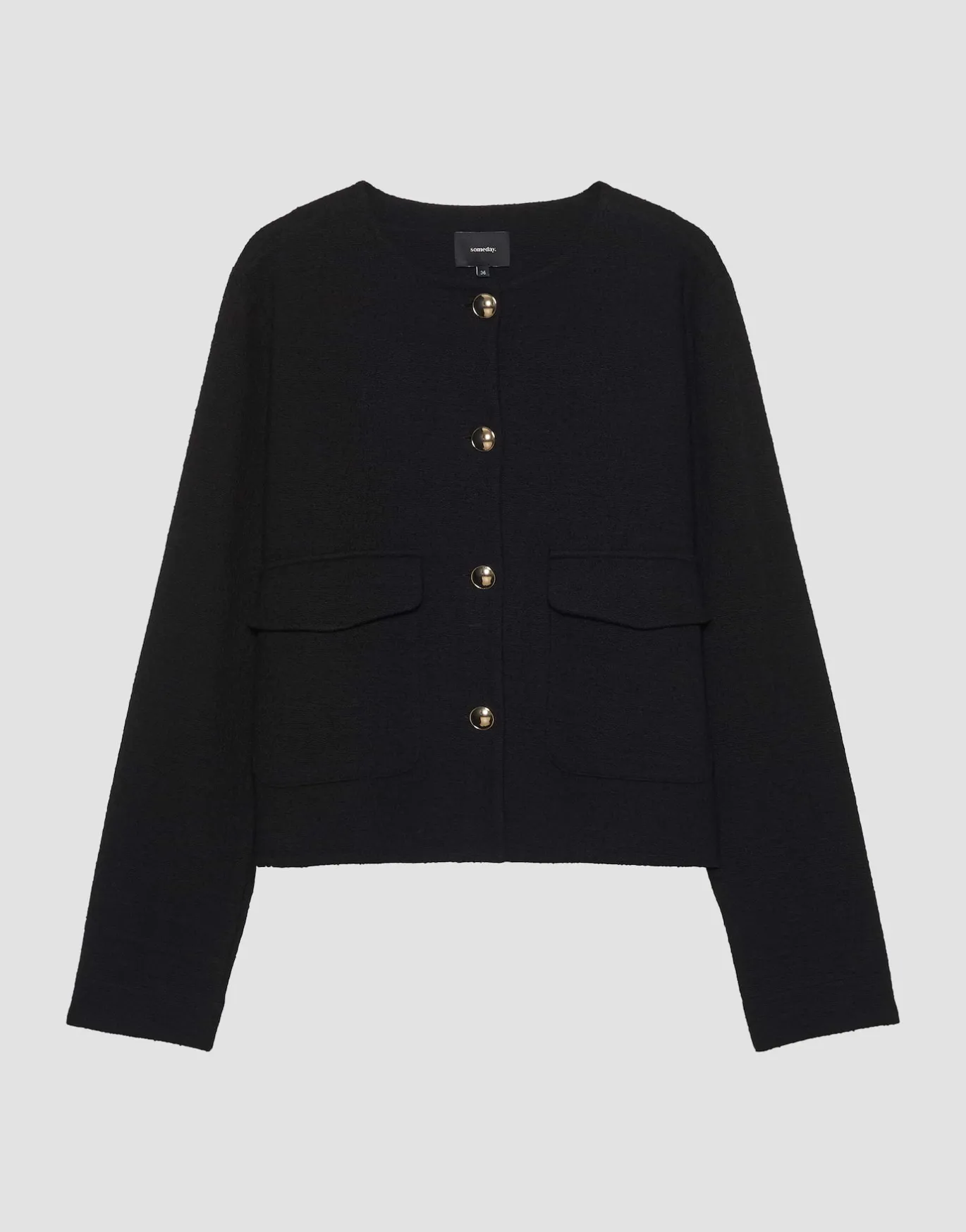 Die Blazerjacke in dünner Bouclé-Ware ist mit den metallische Knöpfen ein eleganter Hingucker. Die Front zieren zwei große Klappentaschen. Die Passform ist weit und kurz gehalten.