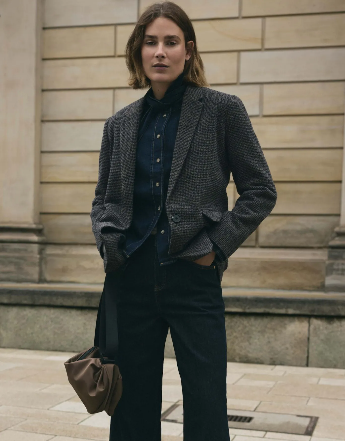 Der Blazer spielt ein klassisches Hahnentritt Muster auf einer soften, wolligen Oberfläche und erhält sein modisches Update durch die lässige Passform.
