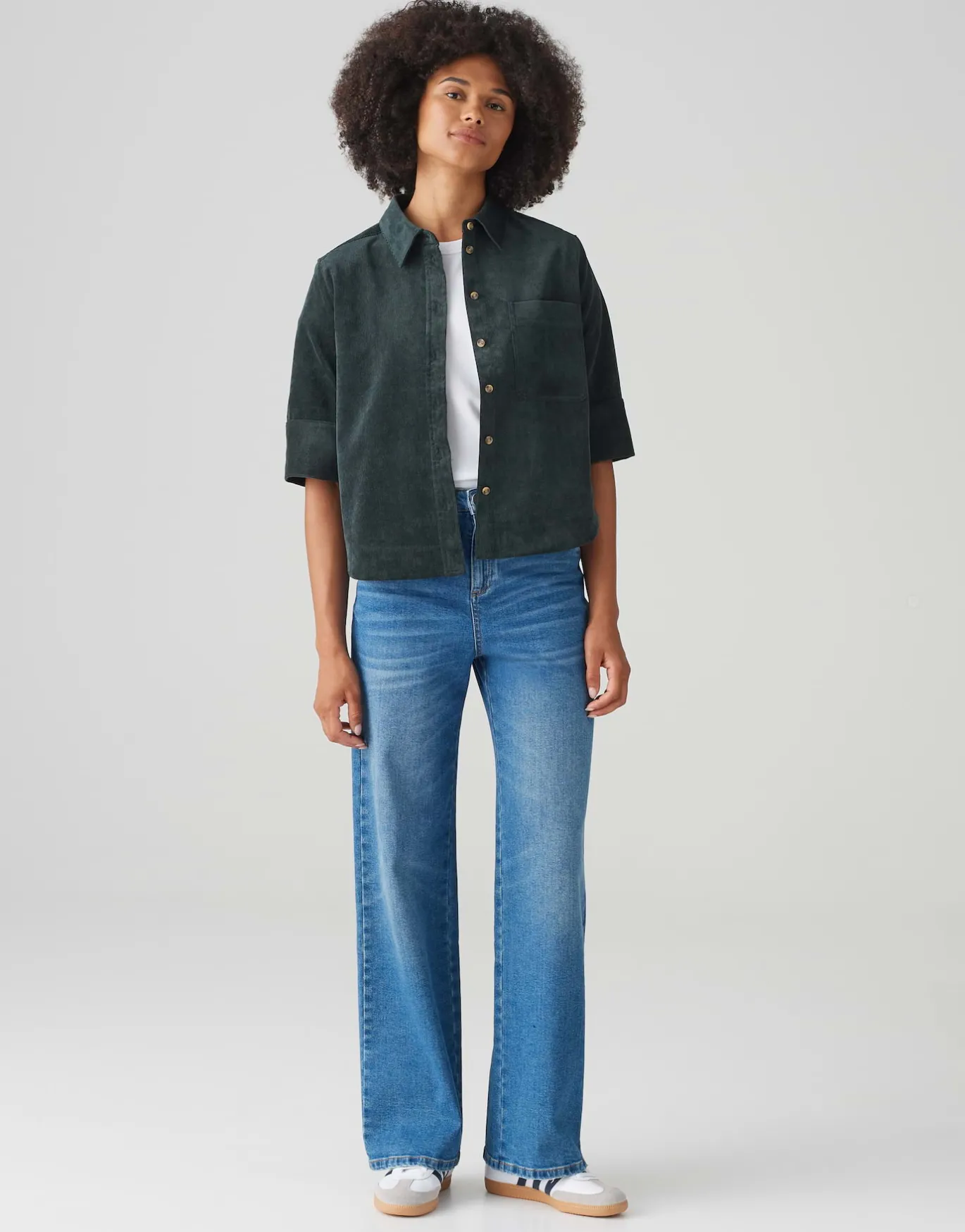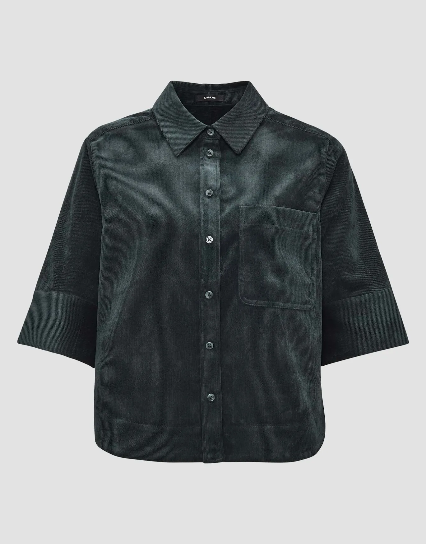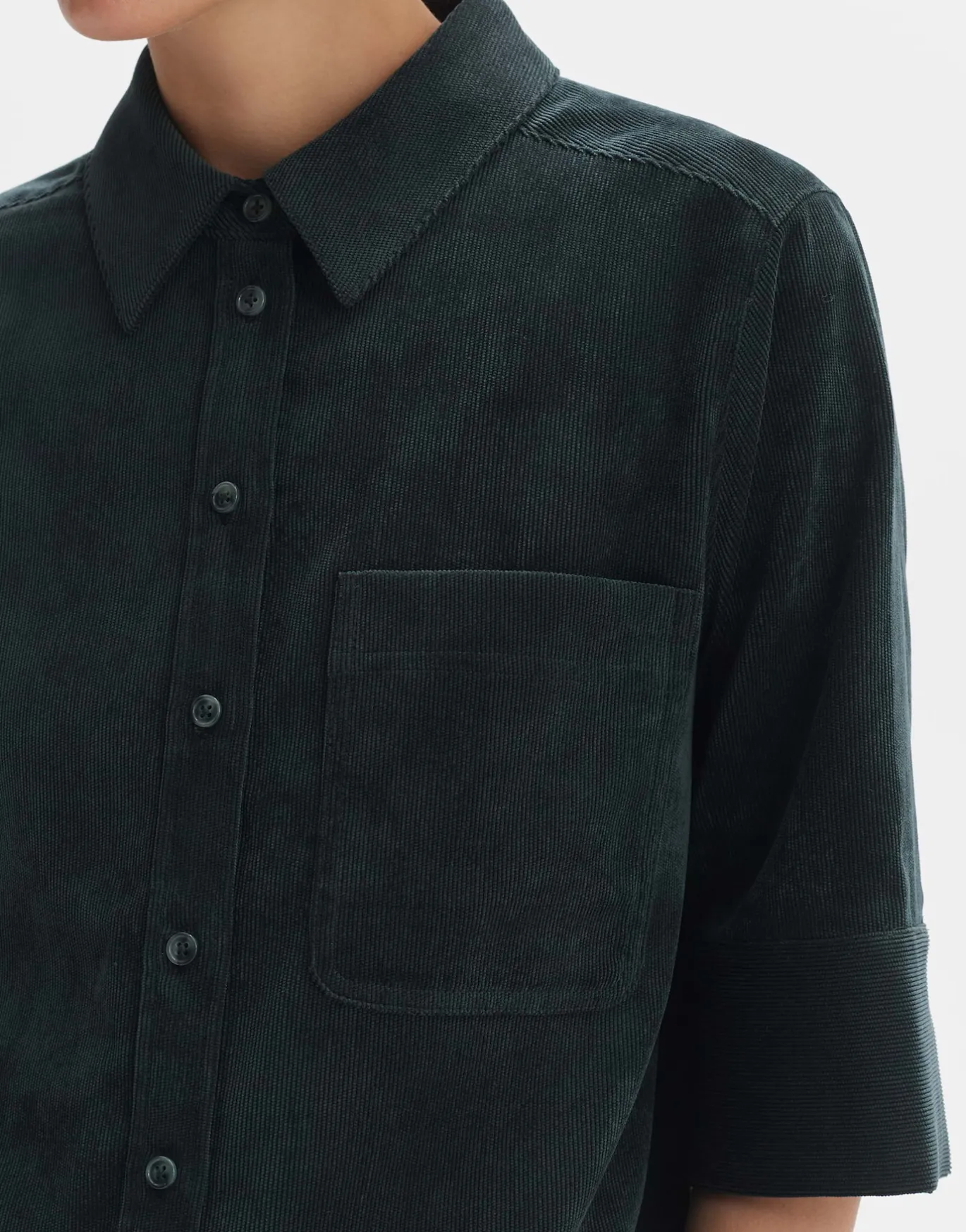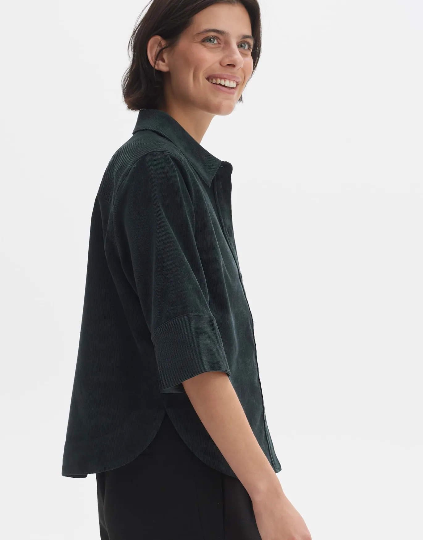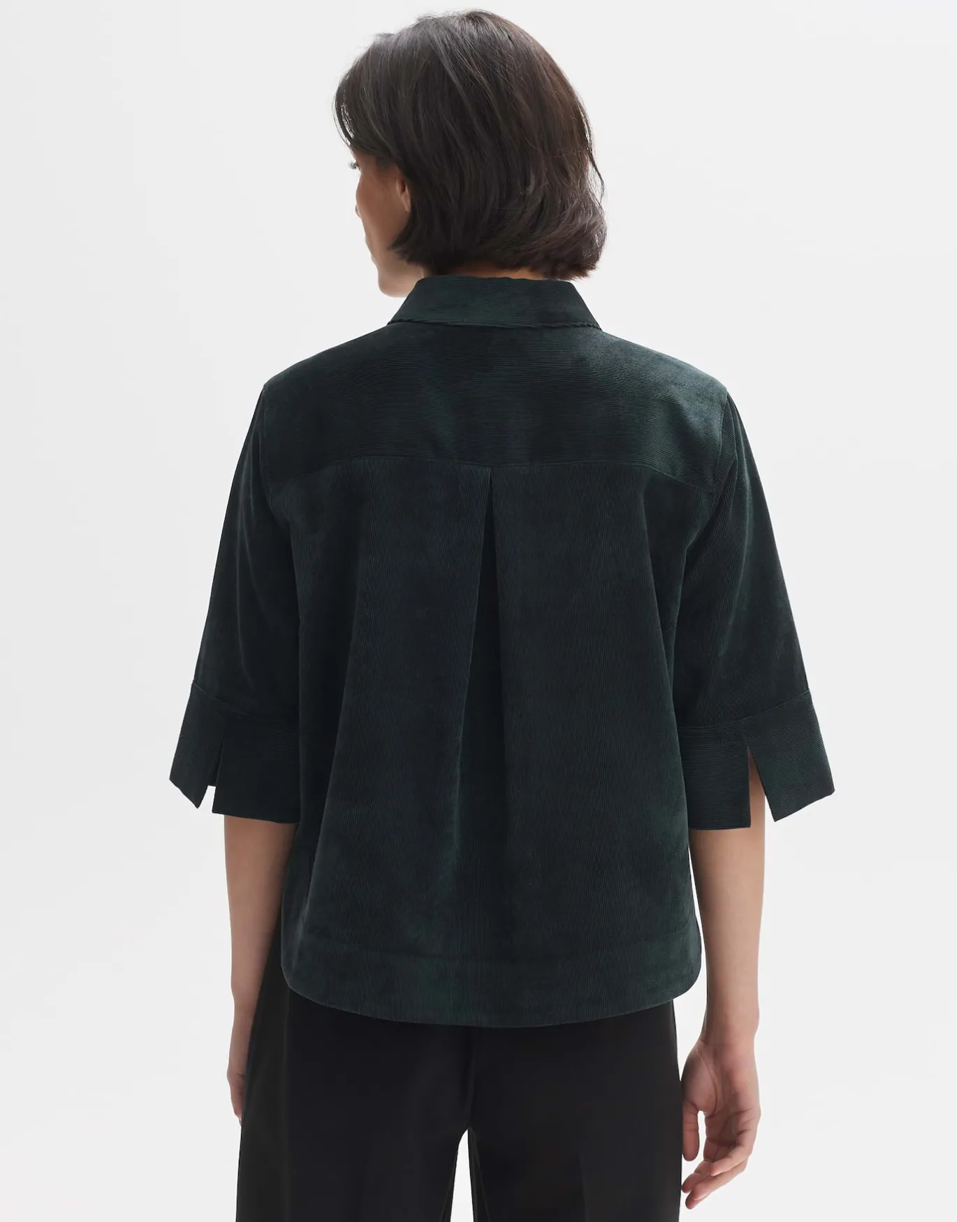 Die Hemdbluse spielt samtigen Feincord auf eine moderne Silhouette, die durch eine Kellerfalte im Rücken für schöne Weite sorgt.