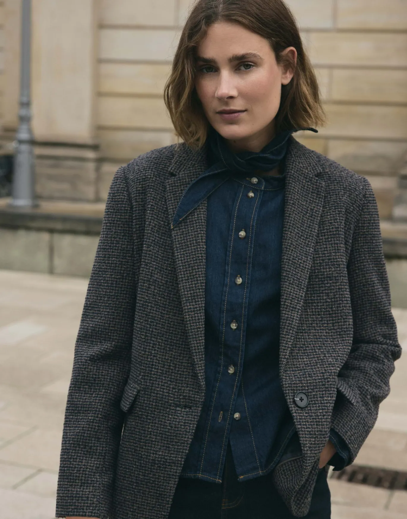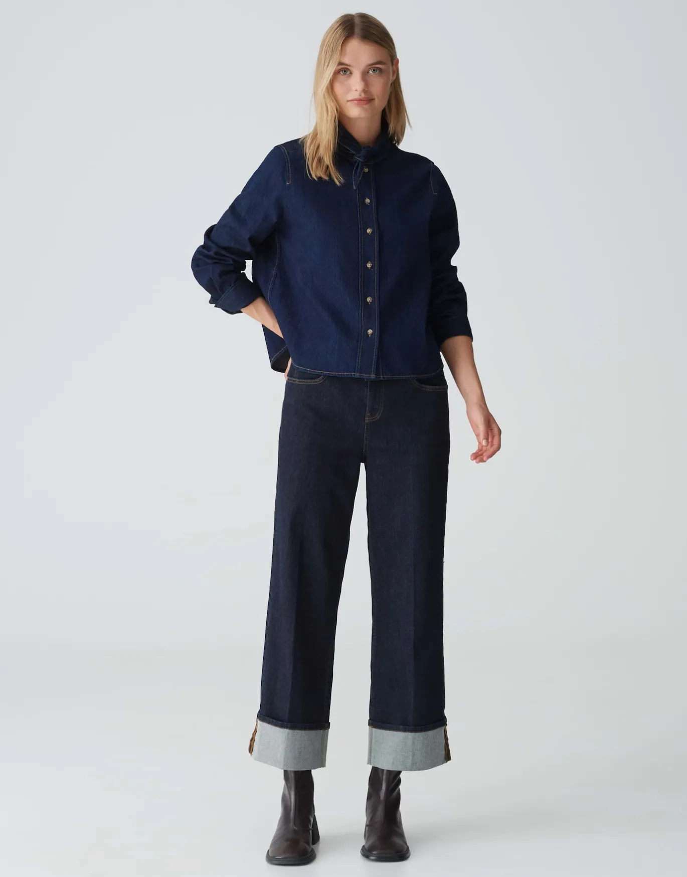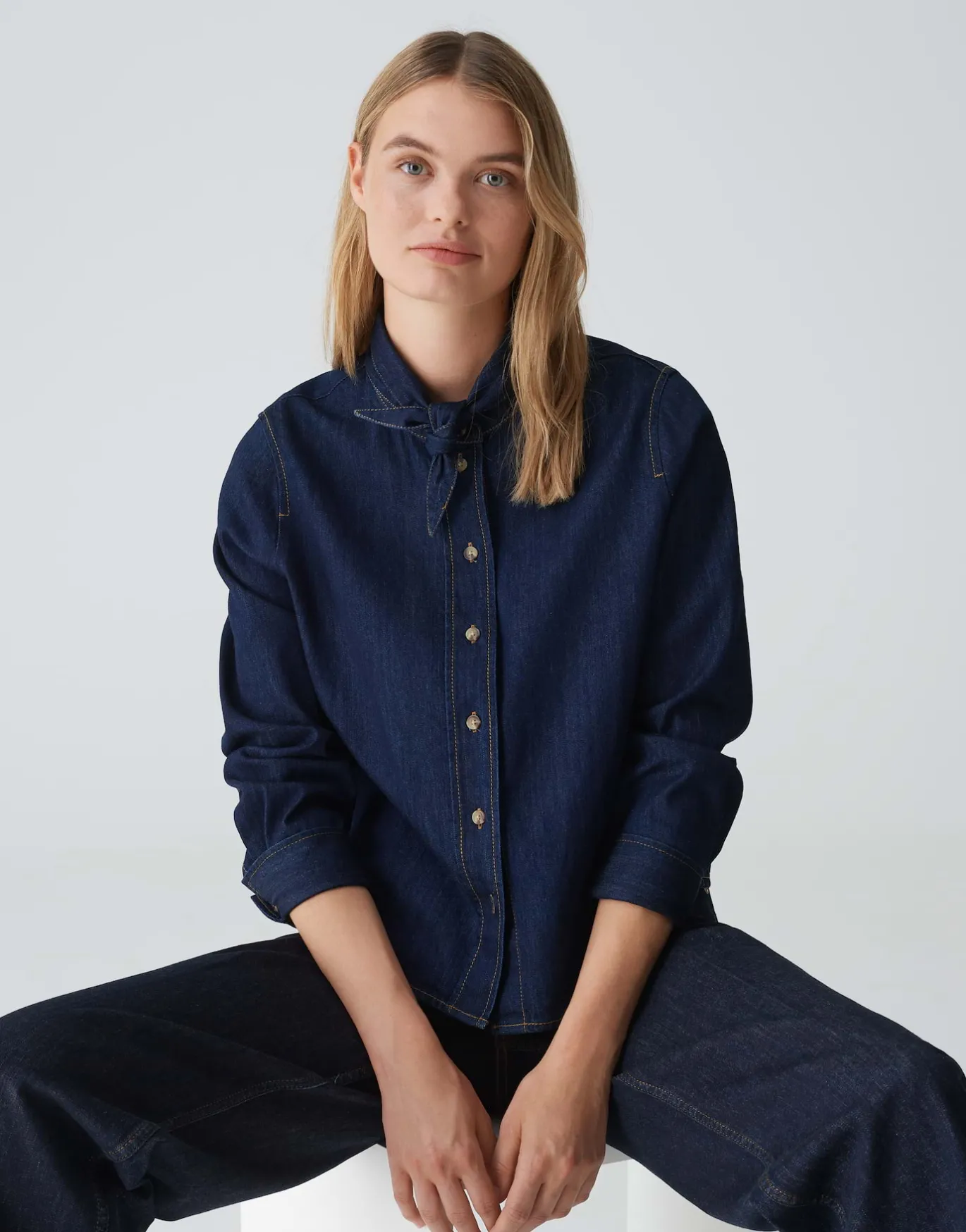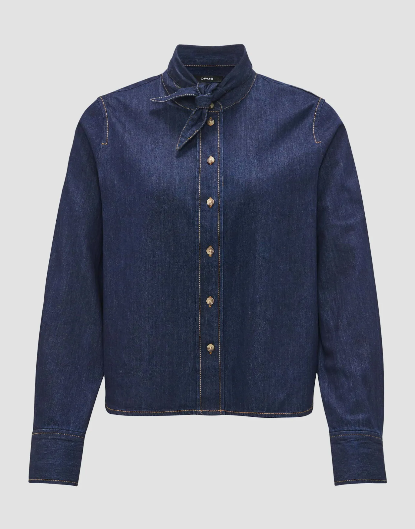 Die Jeansbluse in moderner Rinsed Waschung erinnert durch das satte Dunkelblau an rustikalen Chic und bietet durch die abnehmbare Schluppe am Kragen viele Stylingmöglichkeiten.